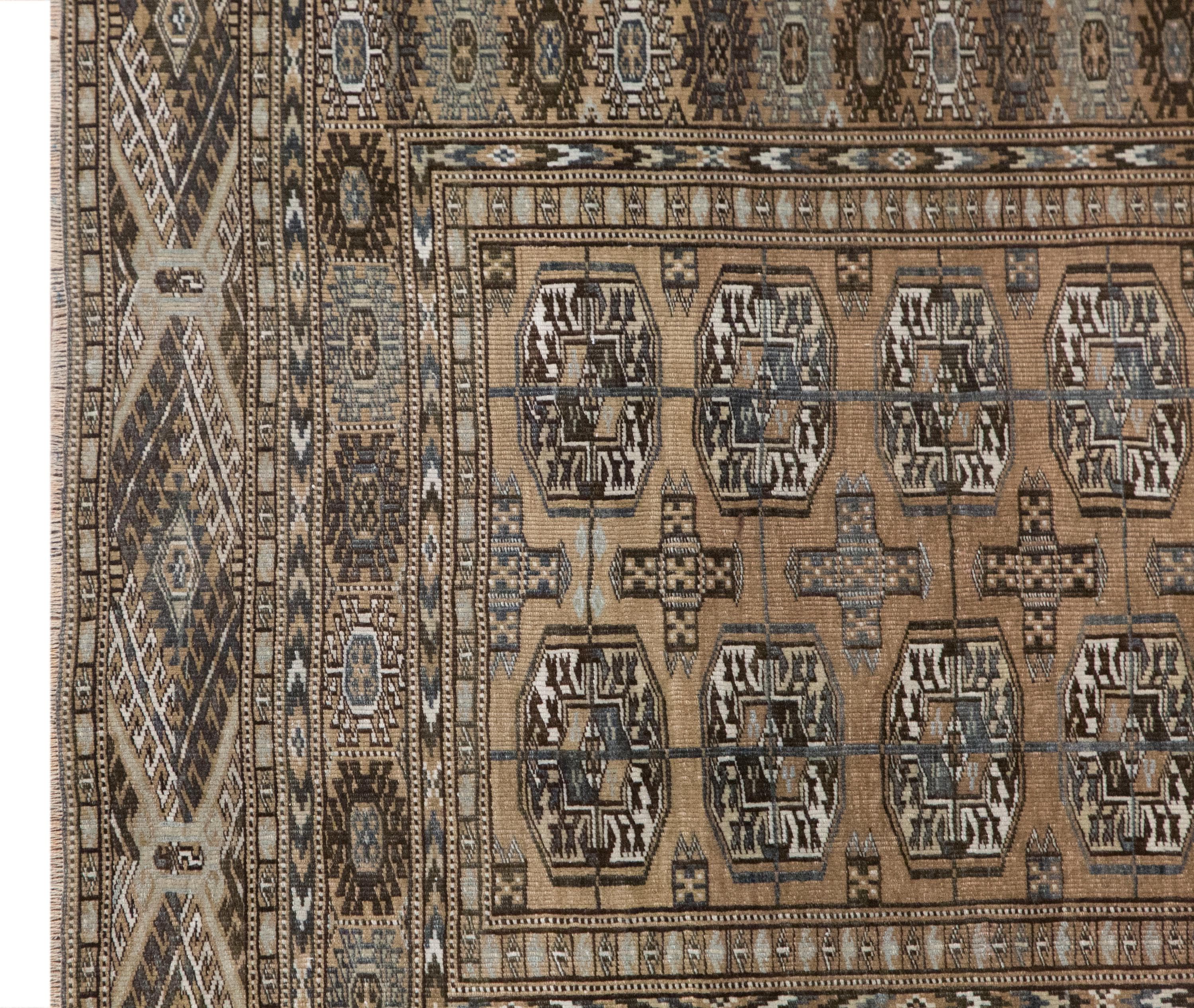 This handwoven vintage Turkish Oushak rug is a beautiful and elegant mid-size piece, carrying the authentic craftsmanship and heritage of approximately 60+ years. Its softly aged, naturally faded tones and balanced bohemian composition reflect traditional Turkish and Caucasian influences, making it a timeless decorative accent for both modern and classic interiors.