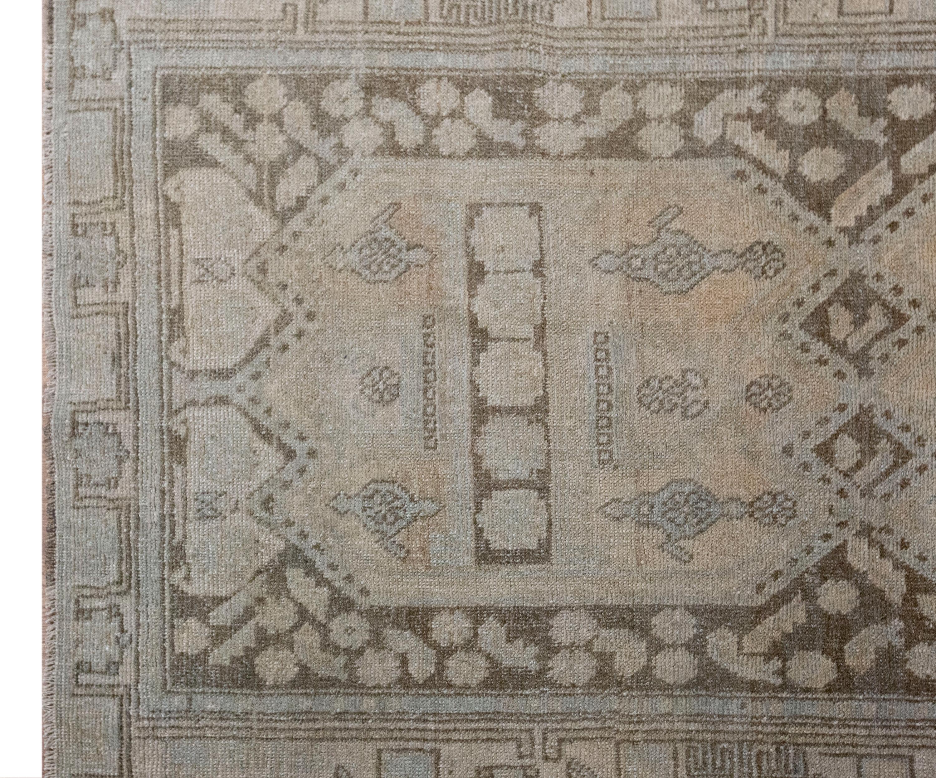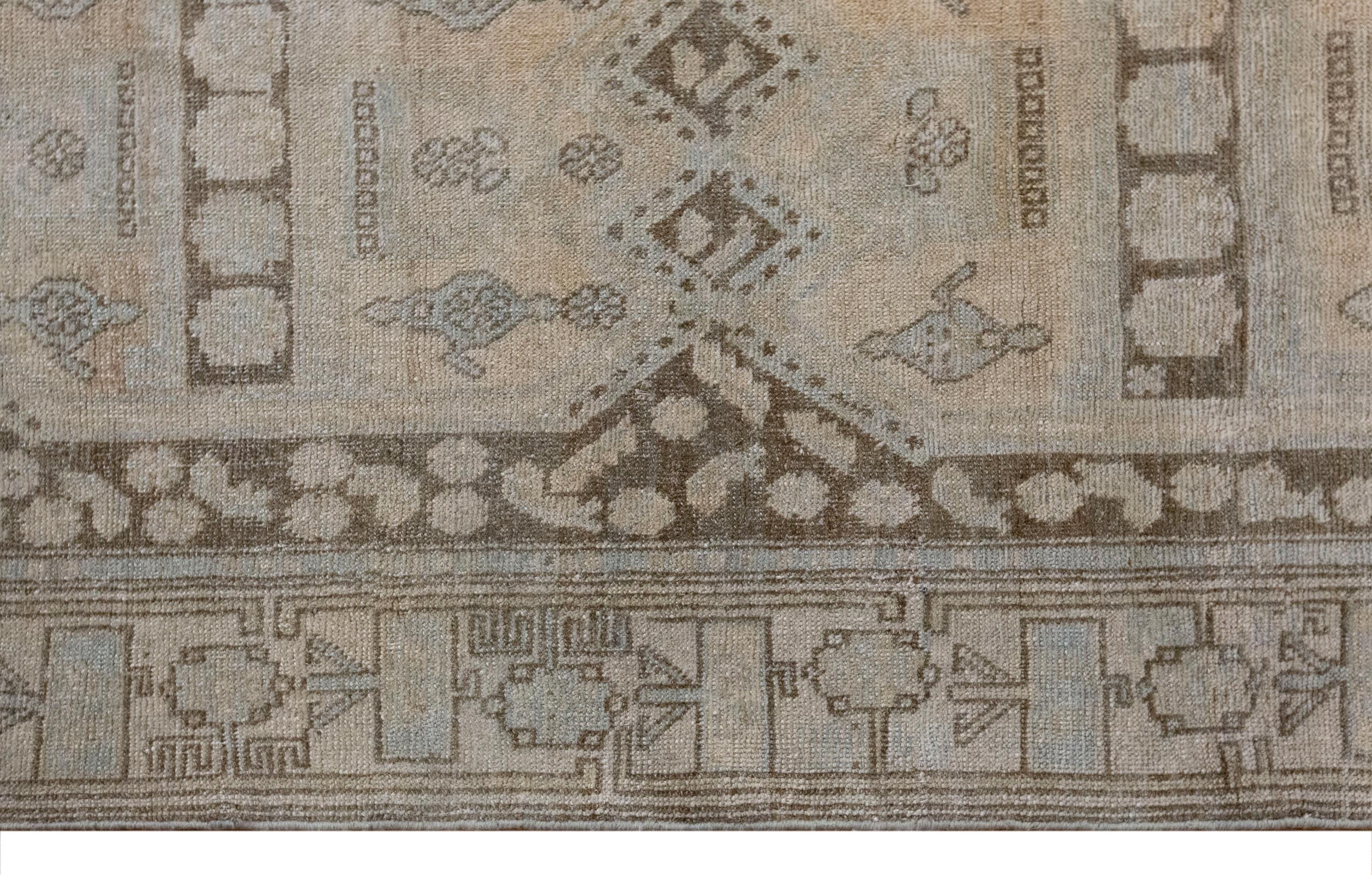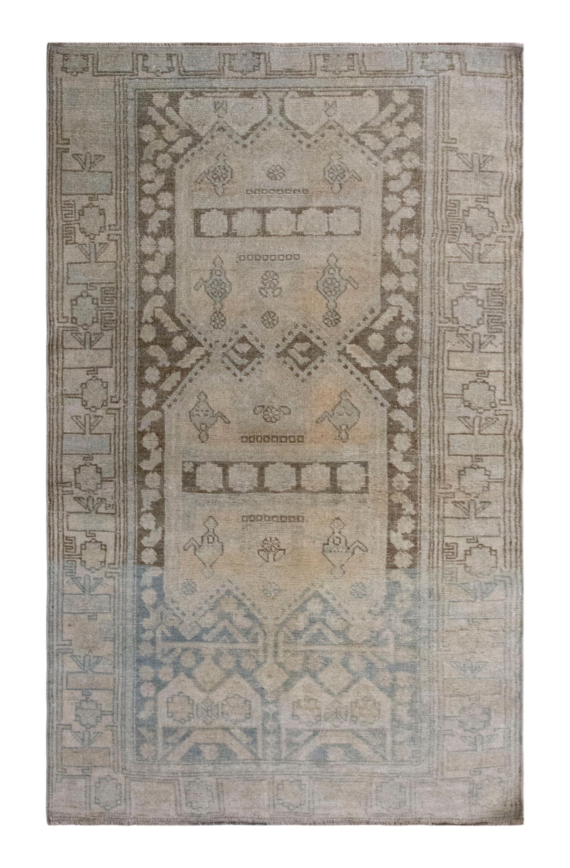 This 60-year-old handwoven Turkish wool rug embodies timeless elegance with its soft, muted palette and intricate geometric motifs. The central design features delicate medallions framed by floral-inspired borders, symbolizing harmony and continuity. Subtle shades of beige, ivory, and faded blue bring a serene, calming atmosphere — the natural wear over decades adding character and authenticity.