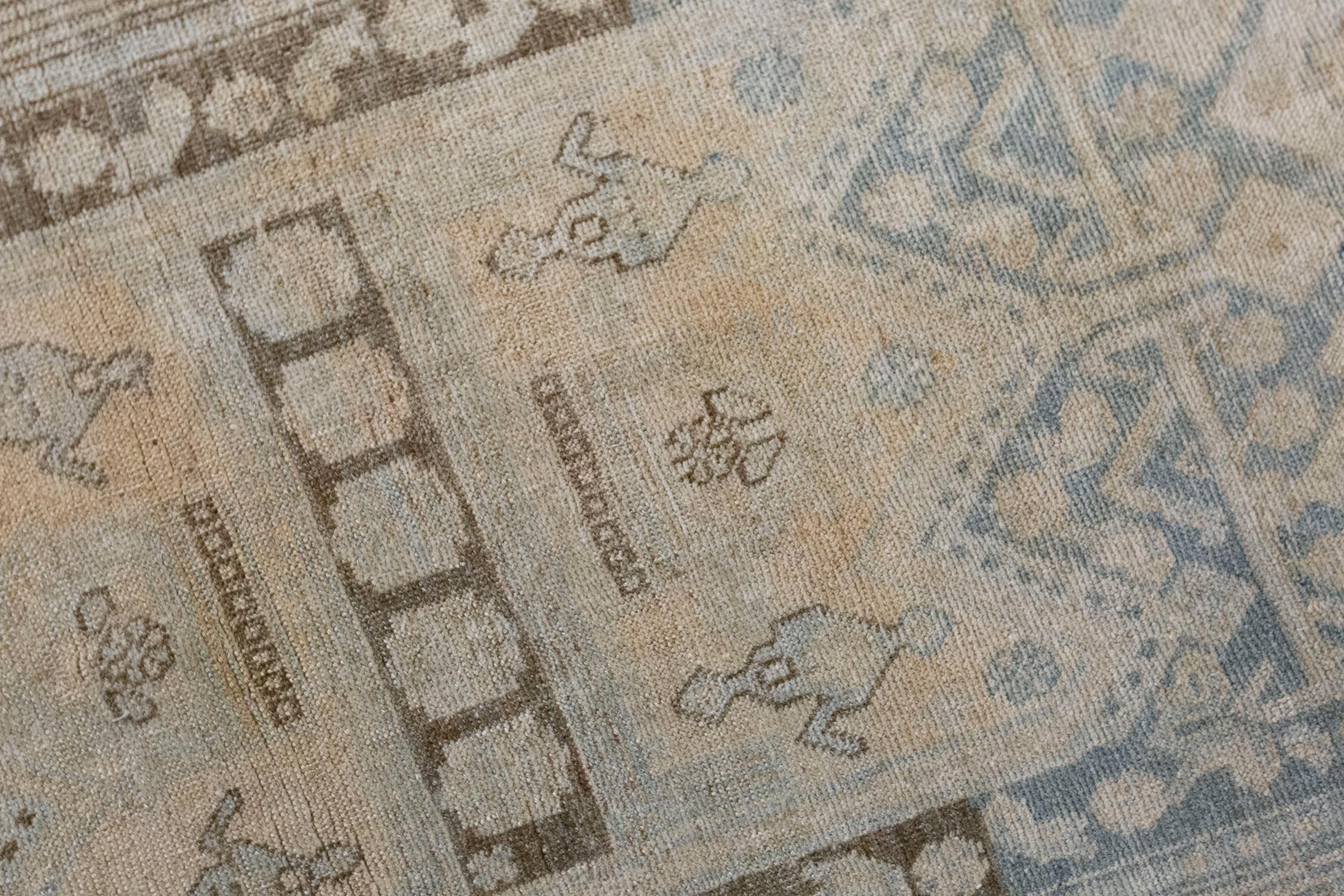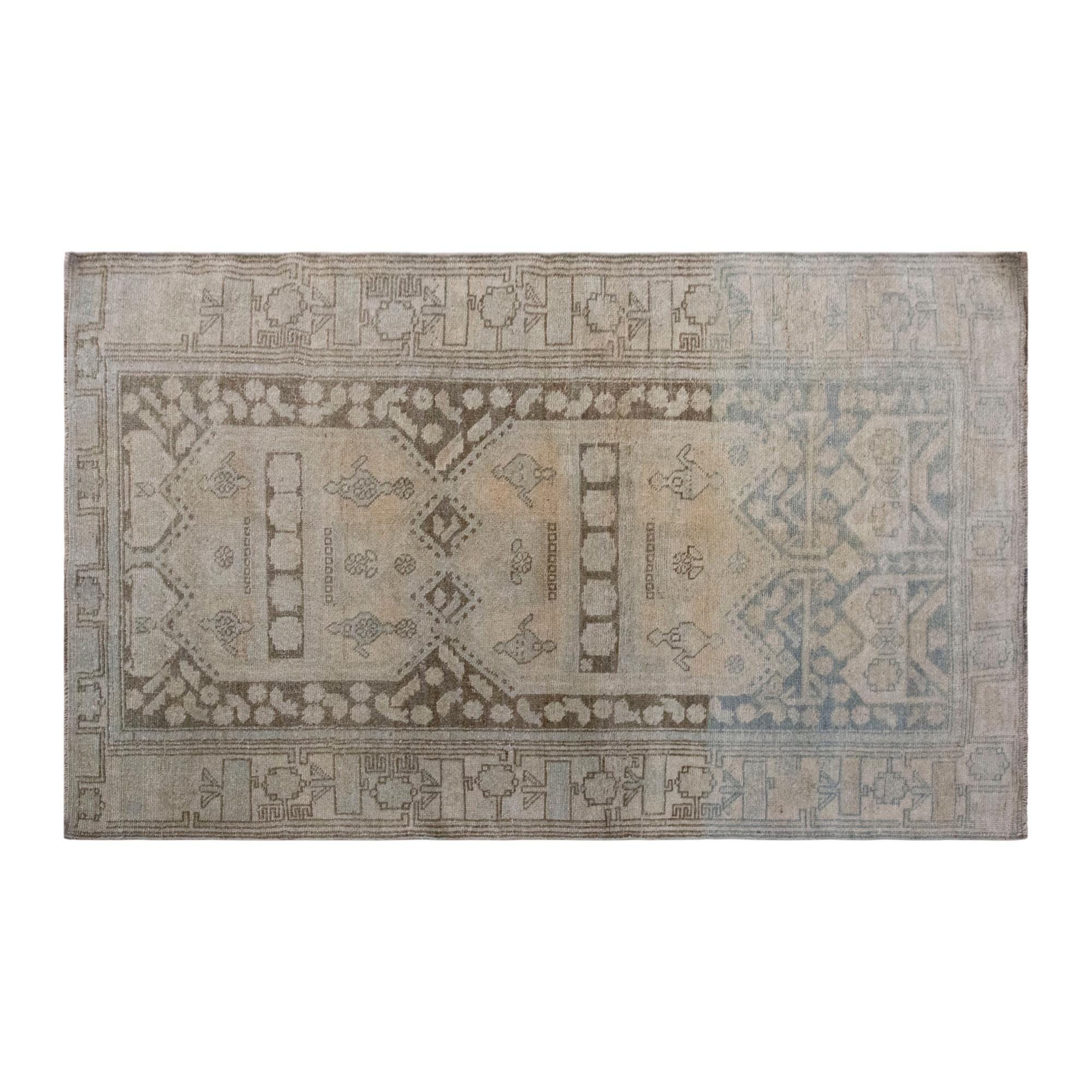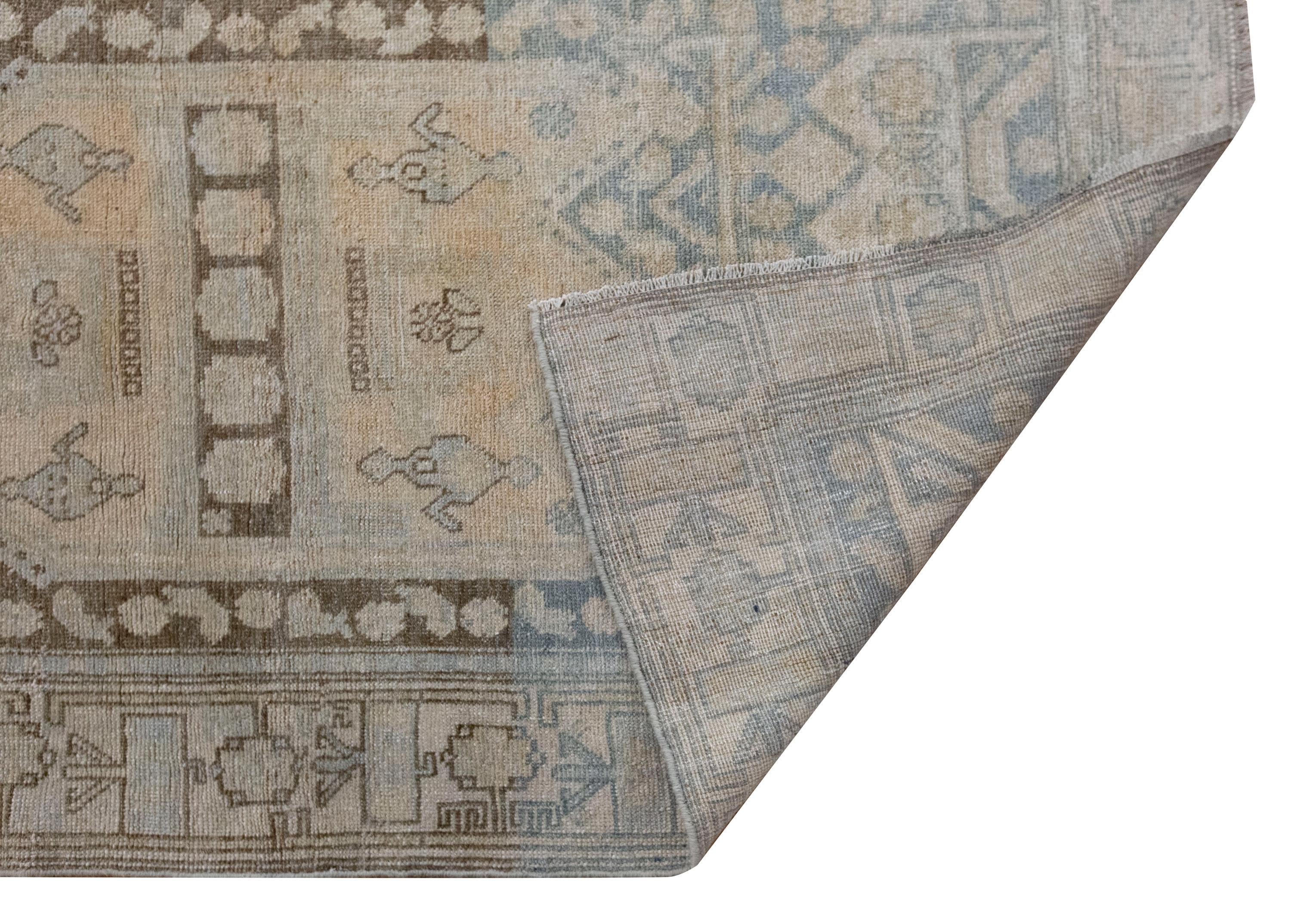 This 60-year-old handwoven Turkish wool rug embodies timeless elegance with its soft, muted palette and intricate geometric motifs. The central design features delicate medallions framed by floral-inspired borders, symbolizing harmony and continuity. Subtle shades of beige, ivory, and faded blue bring a serene, calming atmosphere — the natural wear over decades adding character and authenticity.
