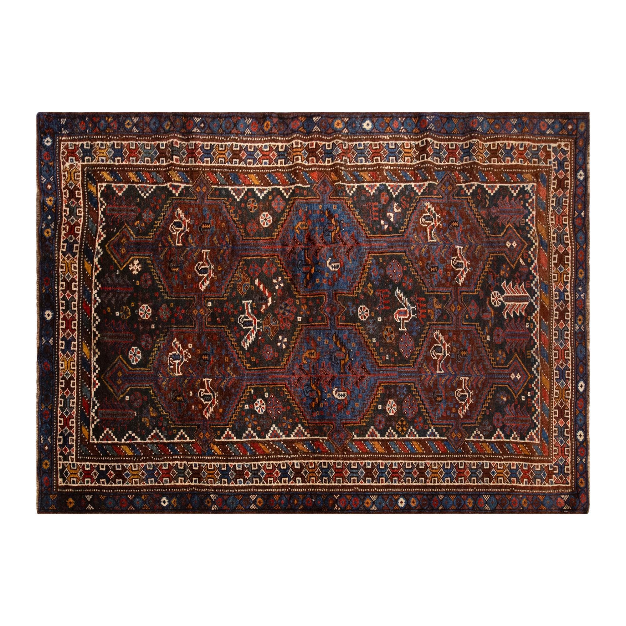 This 60-year-old handwoven Turkish wool rug reflects the richness of Anatolian tribal artistry with its bold hexagonal medallions and symbolic motifs. The dark brown and deep blue background is decorated with ivory, terracotta, and red accents, creating a striking yet balanced composition. Playful small animal and geometric figures woven into the design symbolize fertility, protection, and harmony, making this rug not just a decorative piece but a cultural story woven into every knot.