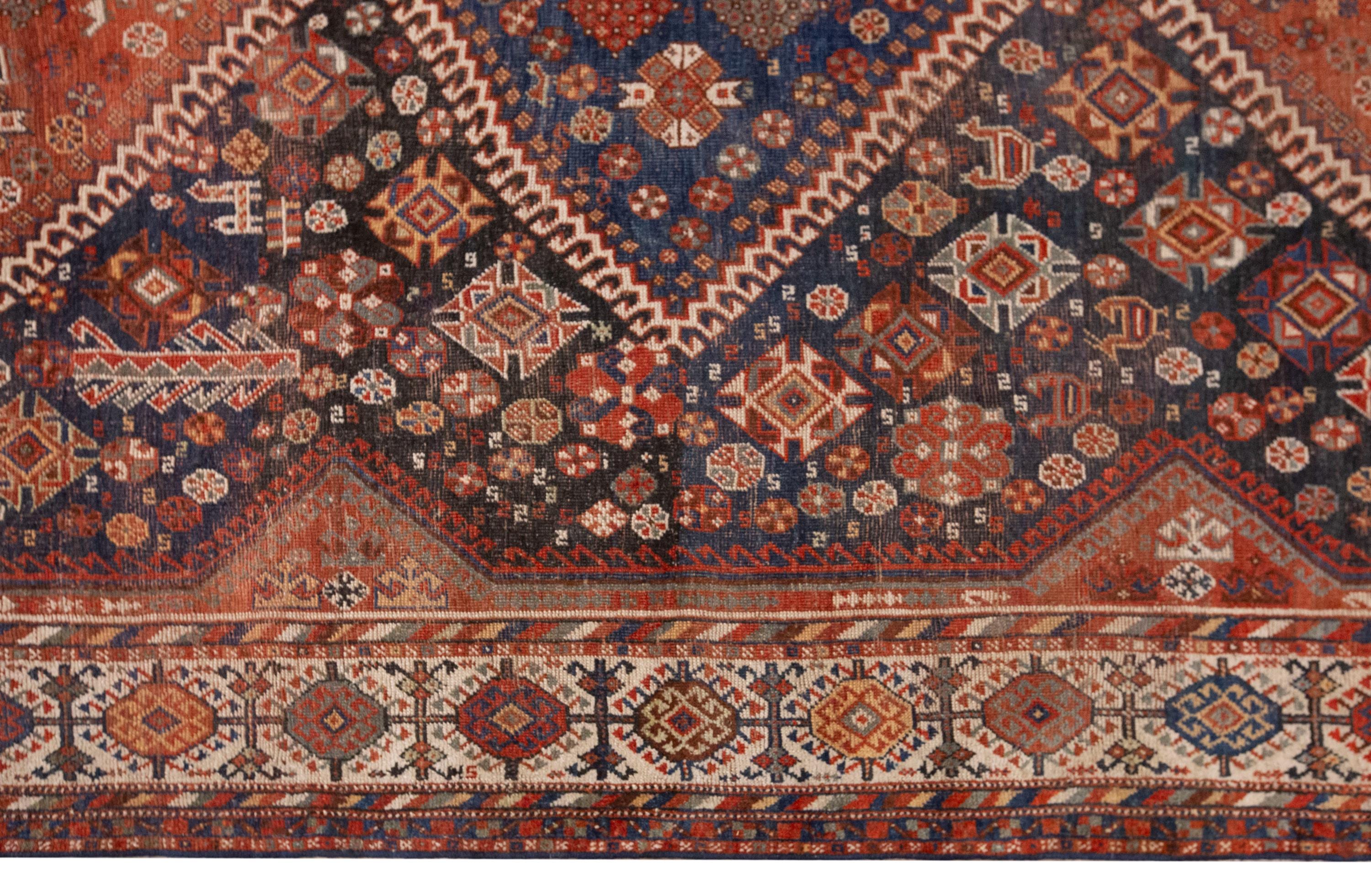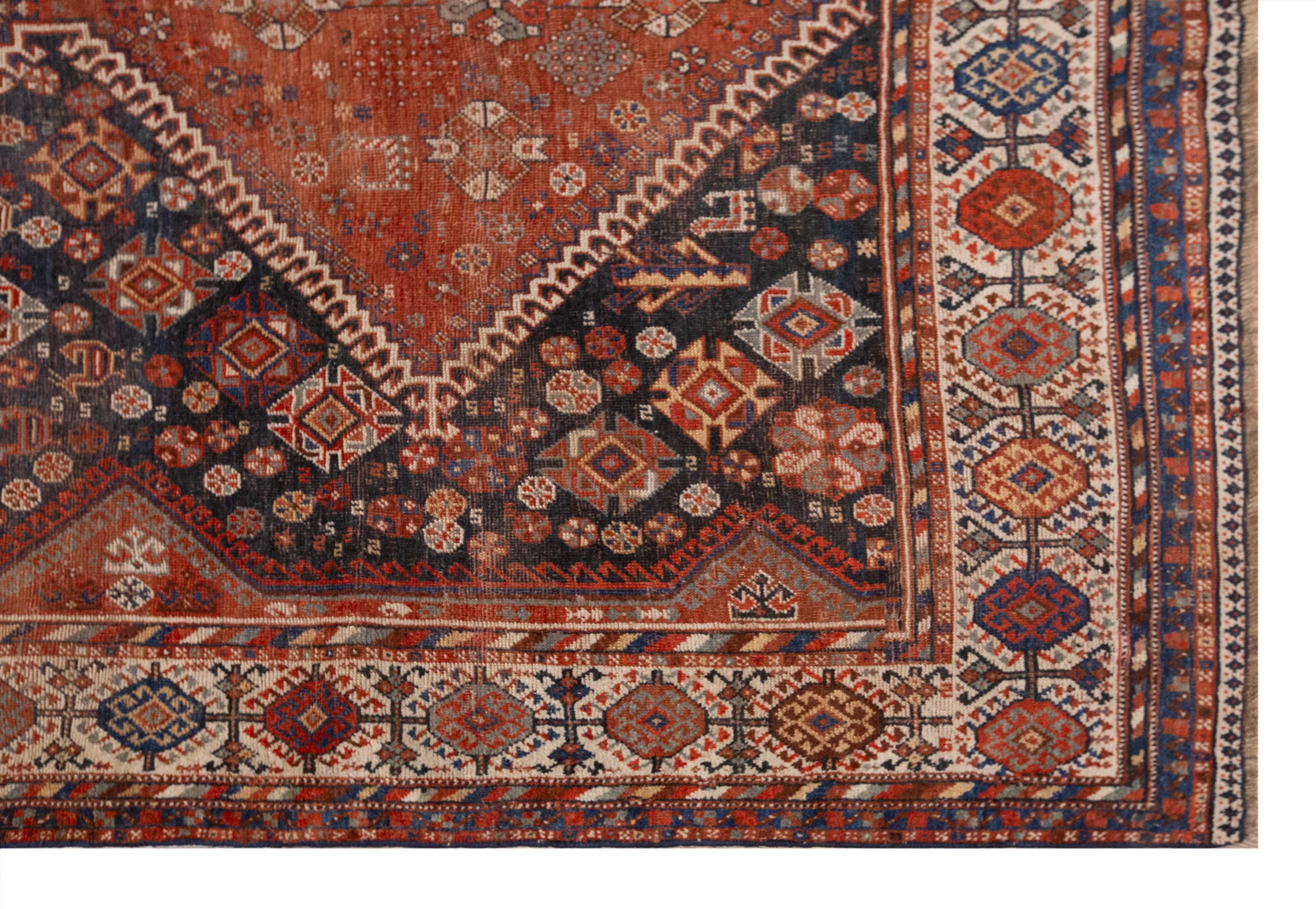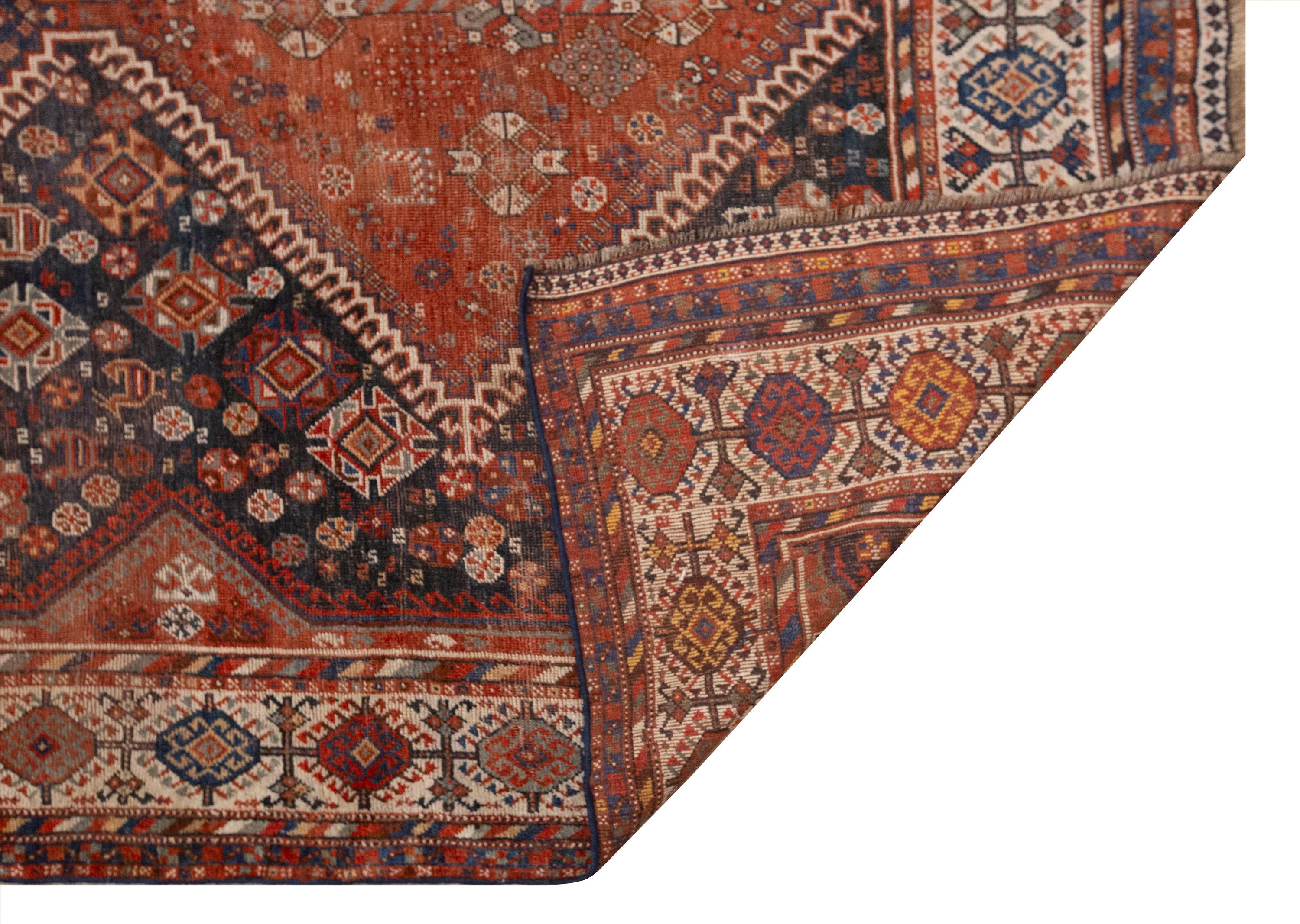 This rare 100-year-old handwoven Turkish wool rug is a true masterpiece of Anatolian craftsmanship. Its grand size and bold design feature large diamond-shaped medallions filled with intricate floral and geometric motifs, symbolizing fertility, protection, and the continuity of life. The rich terracotta and deep navy tones create a striking contrast, framed by borders woven with endless detail and rhythm.