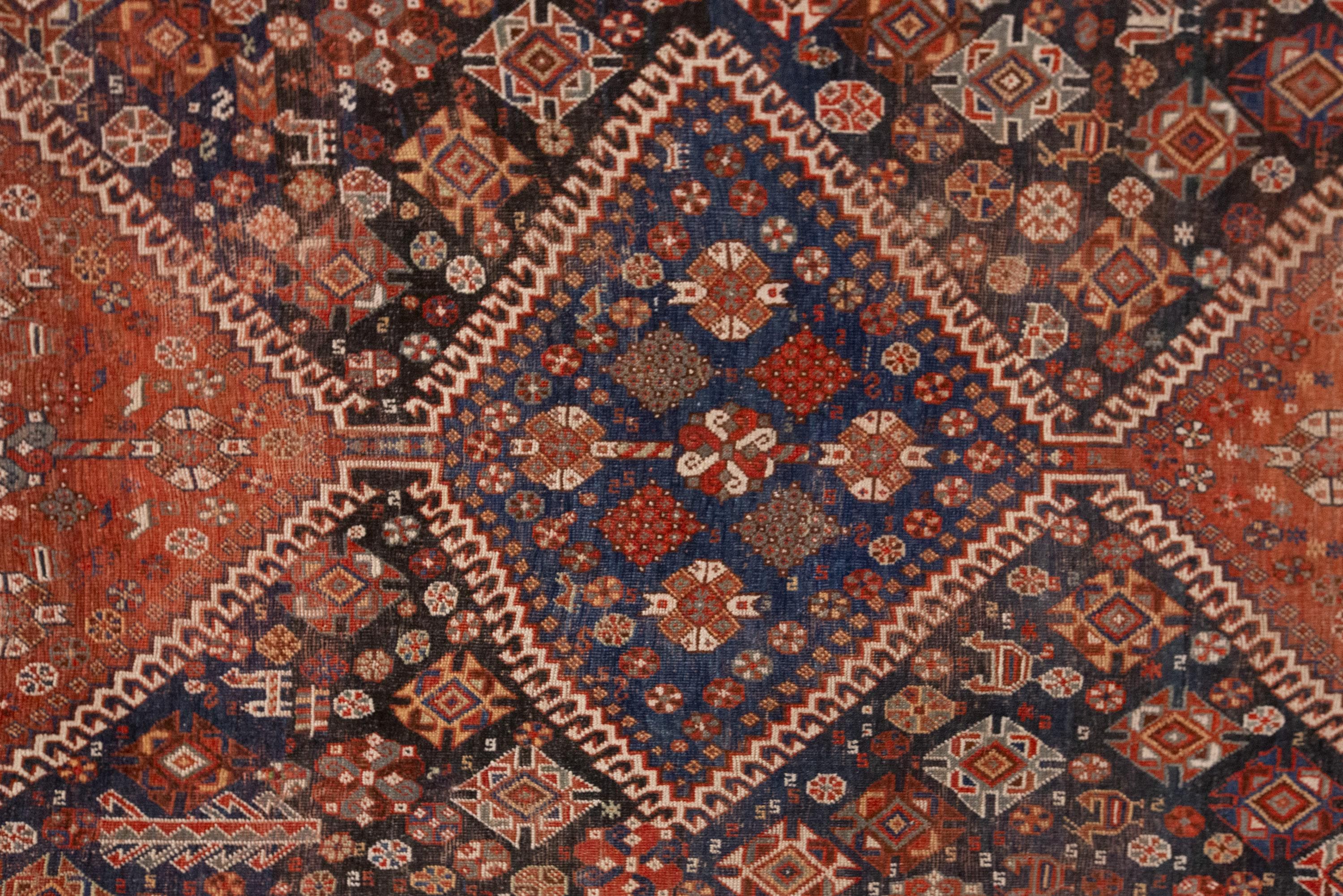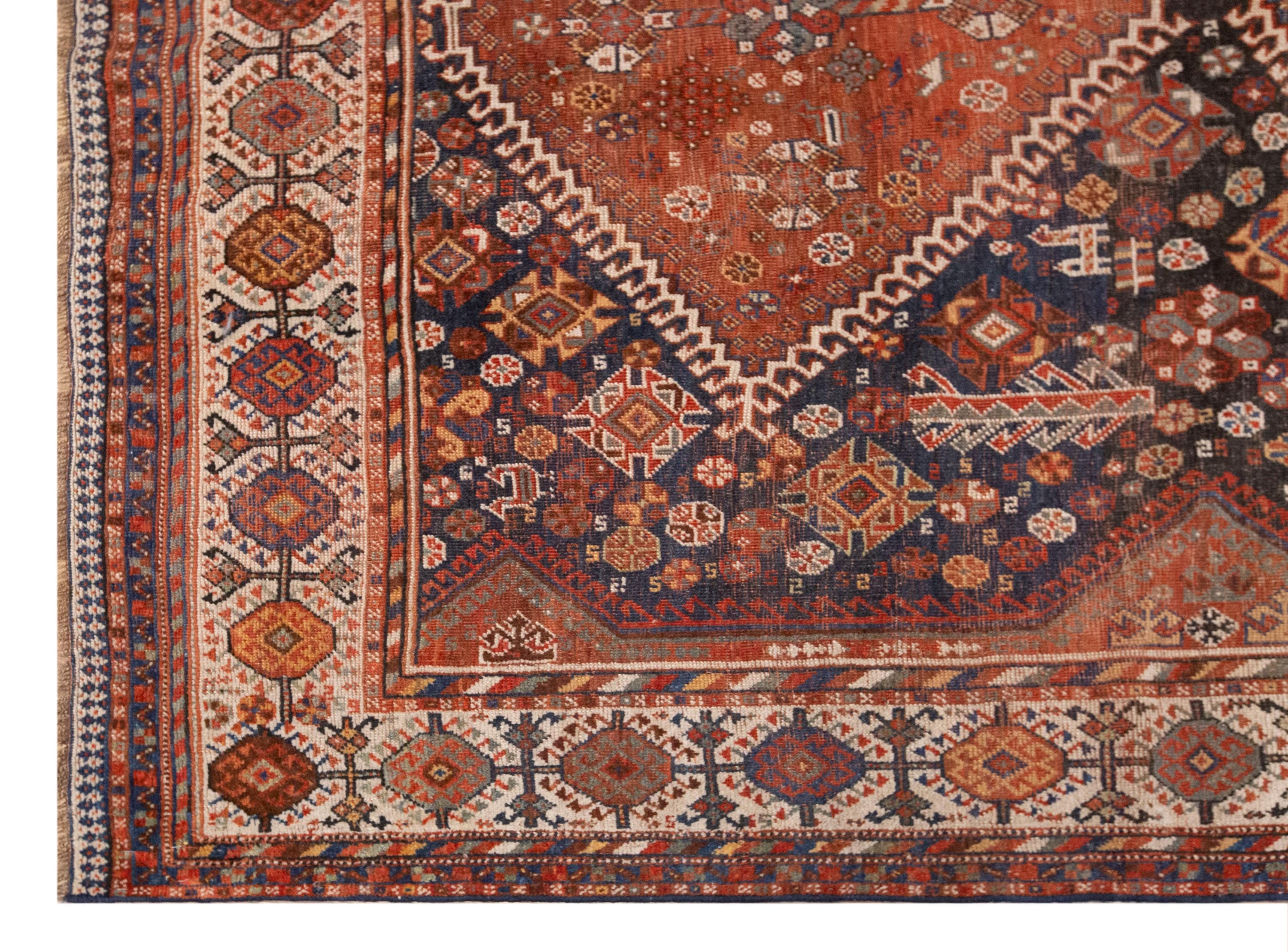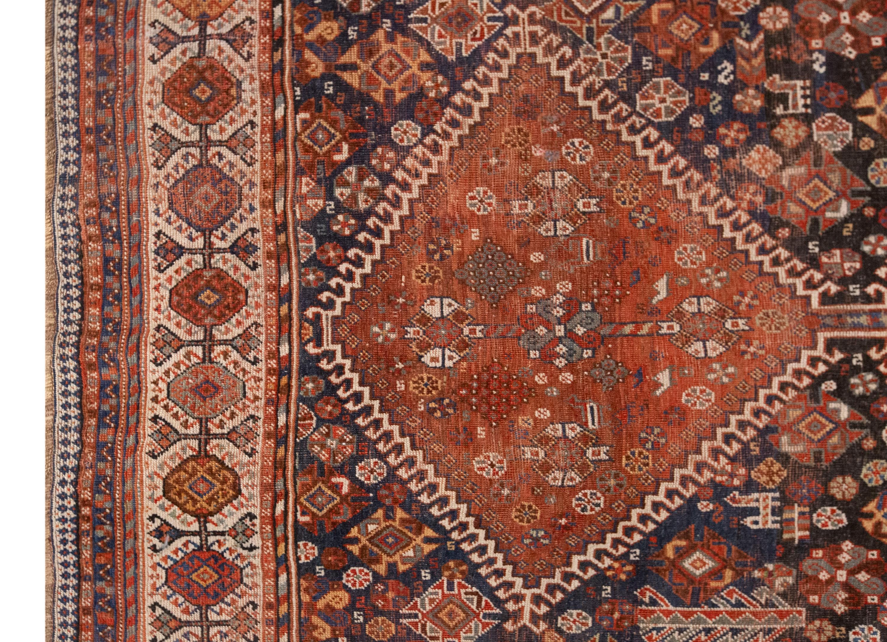 This rare 100-year-old handwoven Turkish wool rug is a true masterpiece of Anatolian craftsmanship. Its grand size and bold design feature large diamond-shaped medallions filled with intricate floral and geometric motifs, symbolizing fertility, protection, and the continuity of life. The rich terracotta and deep navy tones create a striking contrast, framed by borders woven with endless detail and rhythm.