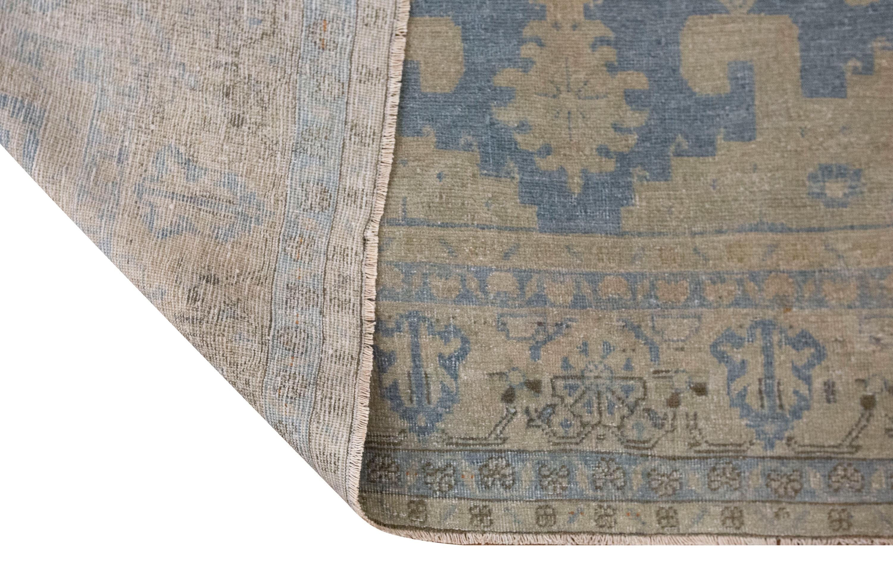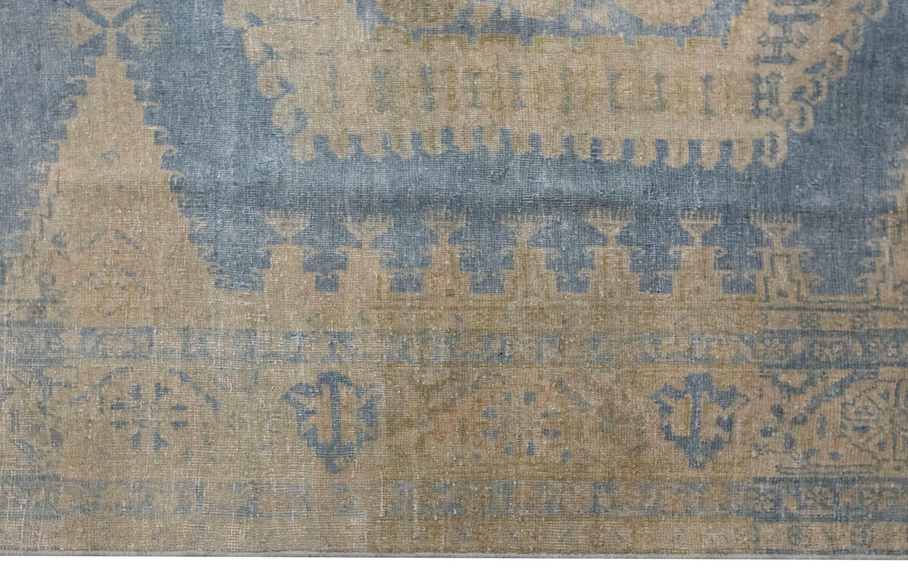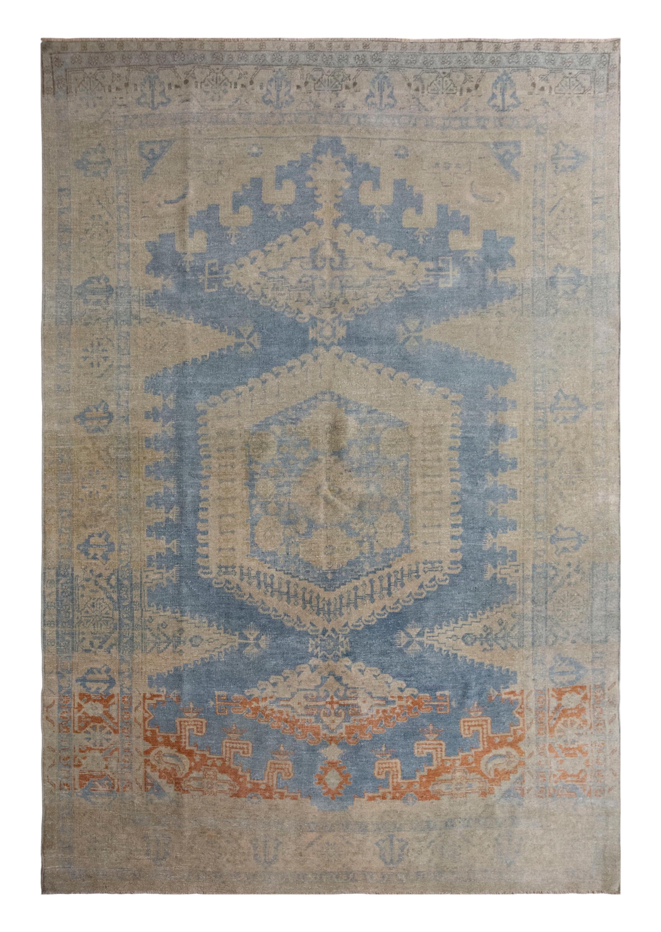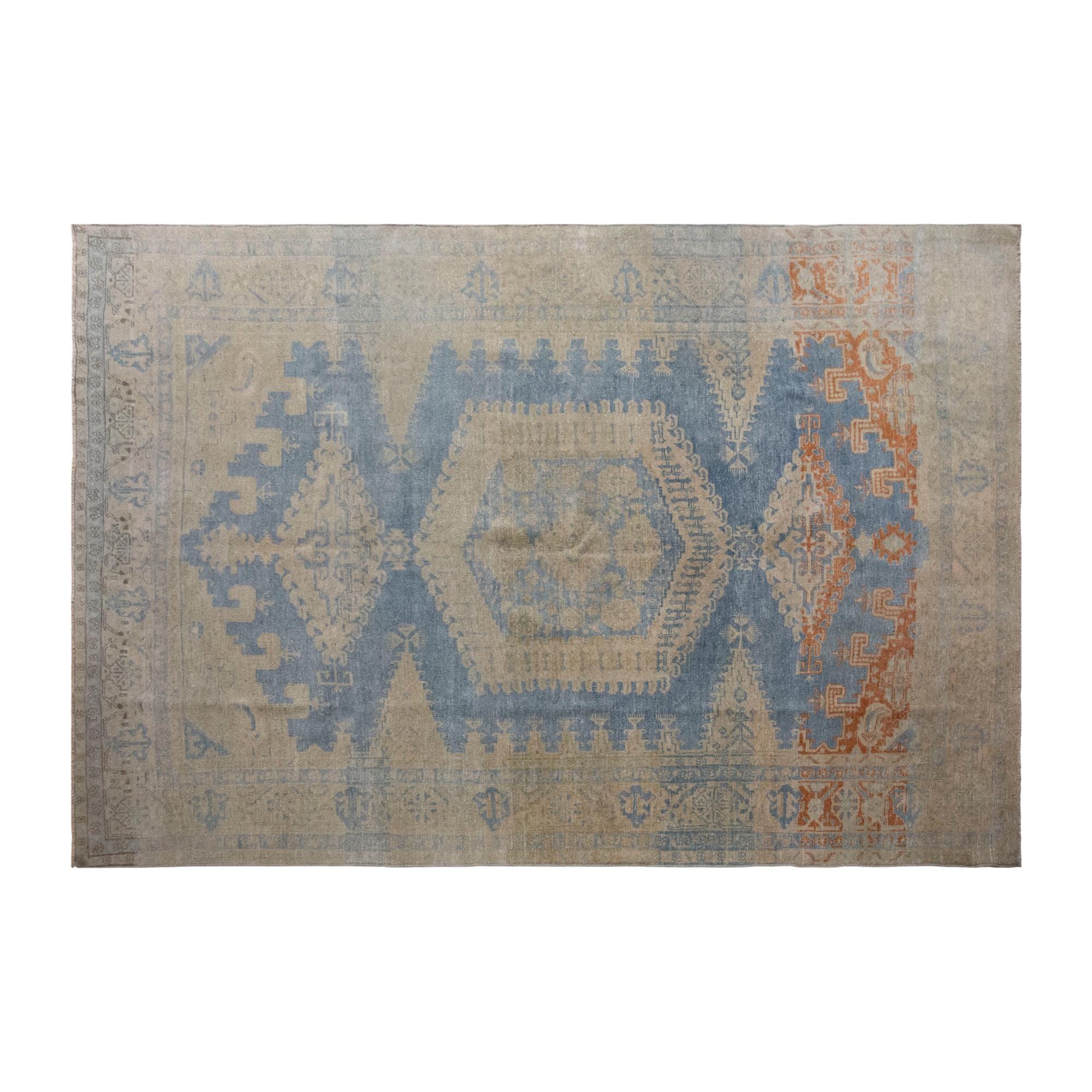 This 60-year-old handwoven Turkish wool rug showcases a bold geometric design with a large central hexagonal medallion in soft blue and beige tones. Subtle touches of terracotta add warmth, while the intricate motifs along the borders reflect the artistry and symbolism of Anatolian weaving. The faded patina, developed over decades, gives the rug an authentic, timeworn beauty that enhances its character.