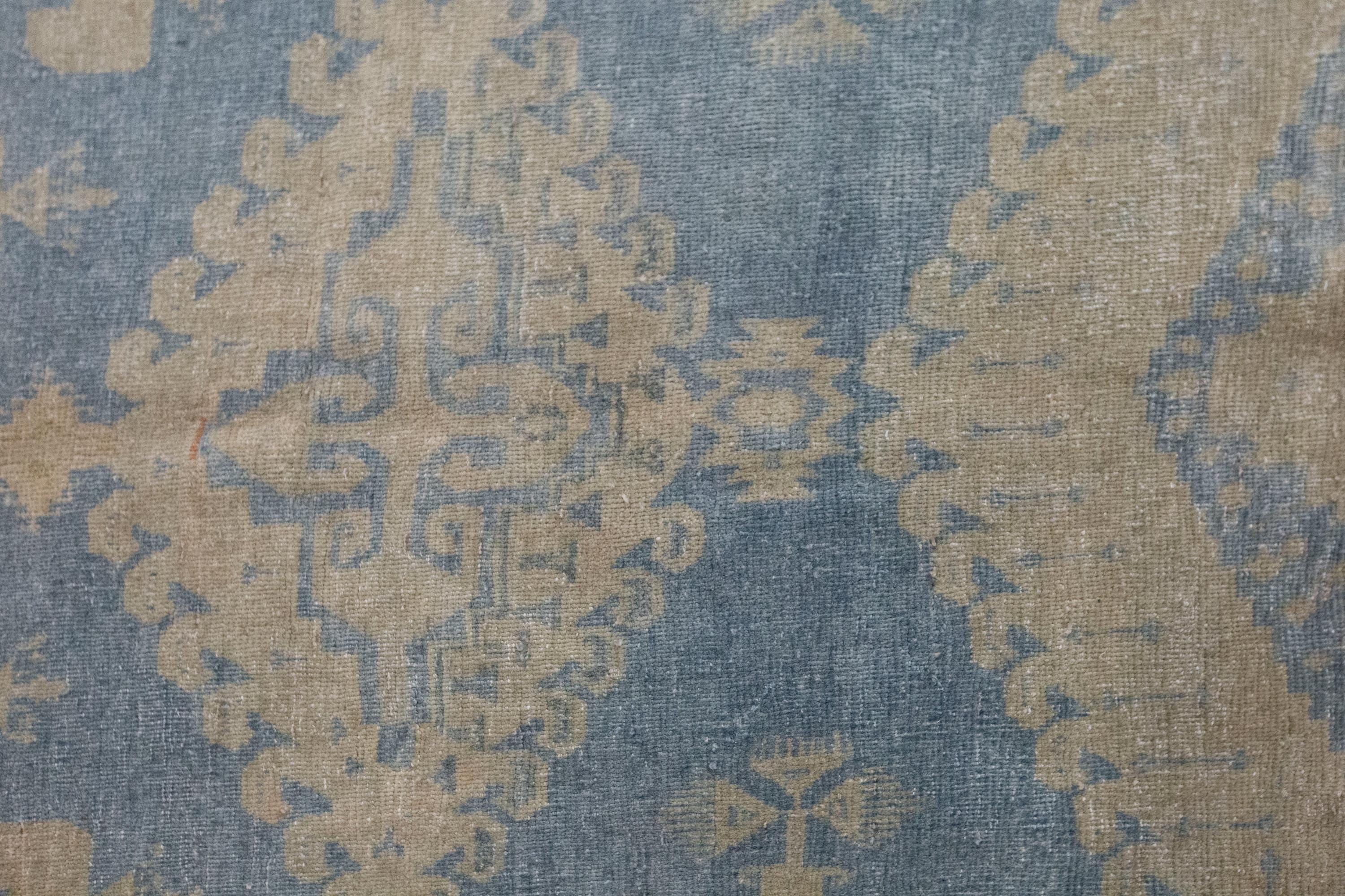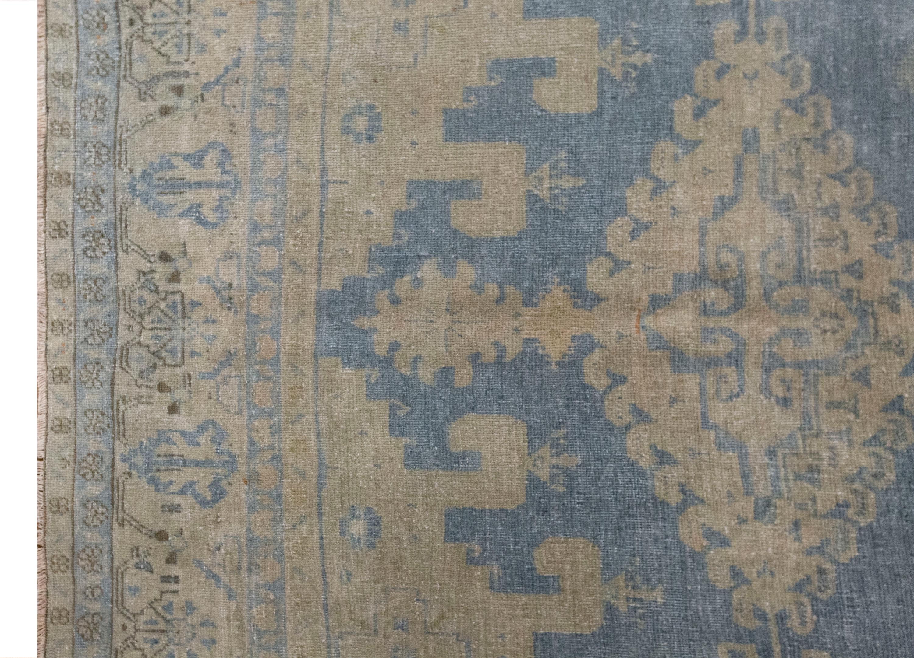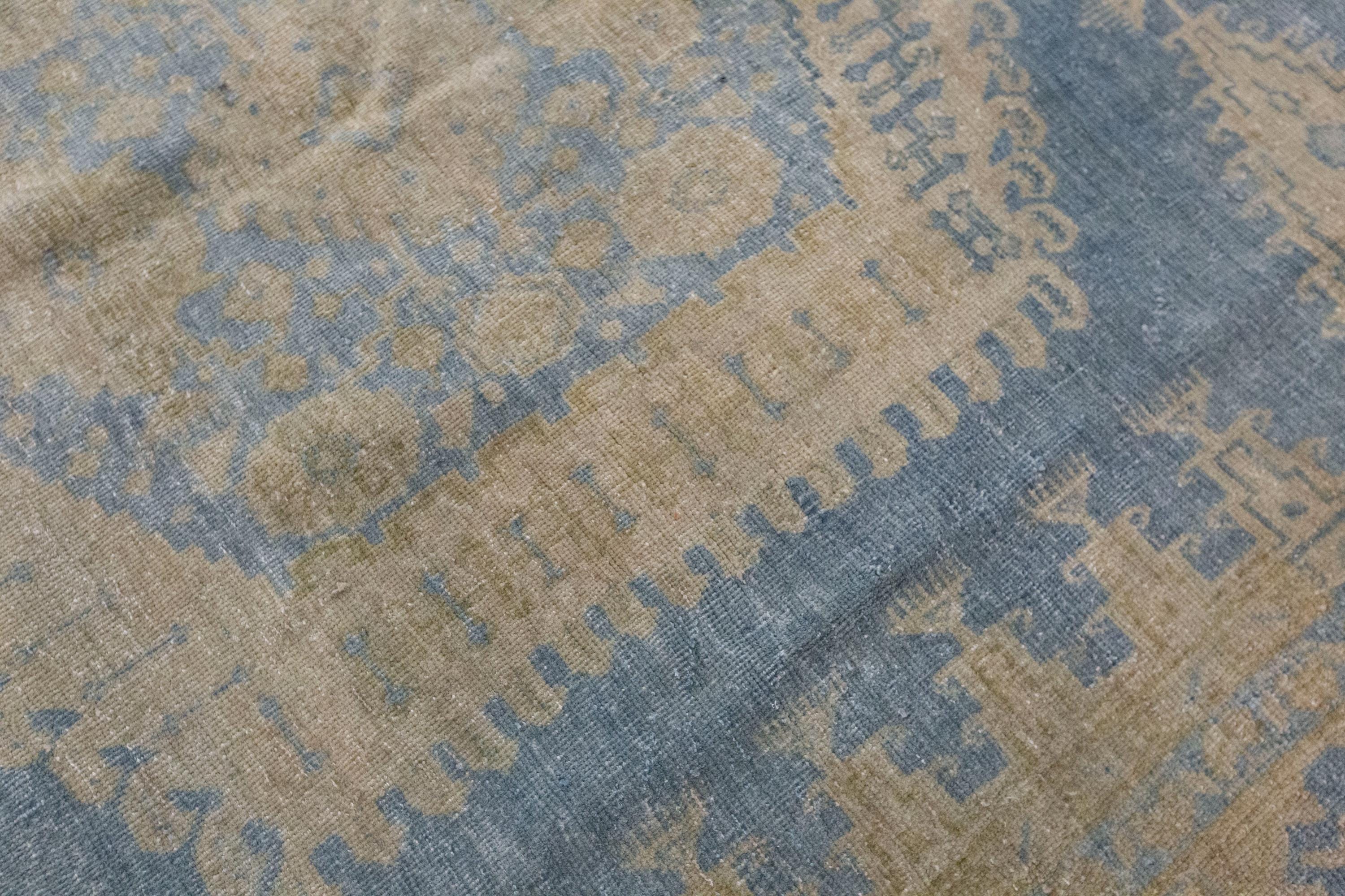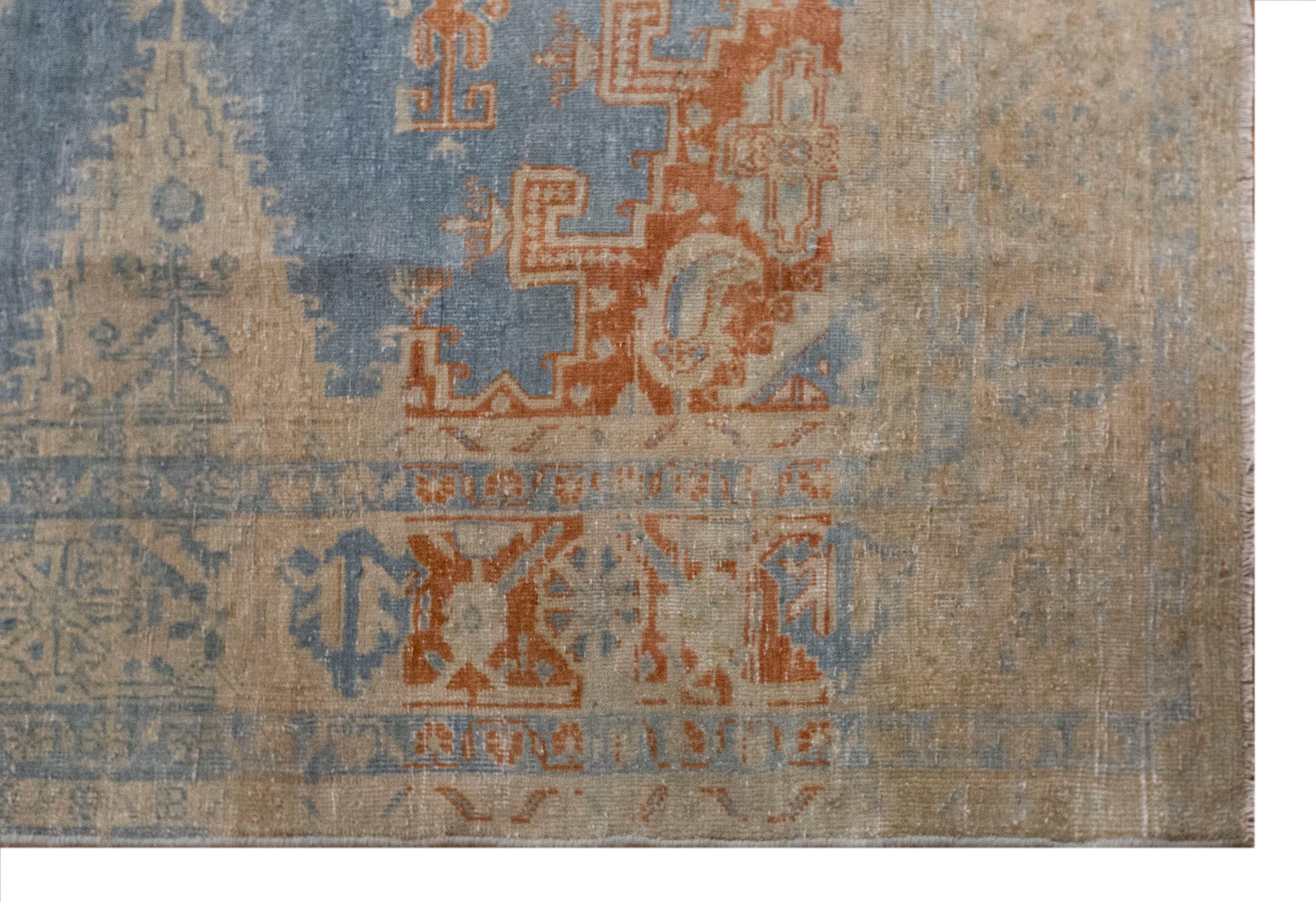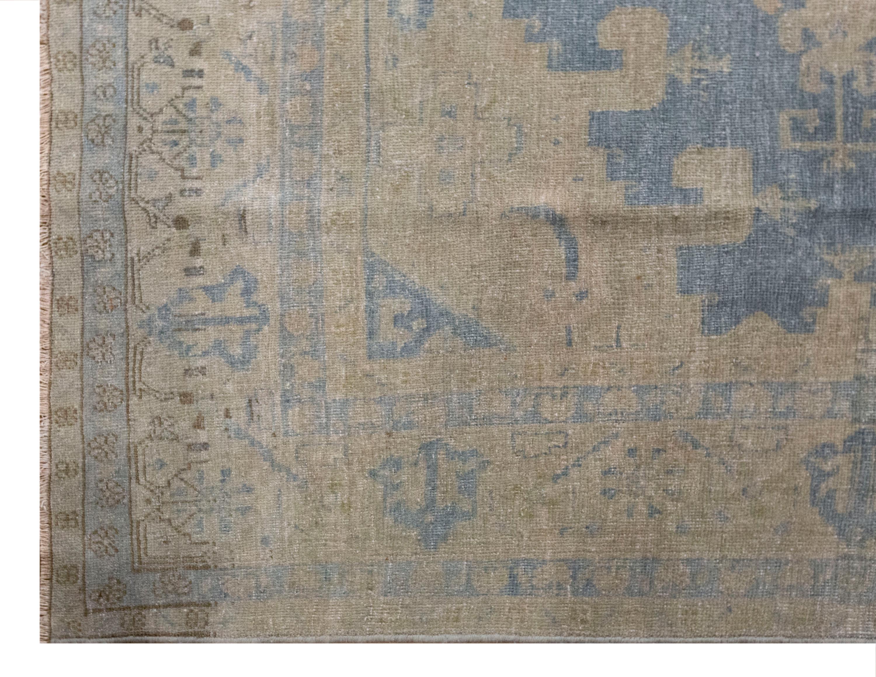 This 60-year-old handwoven Turkish wool rug showcases a bold geometric design with a large central hexagonal medallion in soft blue and beige tones. Subtle touches of terracotta add warmth, while the intricate motifs along the borders reflect the artistry and symbolism of Anatolian weaving. The faded patina, developed over decades, gives the rug an authentic, timeworn beauty that enhances its character.