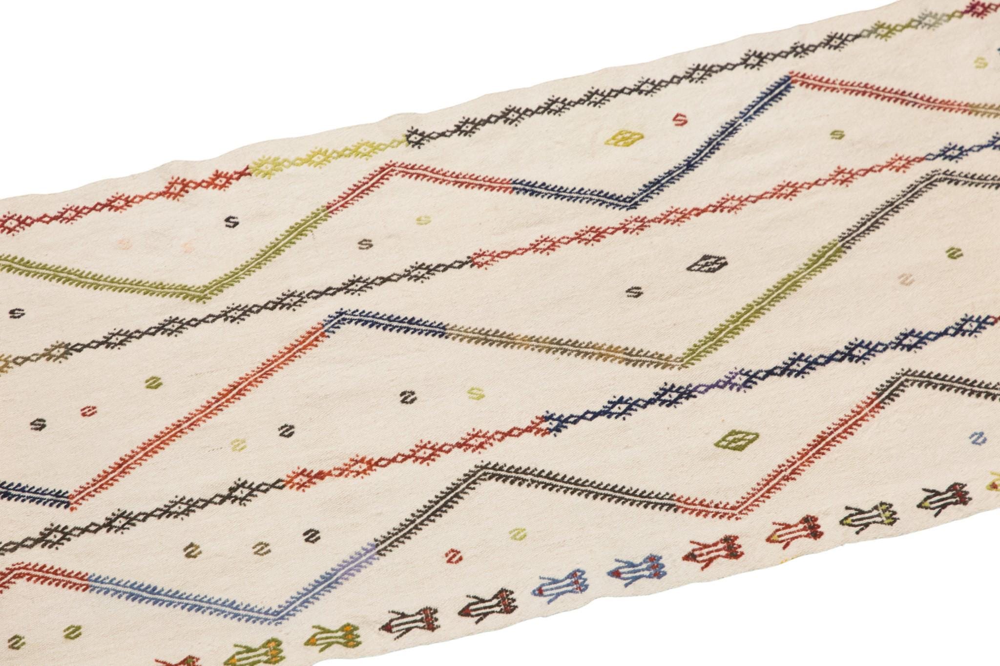 A rare vintage Kilim runner with clean stripes, soft neutral tones, and exquisite 1960s craftsmanship—professionally cleaned and ready to style in any modern or boho hallway, entryway, or long narrow space.