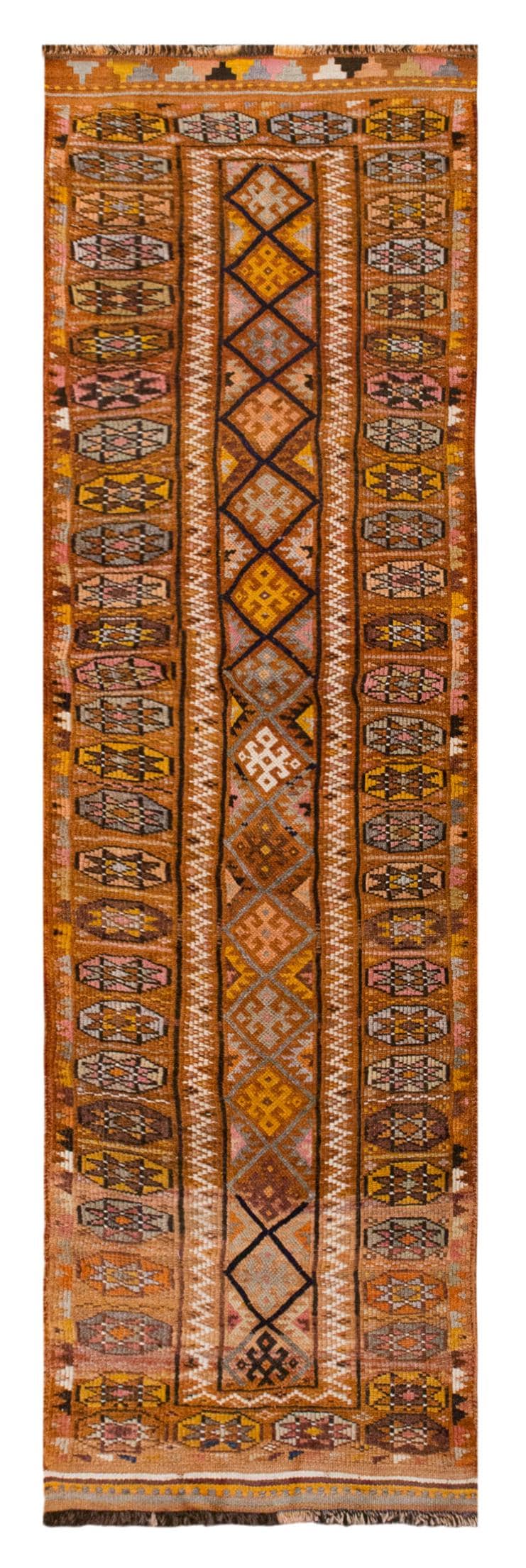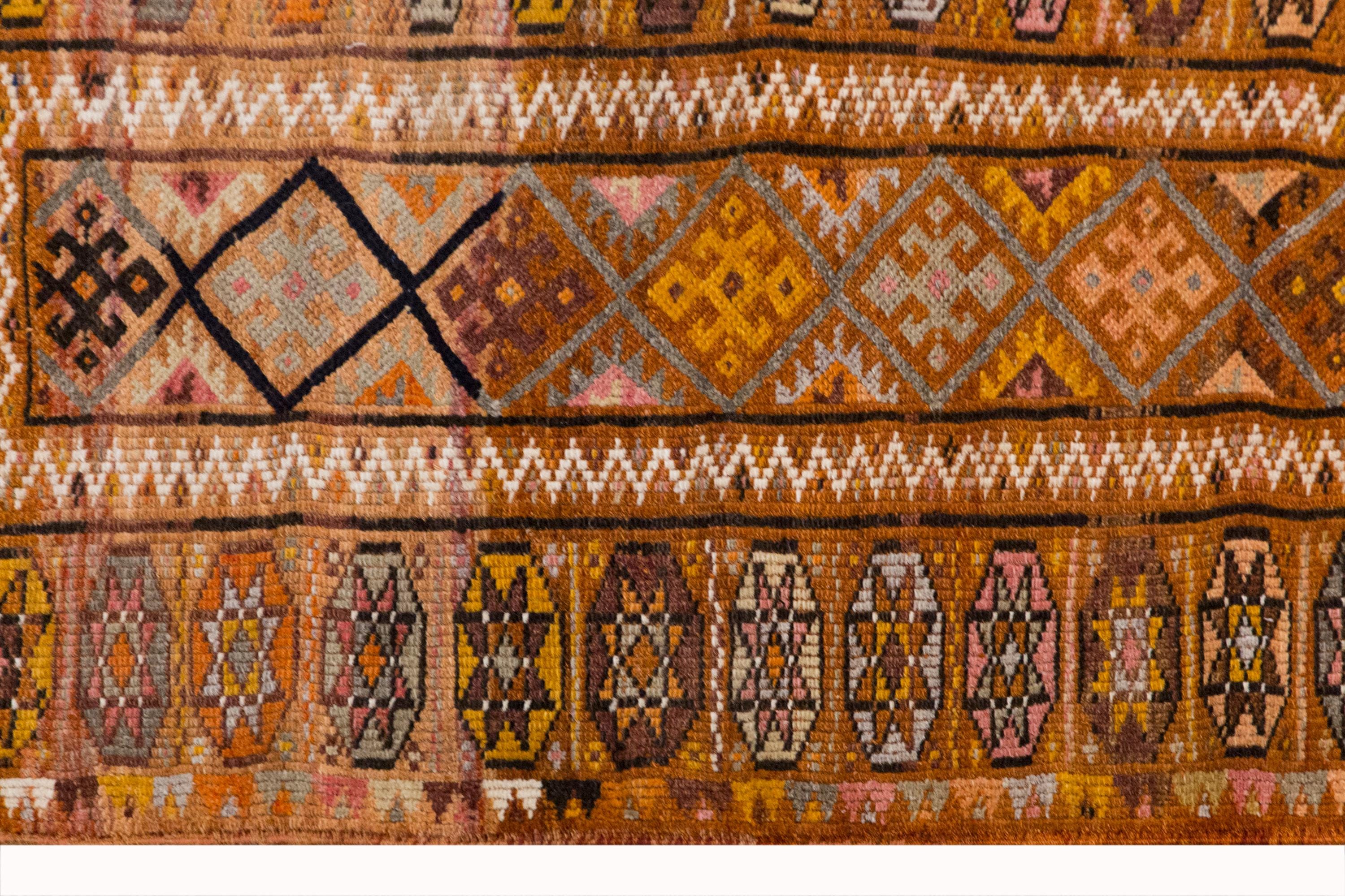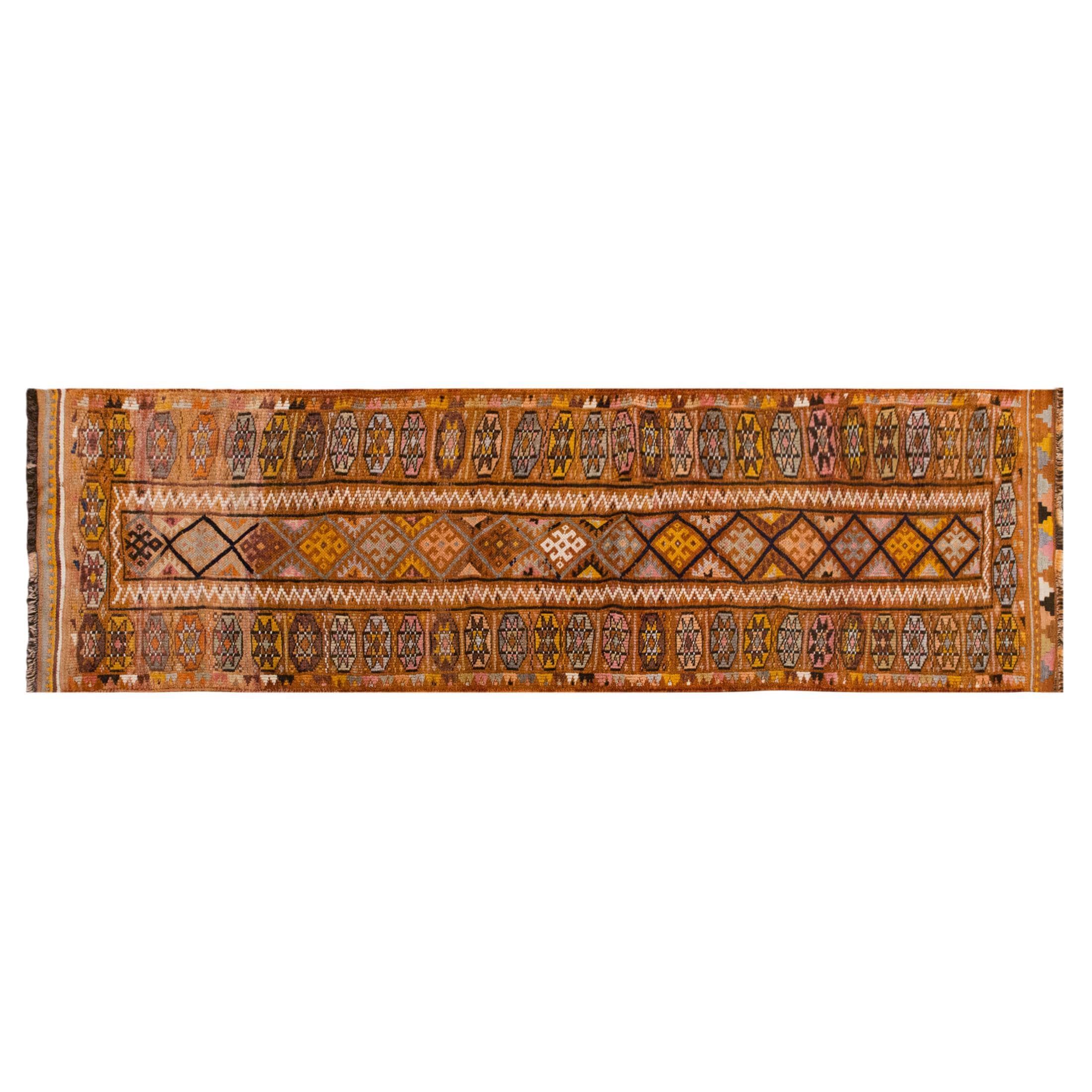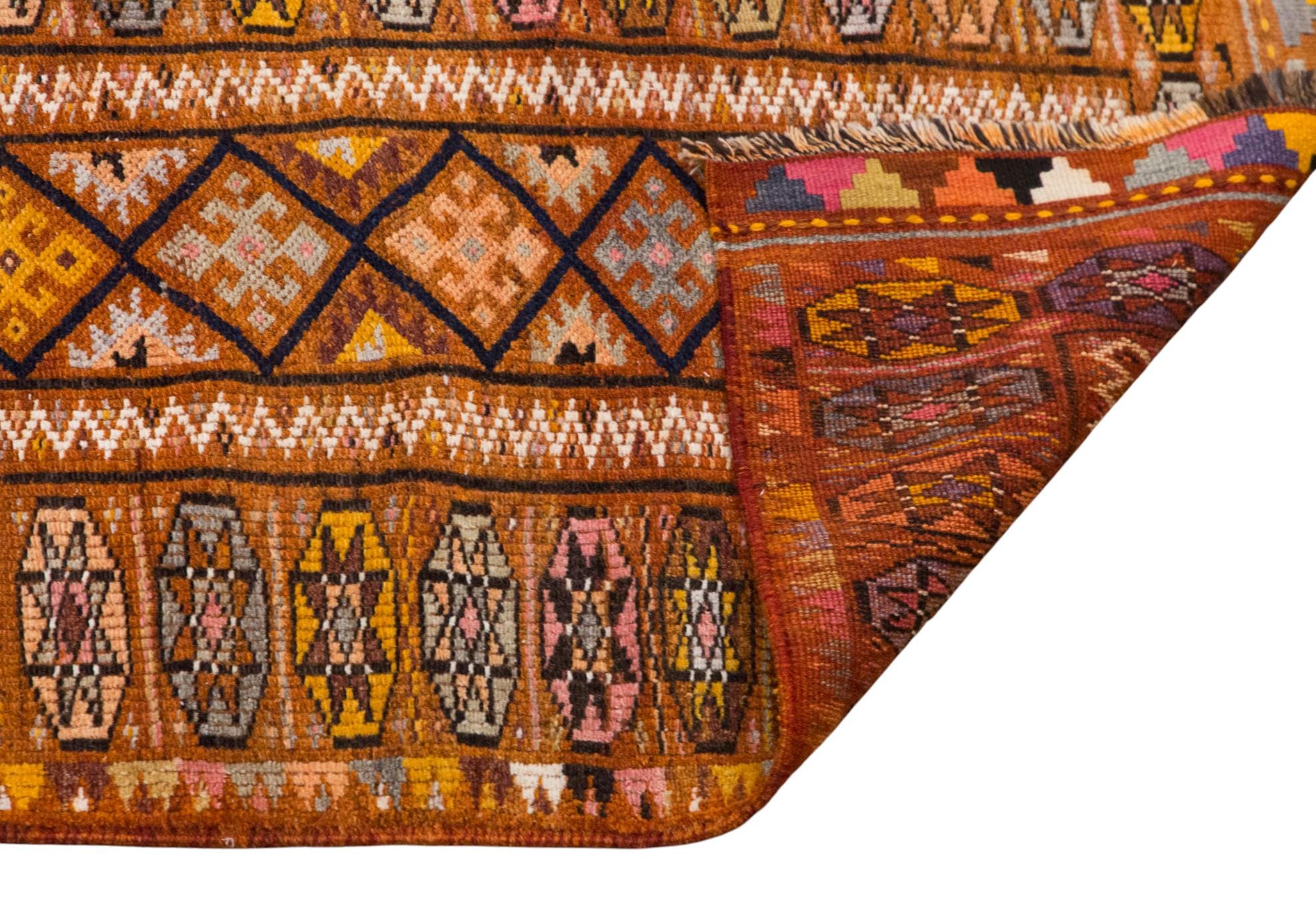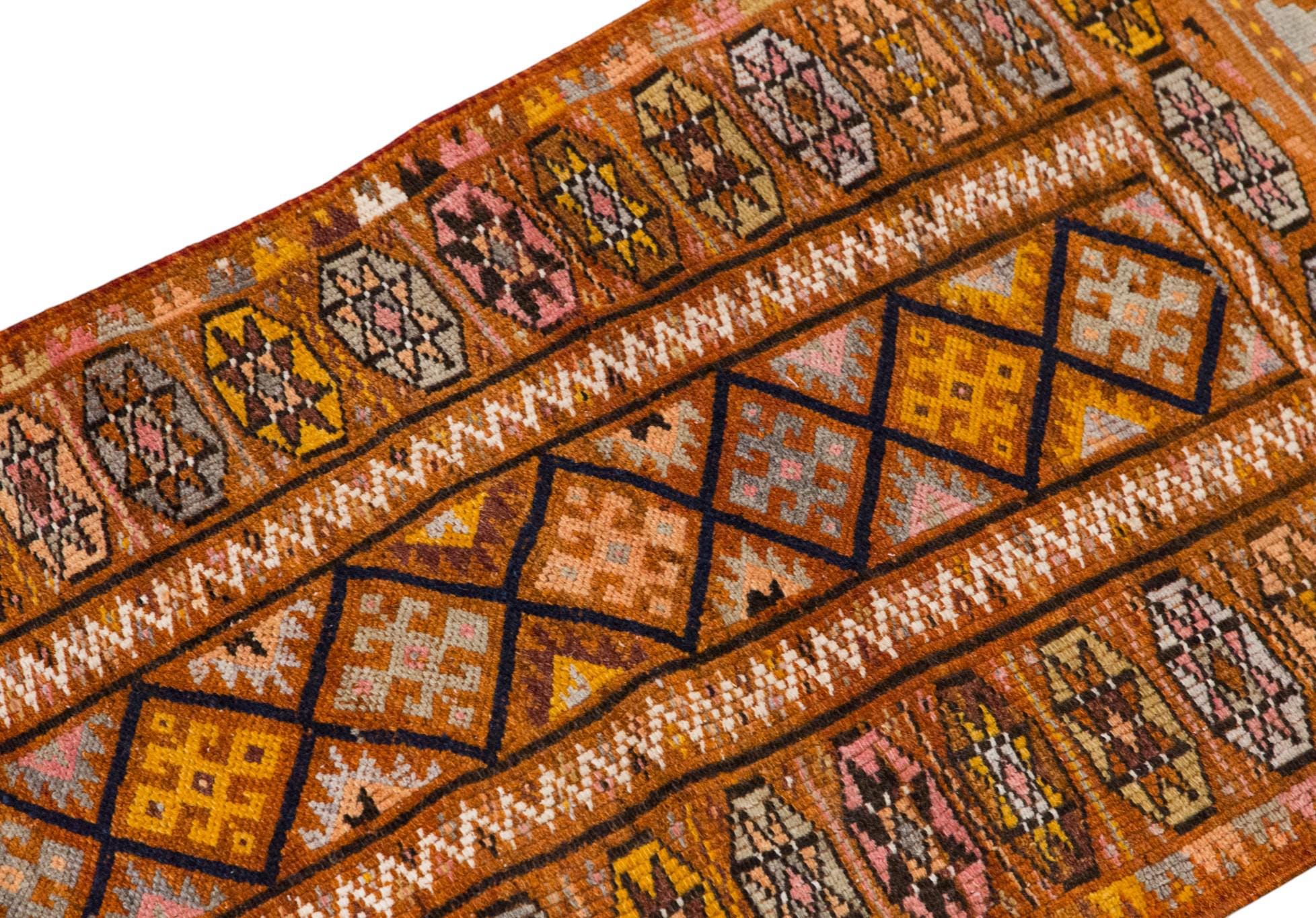 A one-of-a-kind Kurdish Herki handmade wool runner rug, naturally dyed with plants, woven in the 1960s in rural Turkey.