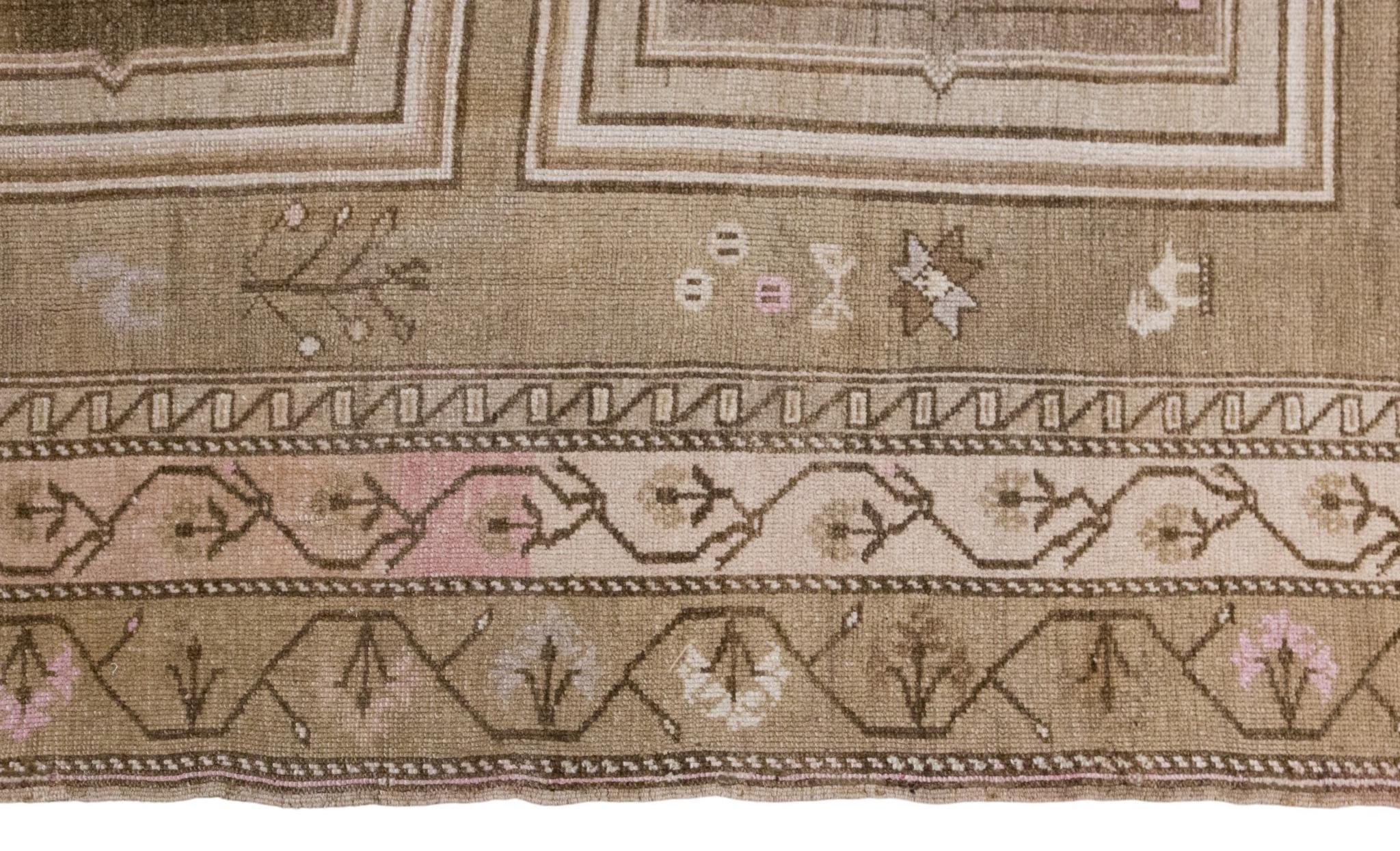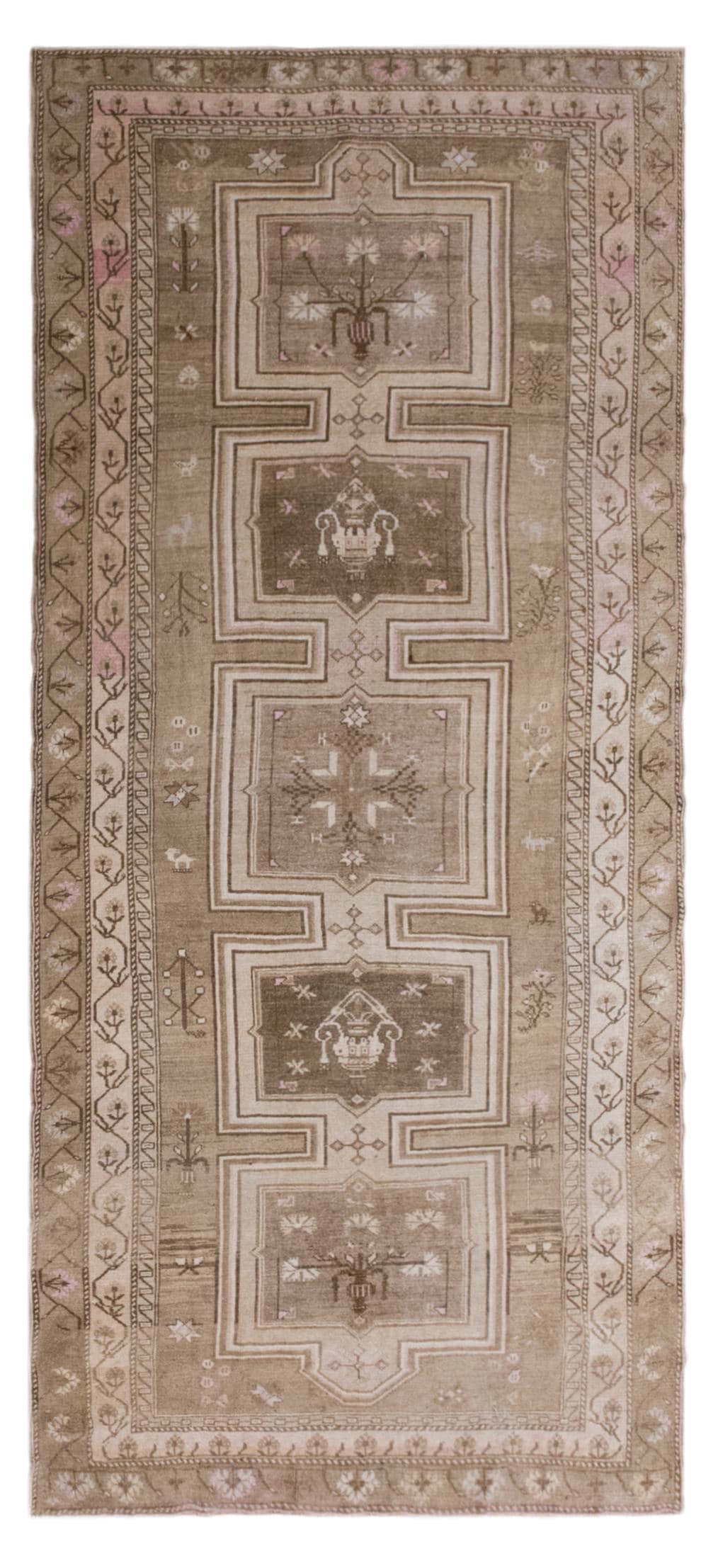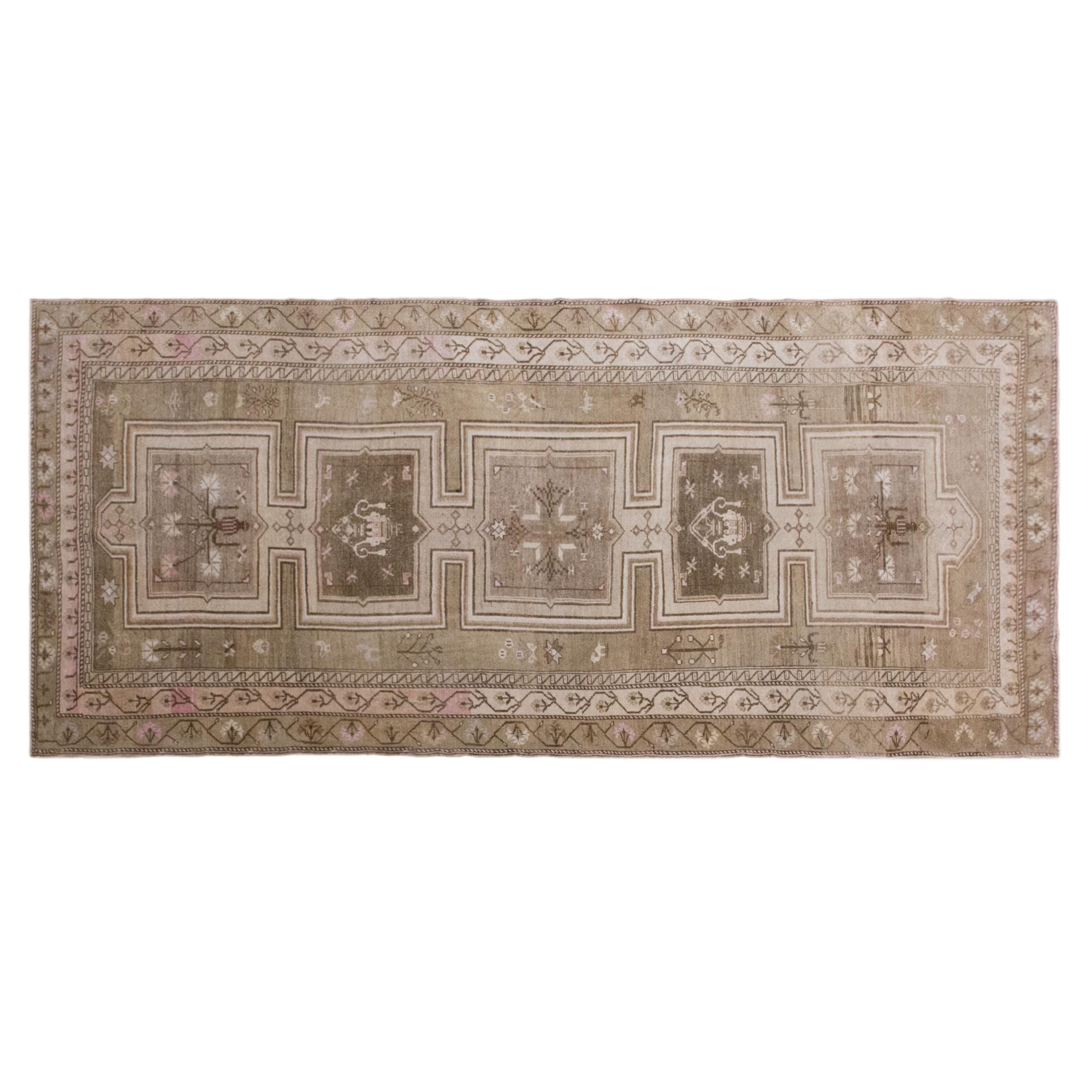 Bring timeless beauty and character to your space with this authentic handwoven Kurdish Kars vintage runner rug. Crafted approximately 60–65 years ago by nomadic villagers, this 100% hand-spun wool on wool piece features an exquisite blend of bohemian charm and traditional Caucasian and Oushak-style design motifs.