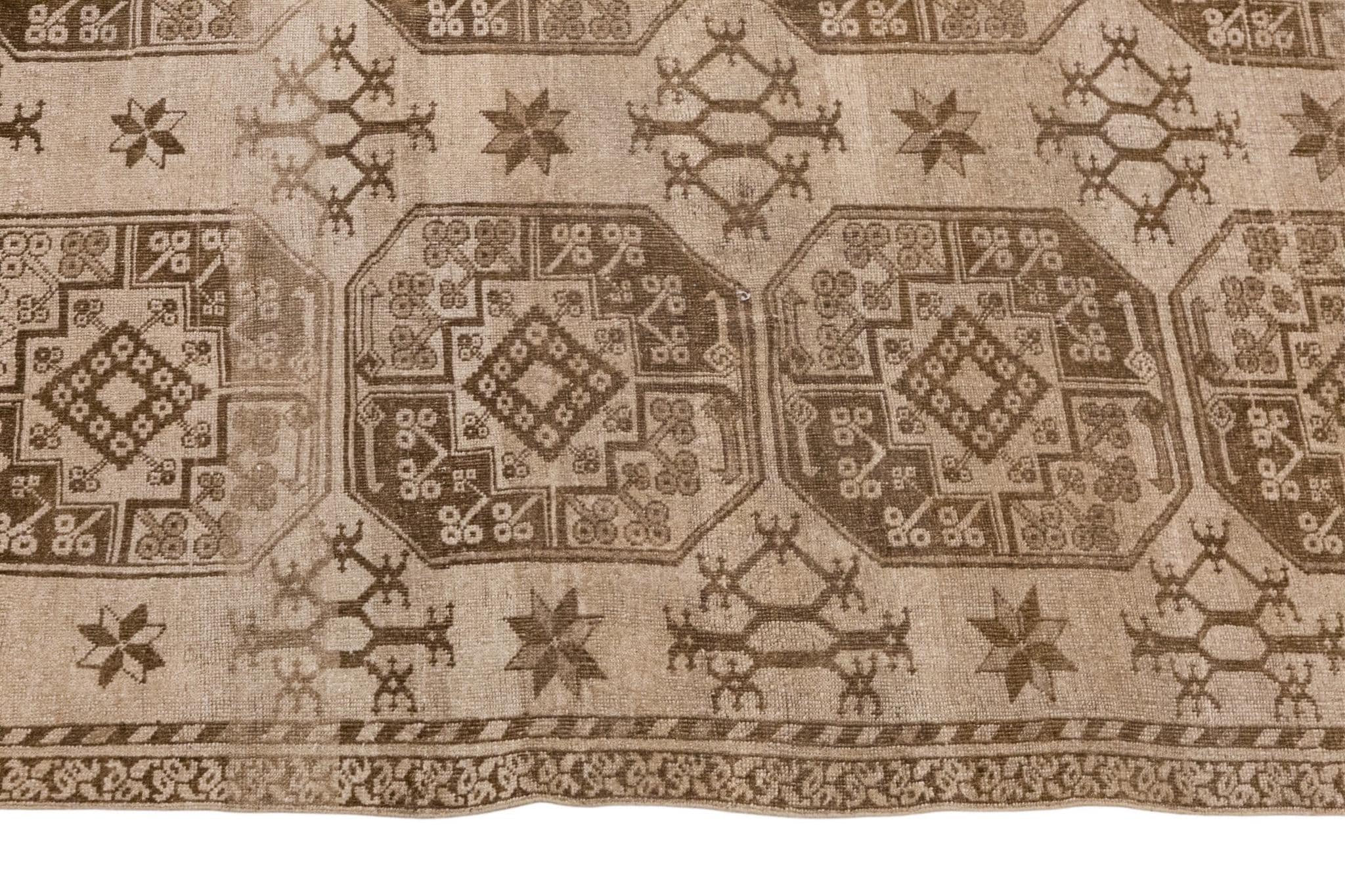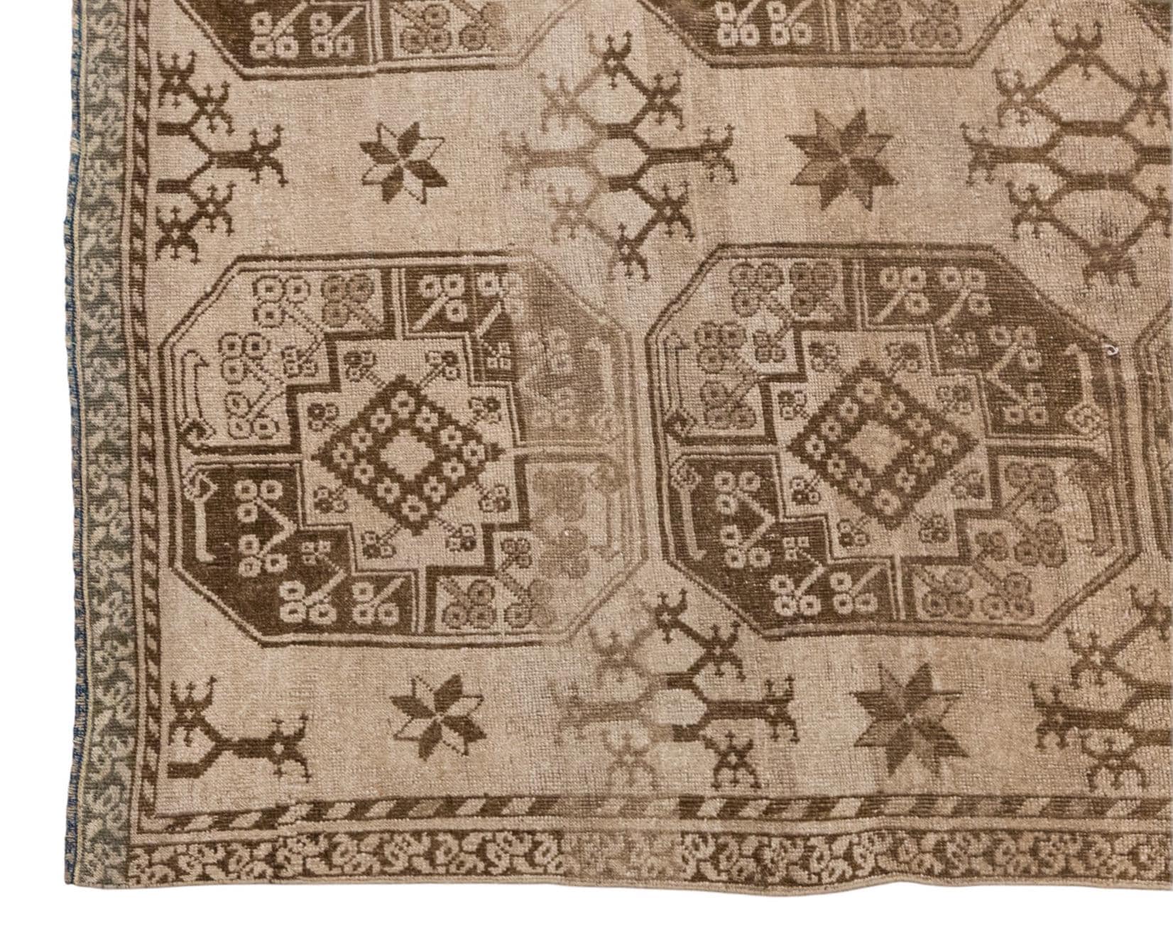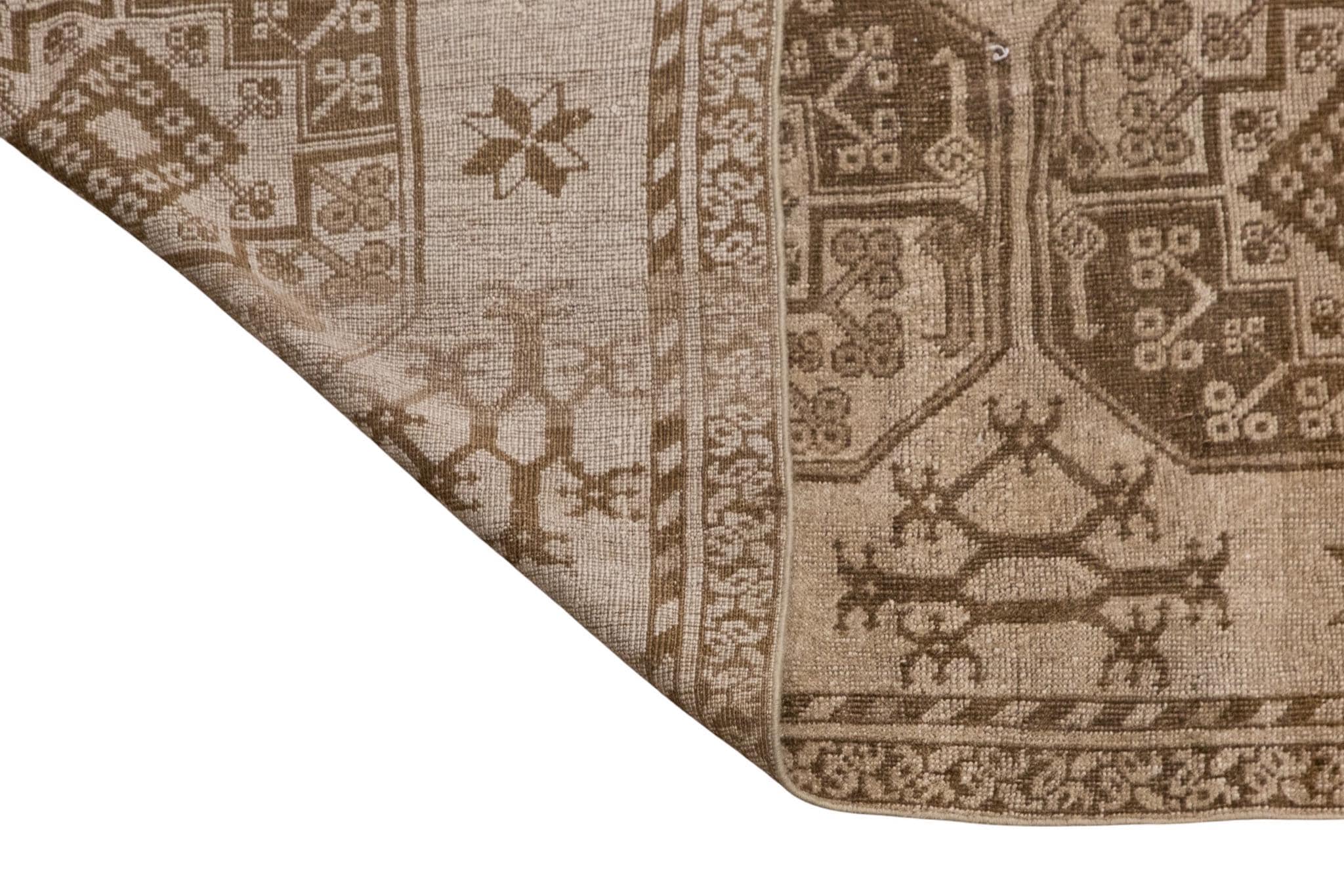 Bring timeless charm and character to your space with this authentic vintage Oushak rug. Handwoven by nomadic villagers, this 60+ years old piece features a stunning combination of bohemian and traditional Caucasian design motifs.