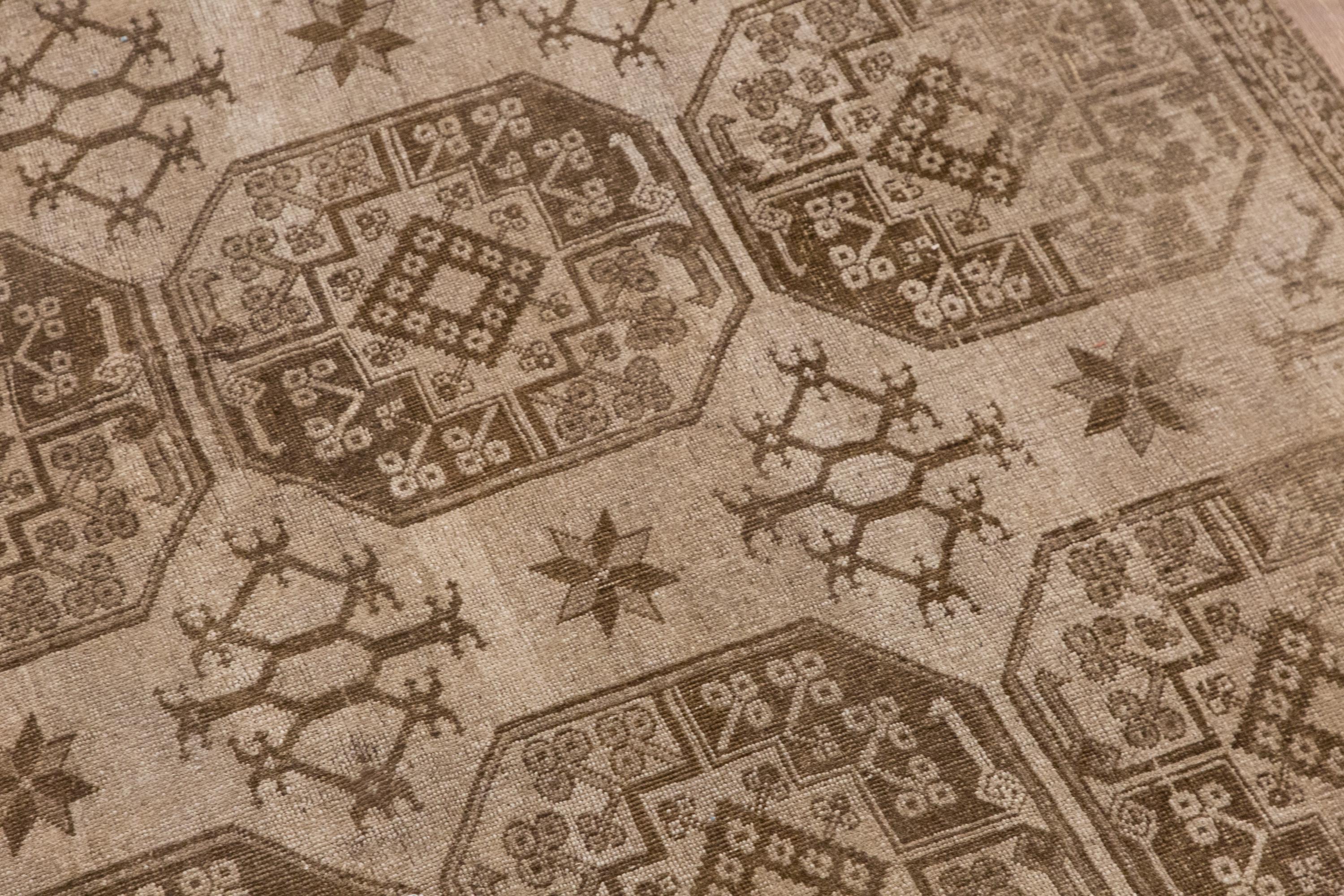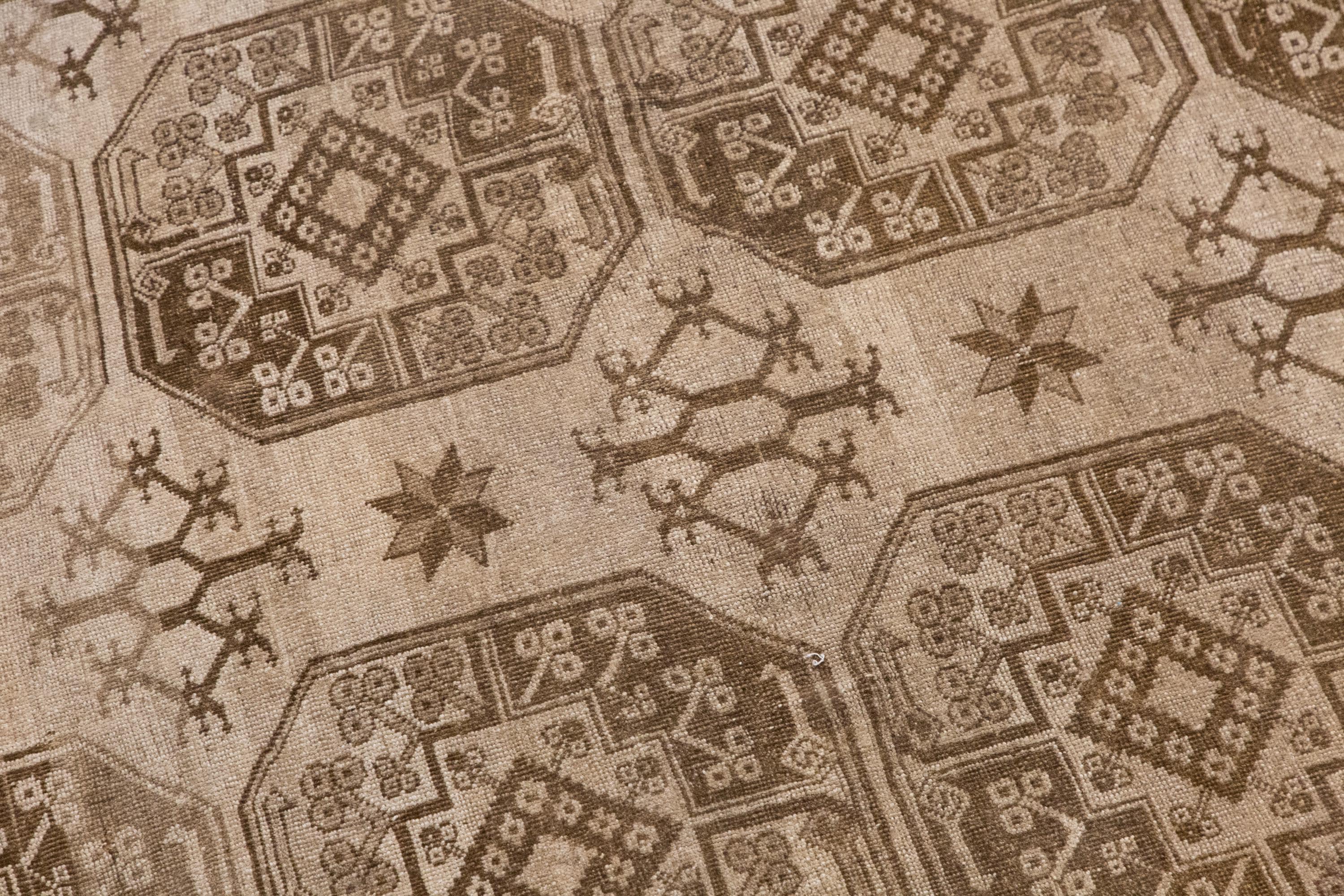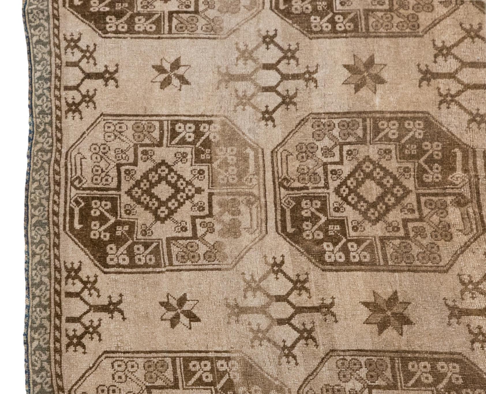 Bring timeless charm and character to your space with this authentic vintage Oushak rug. Handwoven by nomadic villagers, this 60+ years old piece features a stunning combination of bohemian and traditional Caucasian design motifs.