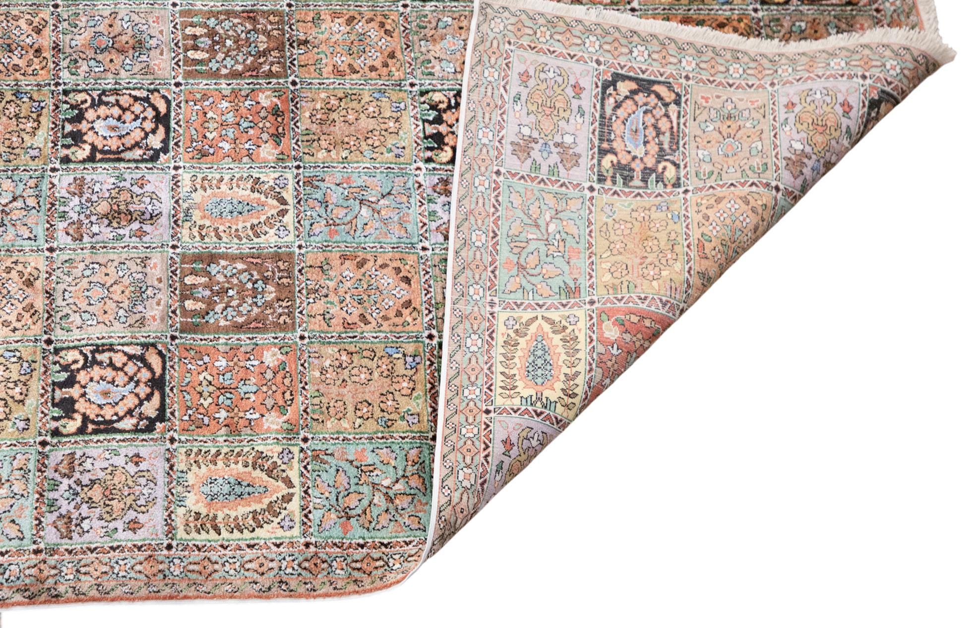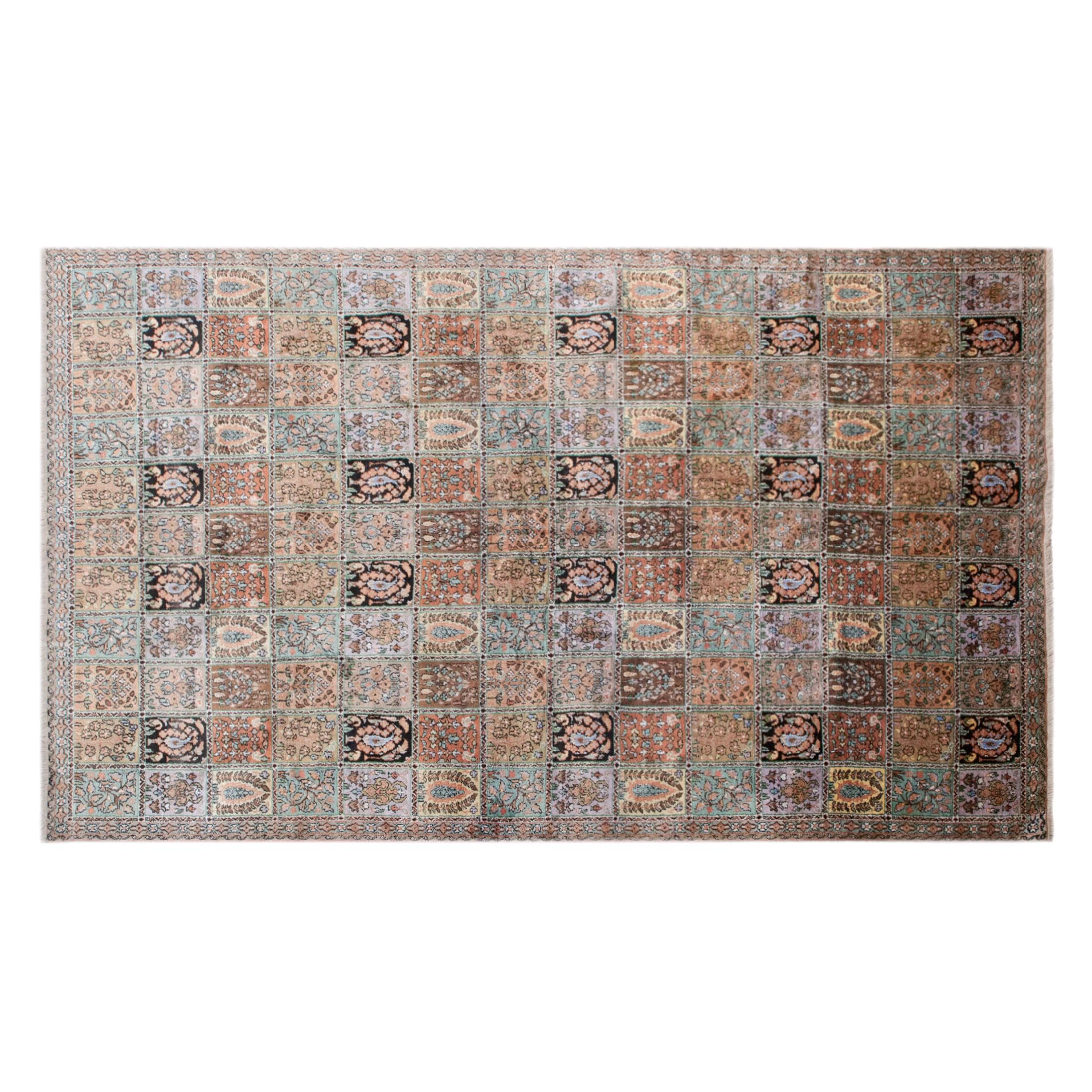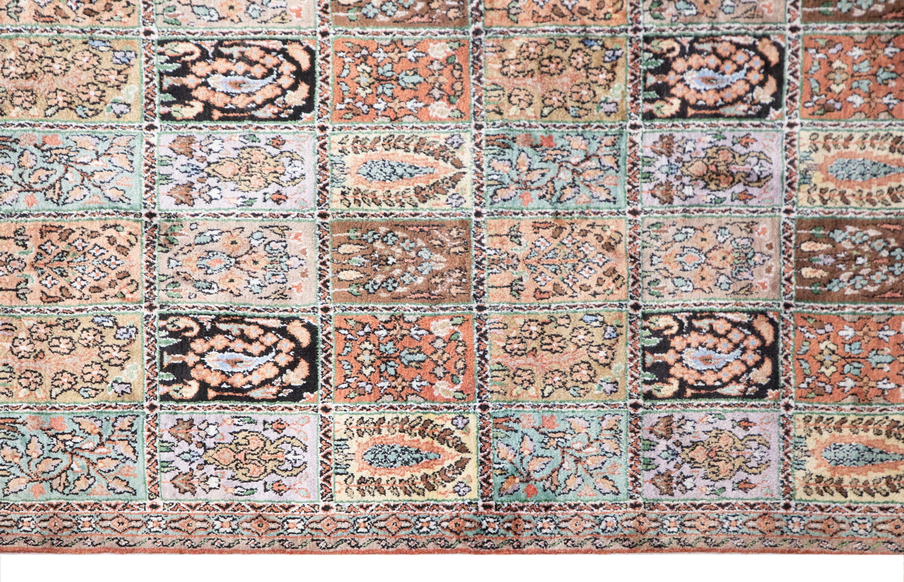 This is an authentic 60+ year old vintage Artificial Silk Cotton and Silk Combination Flosh Rug, preserved in very good condition with light, natural age wear consistent with genuine handmade rugs