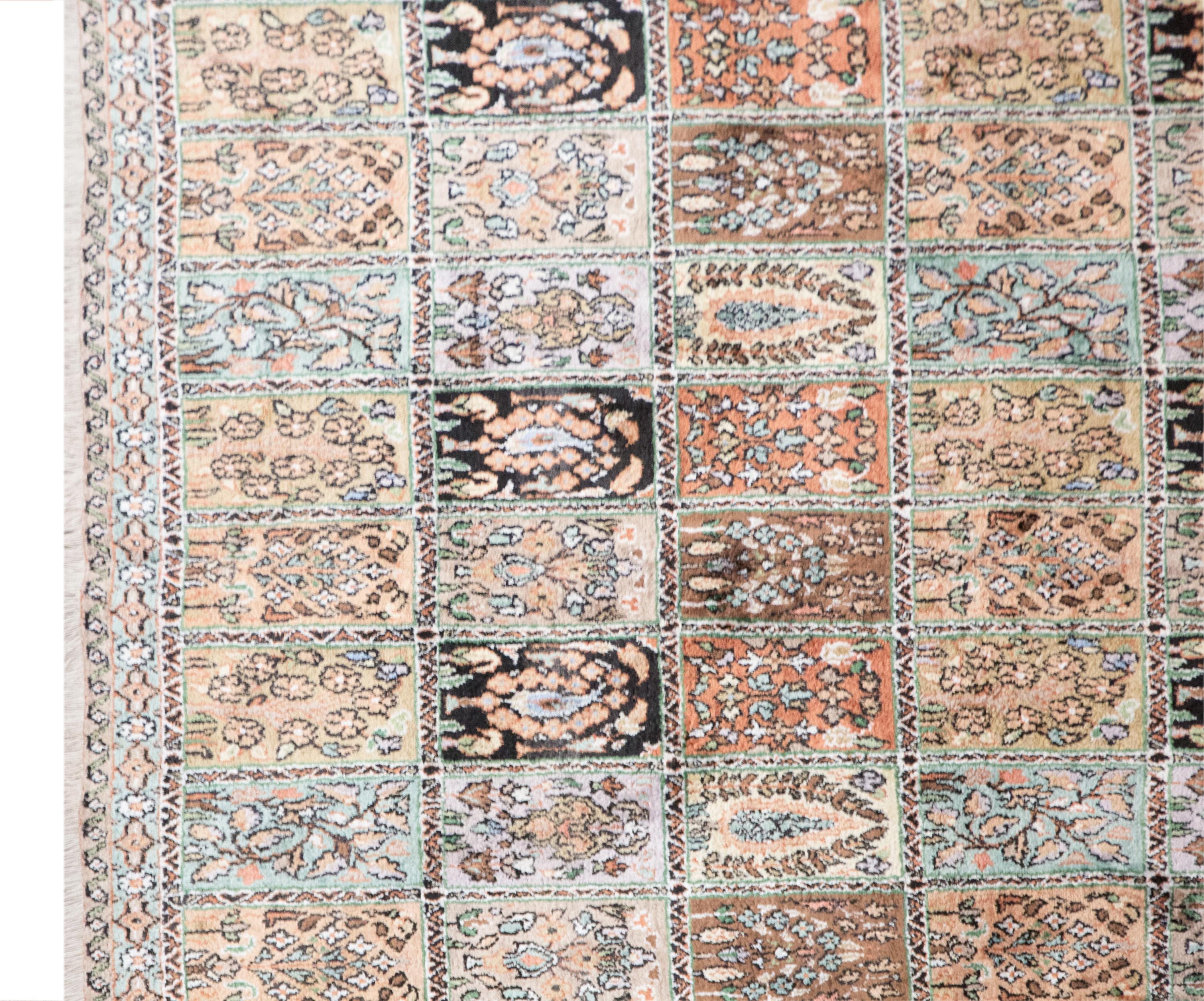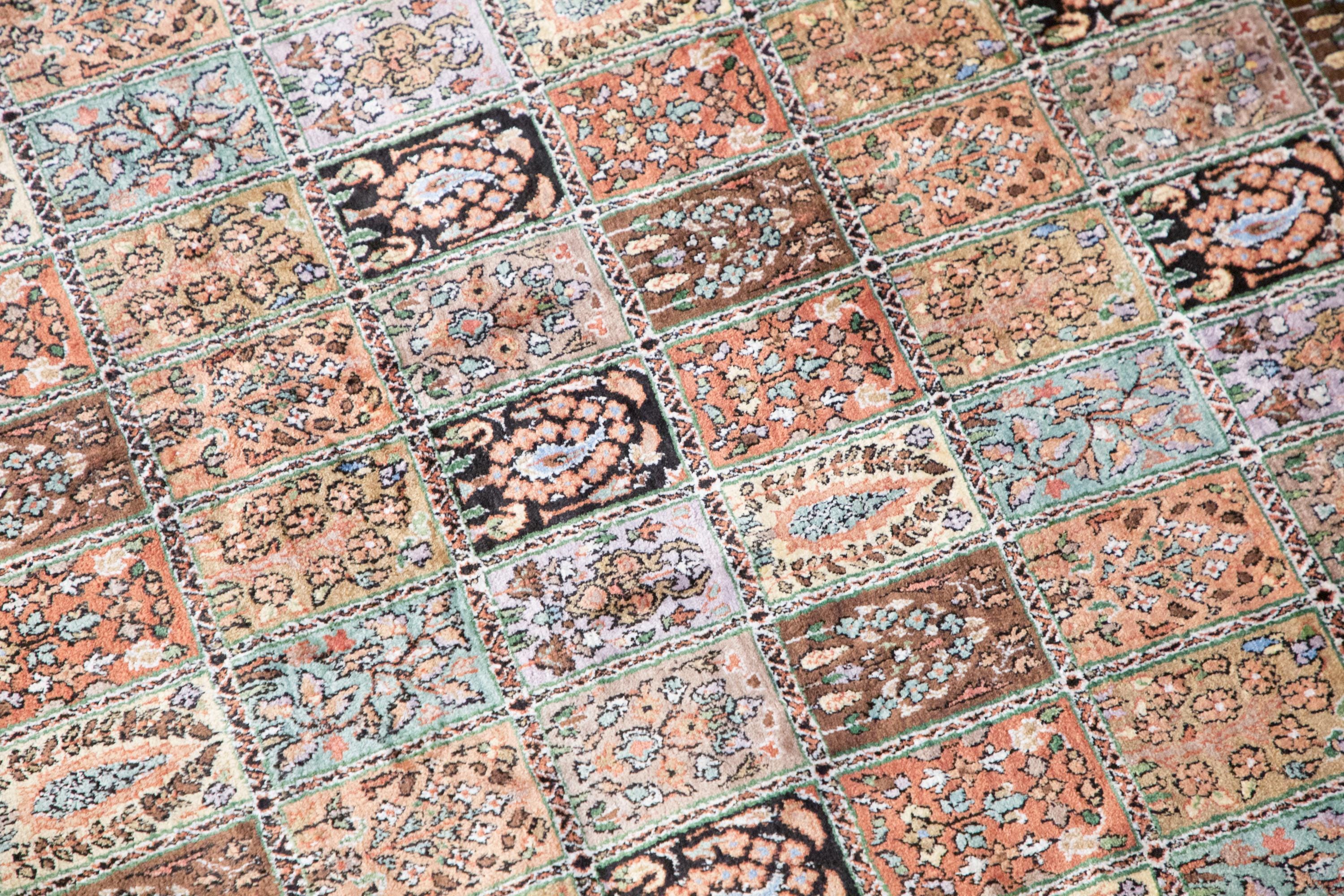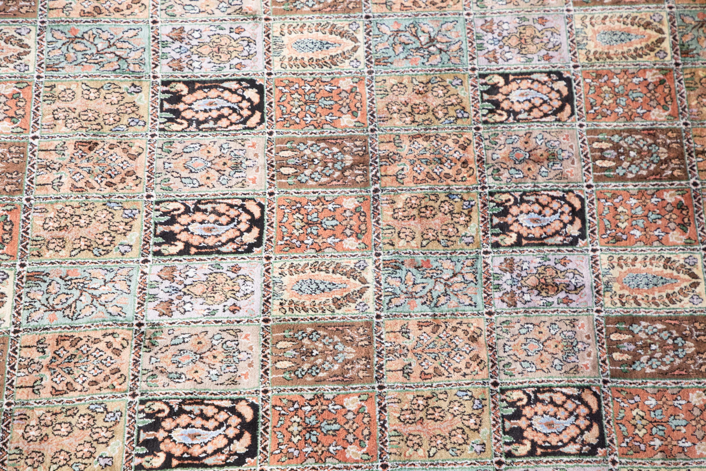 This is an authentic 60+ year old vintage Artificial Silk Cotton and Silk Combination Flosh Rug, preserved in very good condition with light, natural age wear consistent with genuine handmade rugs