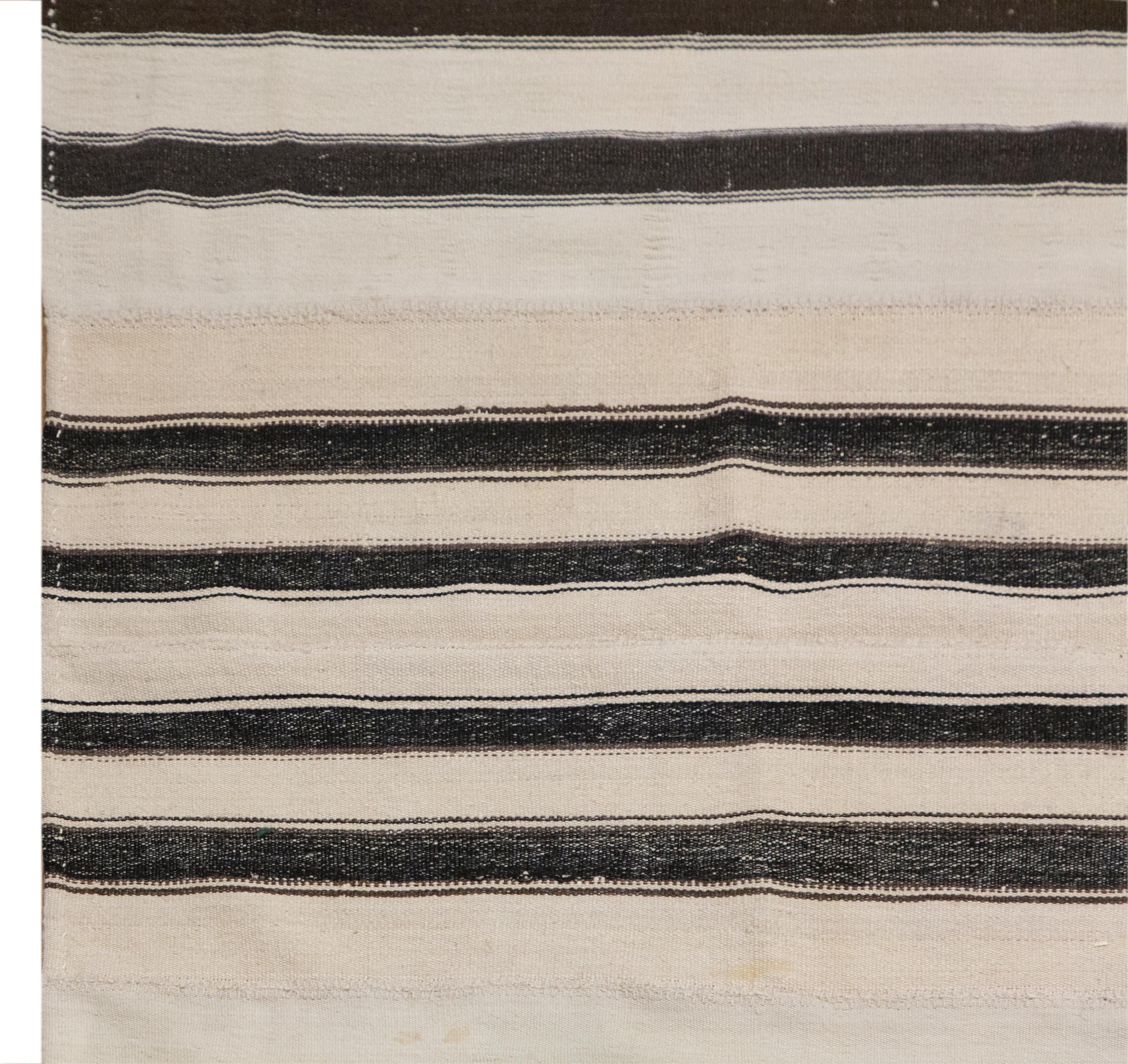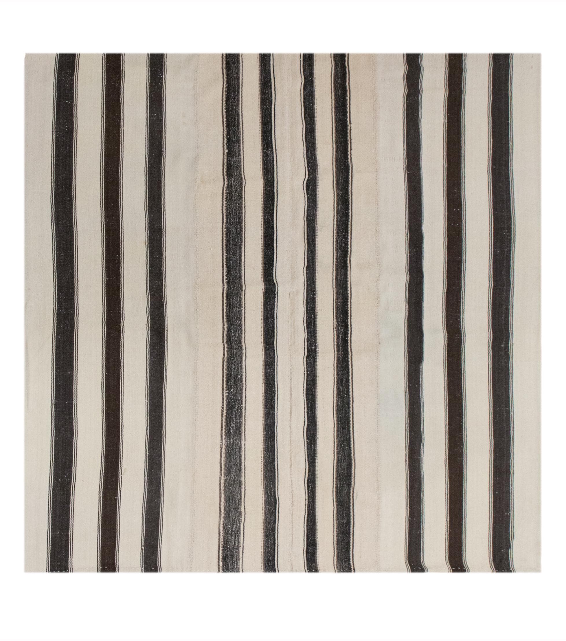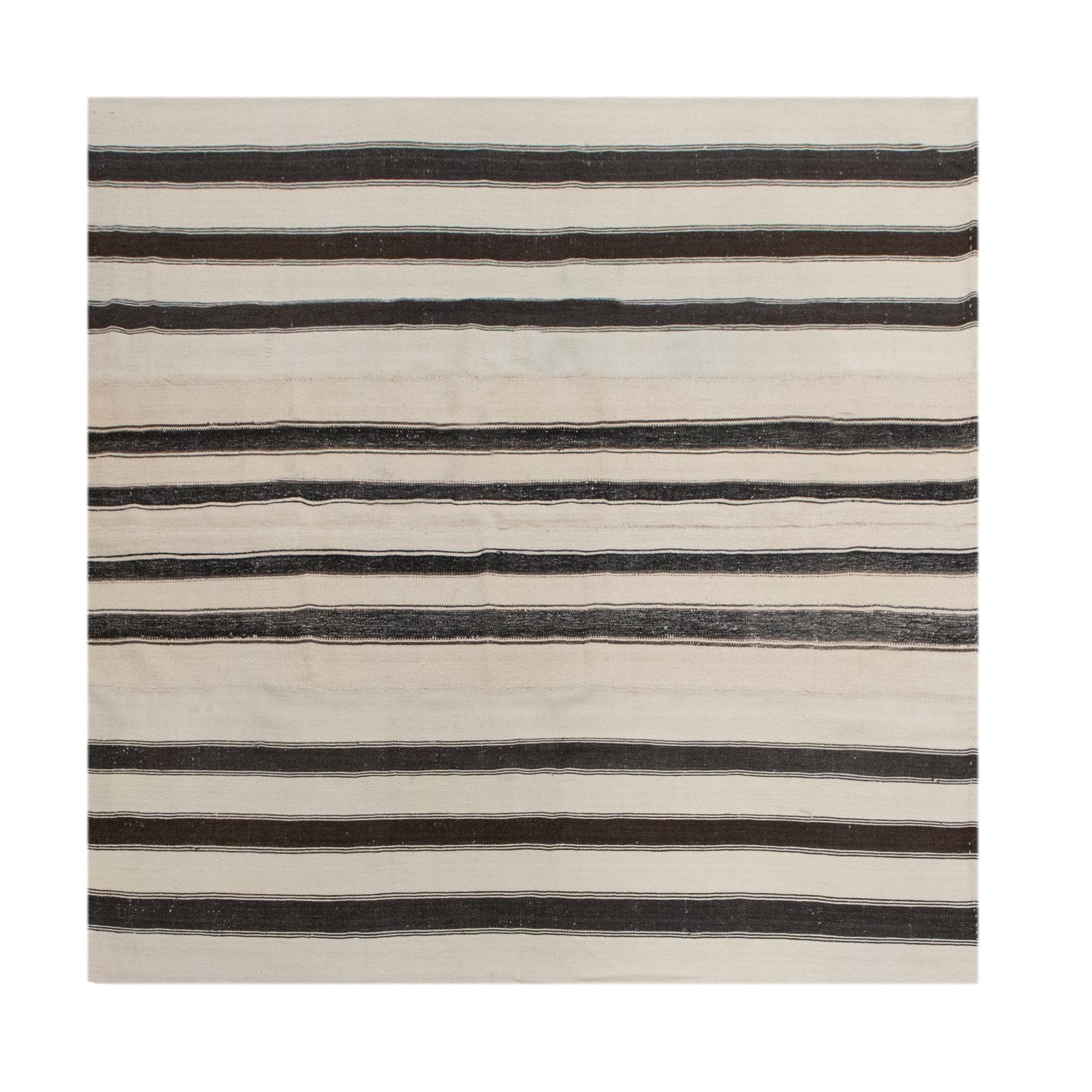 This authentic vintage Turkish Kilim rug is a handwoven piece from the 1960s, made with goat hair and naturally dyed using plants. Its minimalist striped design, calm muted tones, and nearly square proportions make it a great fit for modern, boho, Scandinavian, or traditional interiors. The rug is in excellent condition and ready to use.