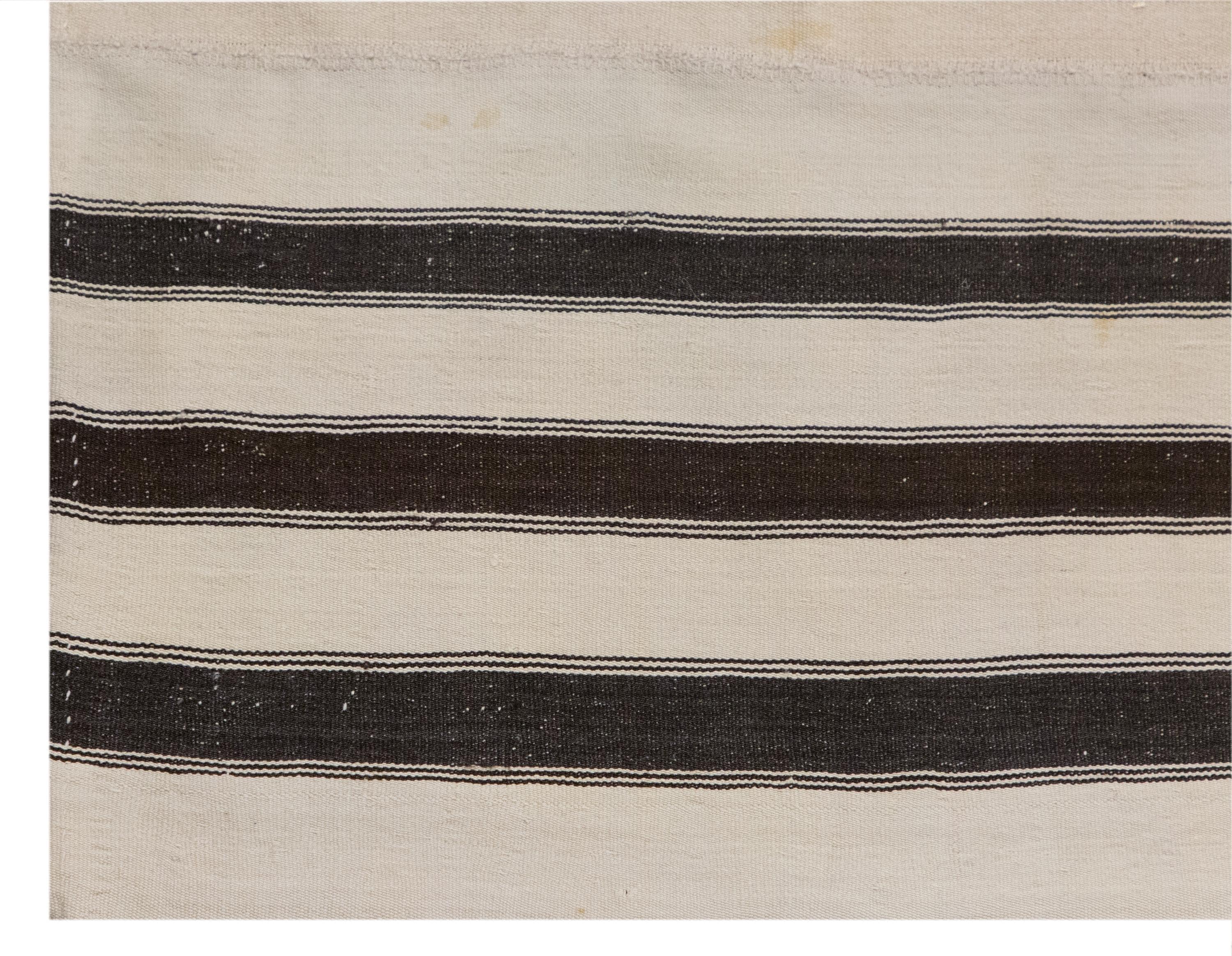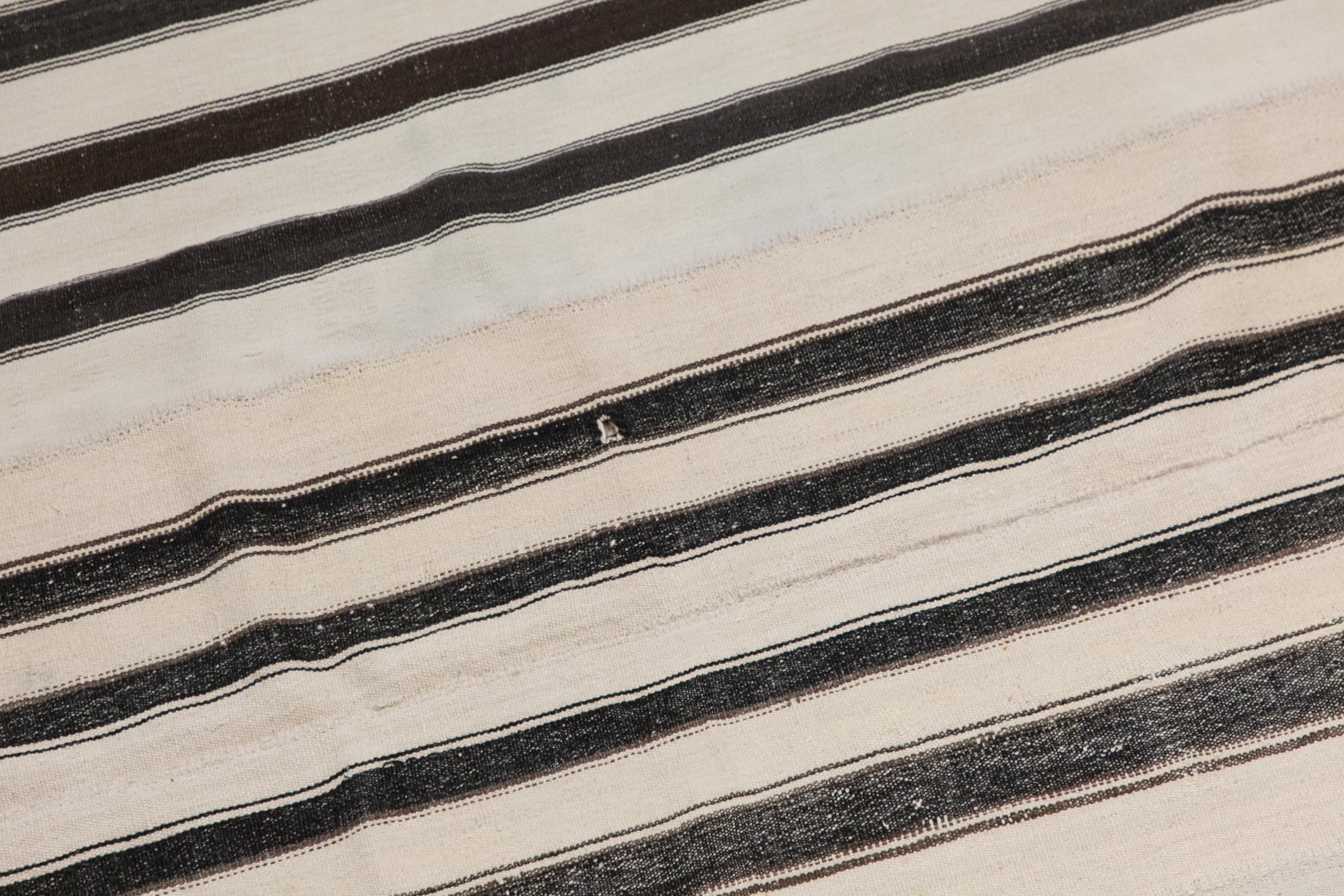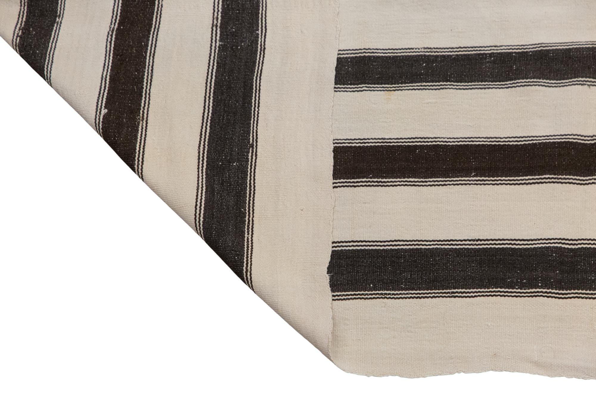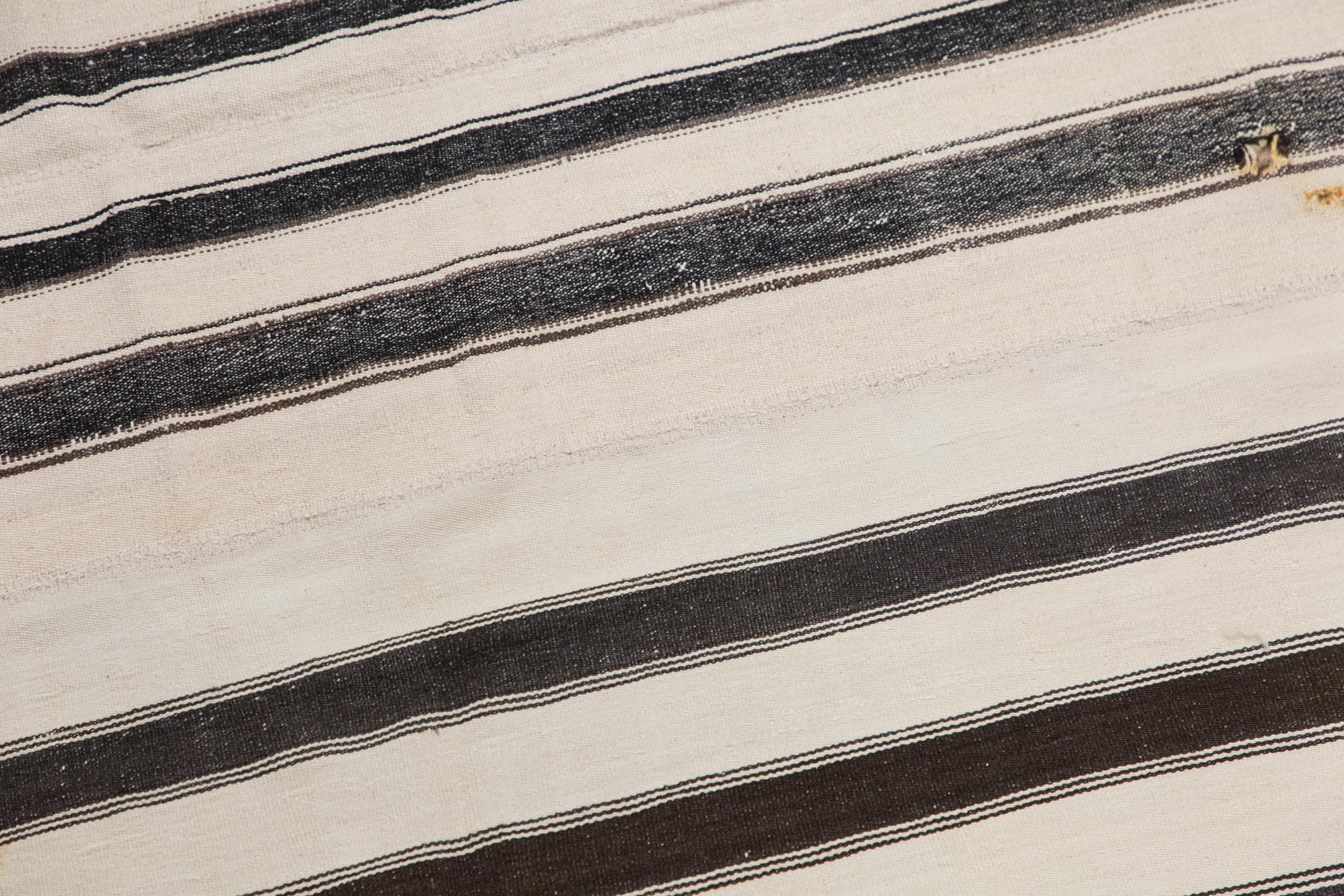 This authentic vintage Turkish Kilim rug is a handwoven piece from the 1960s, made with goat hair and naturally dyed using plants. Its minimalist striped design, calm muted tones, and nearly square proportions make it a great fit for modern, boho, Scandinavian, or traditional interiors. The rug is in excellent condition and ready to use.
