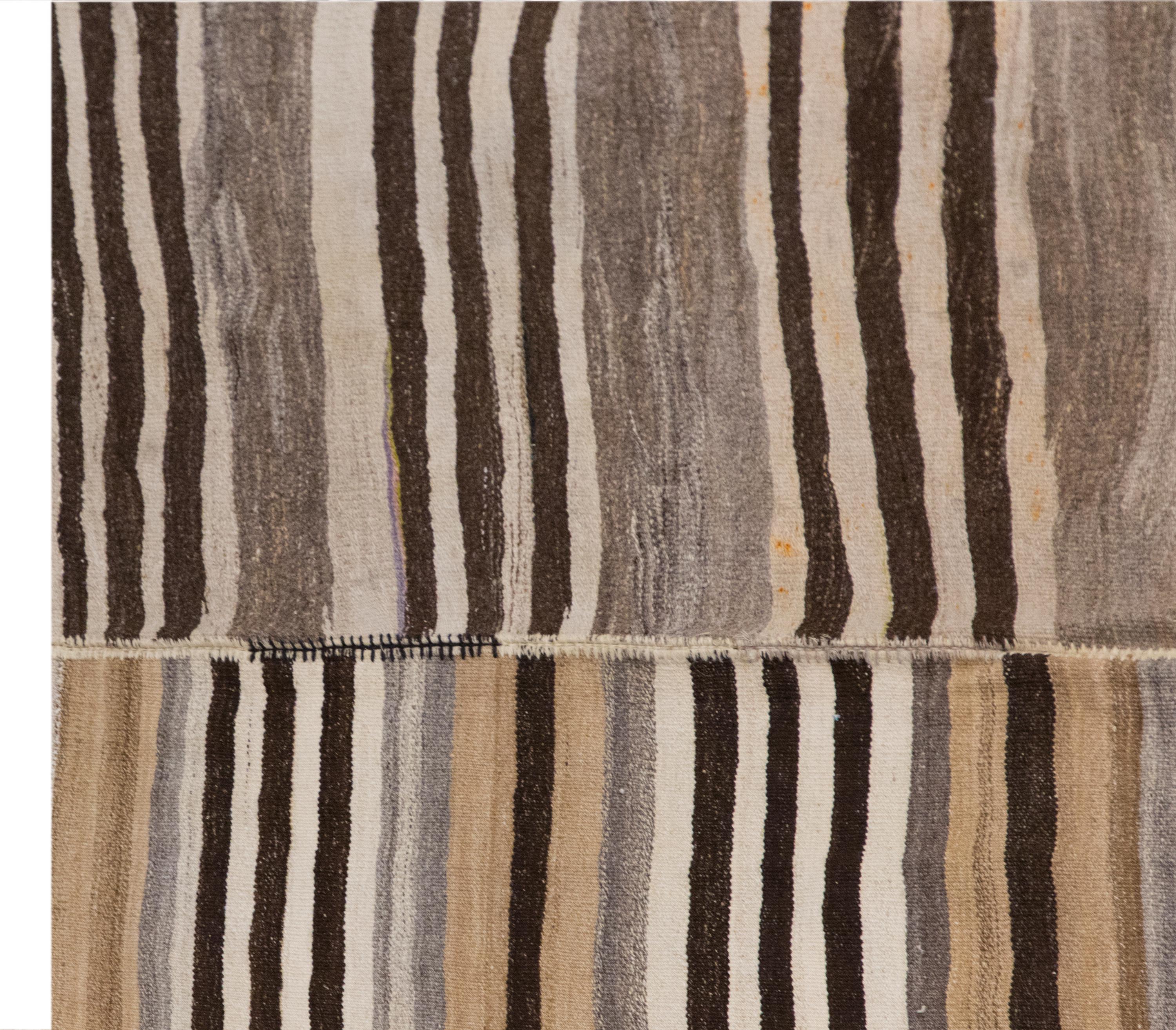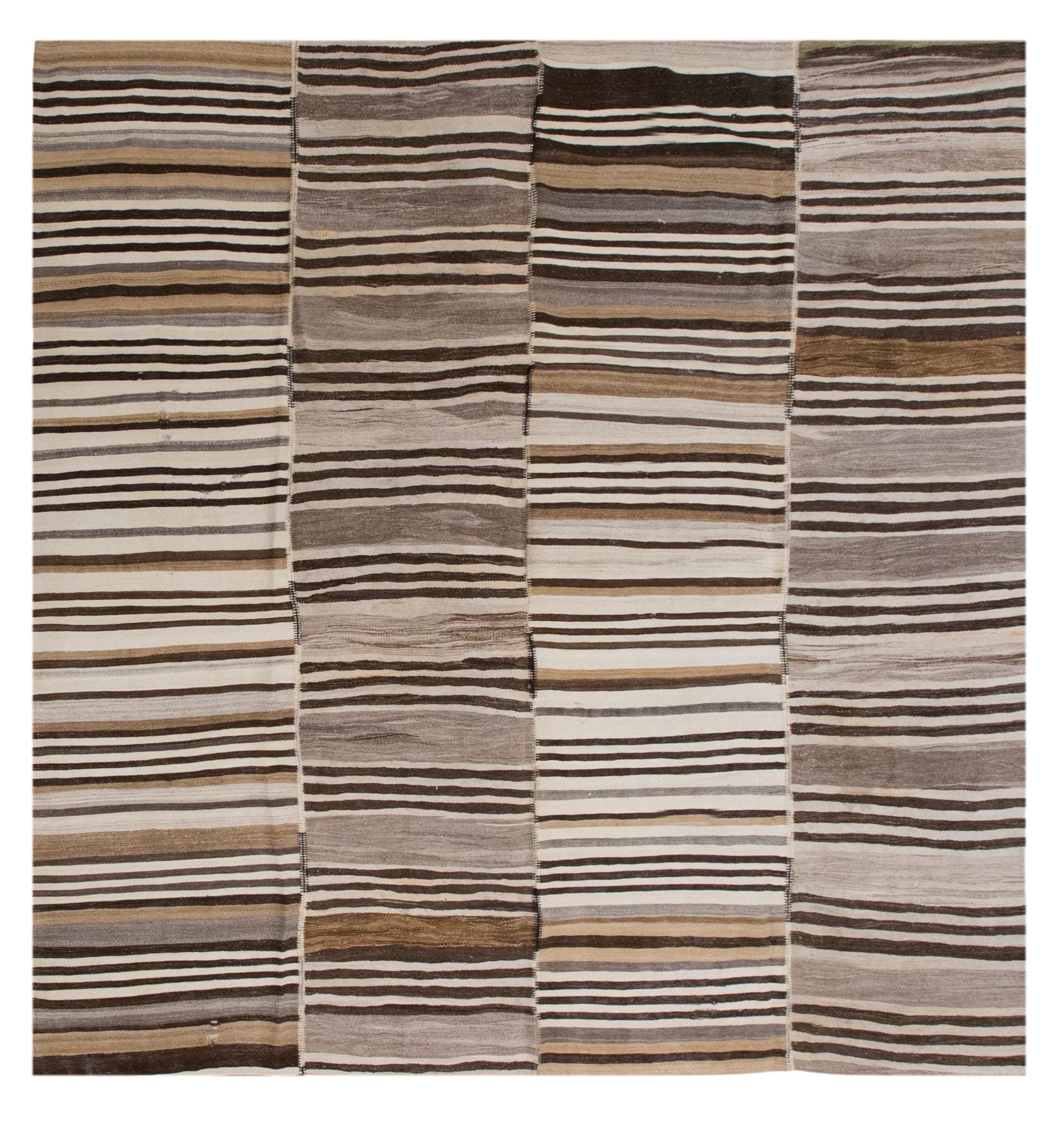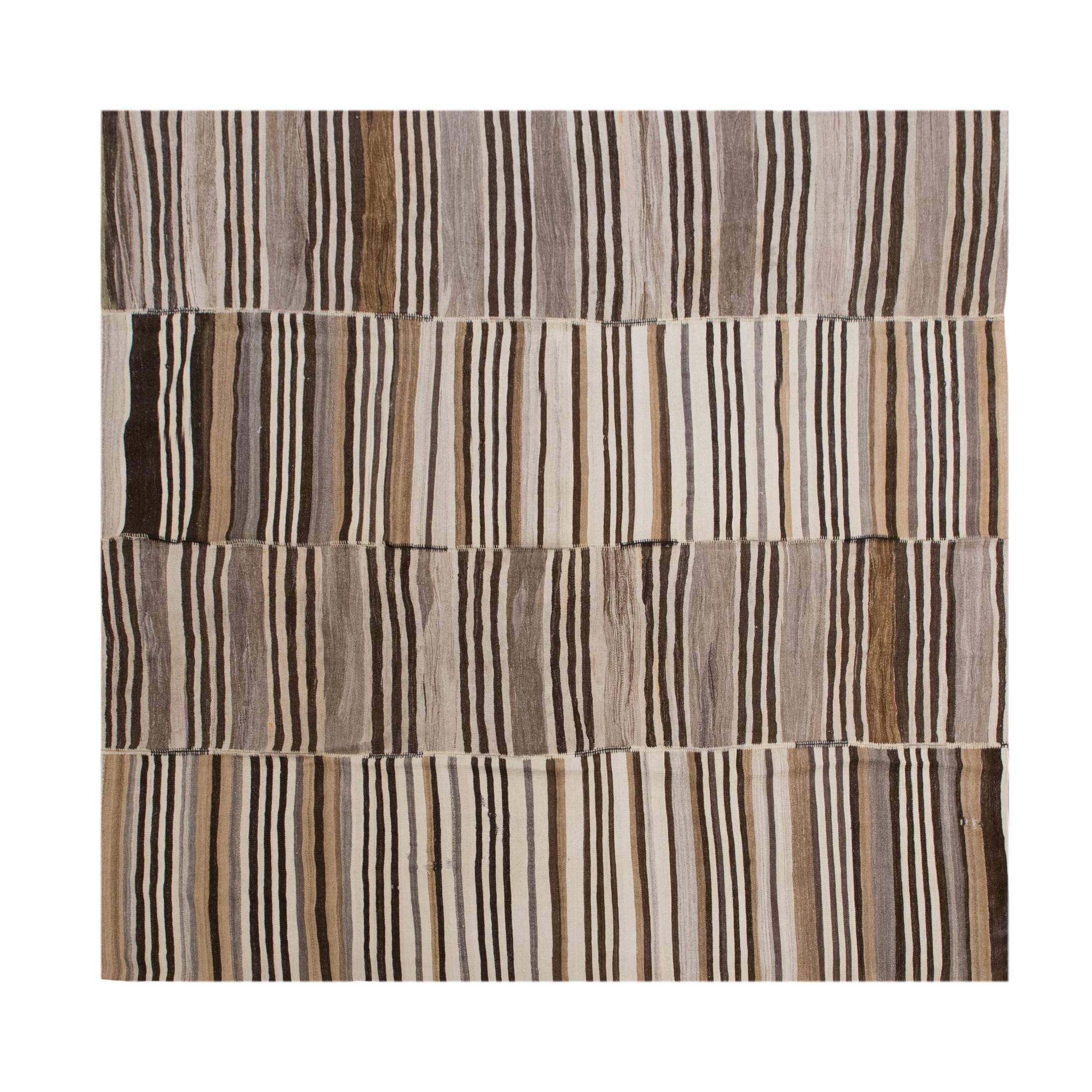 This authentic vintage Turkish Kilim rug is a handwoven piece from the 1960s, crafted with goat hair and naturally dyed using plants. Its minimalist striped design, soft muted tones, and large nearly square format make it a stunning choice for modern, boho, Scandinavian, or traditional interiors. The rug is in excellent condition and ready to use.