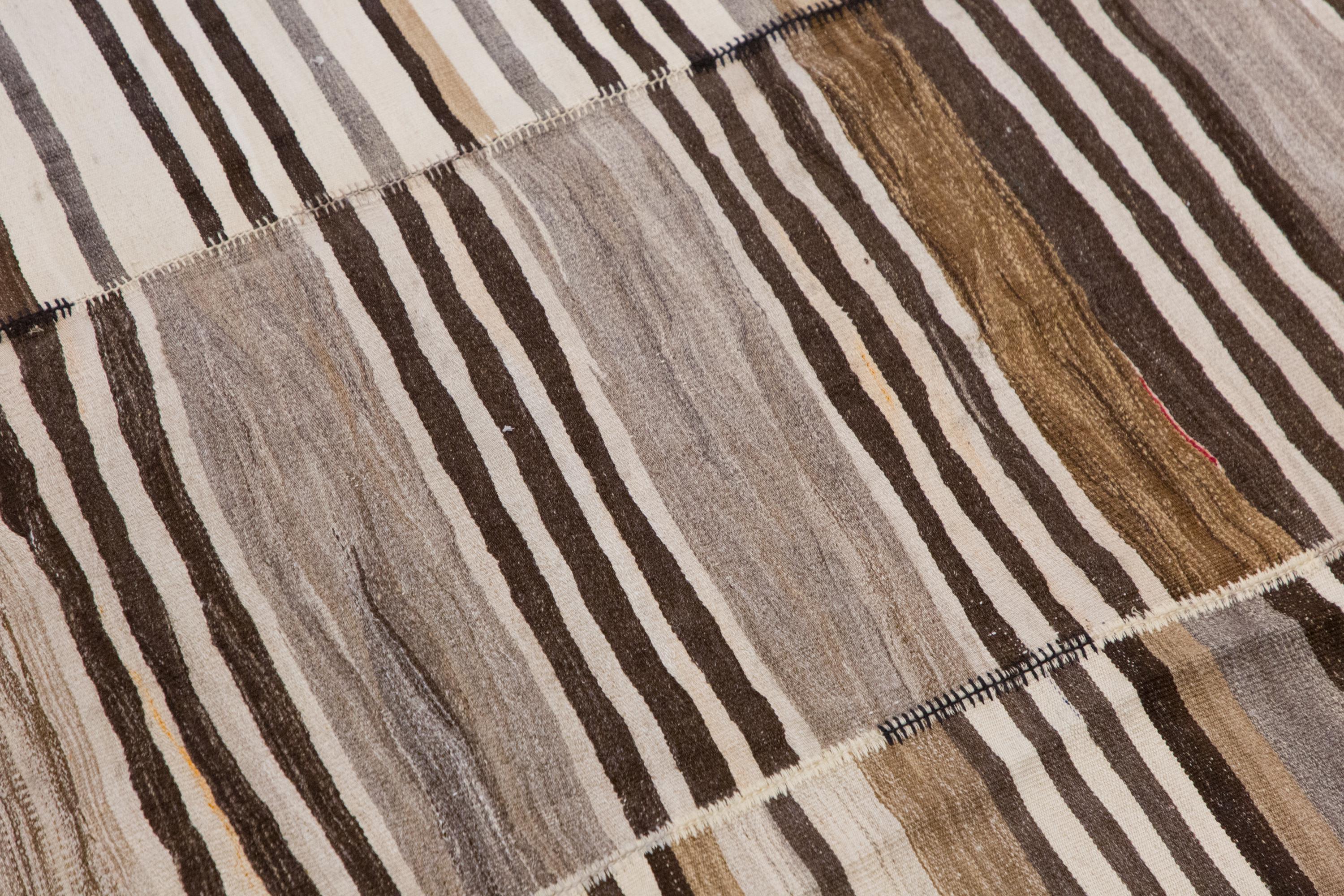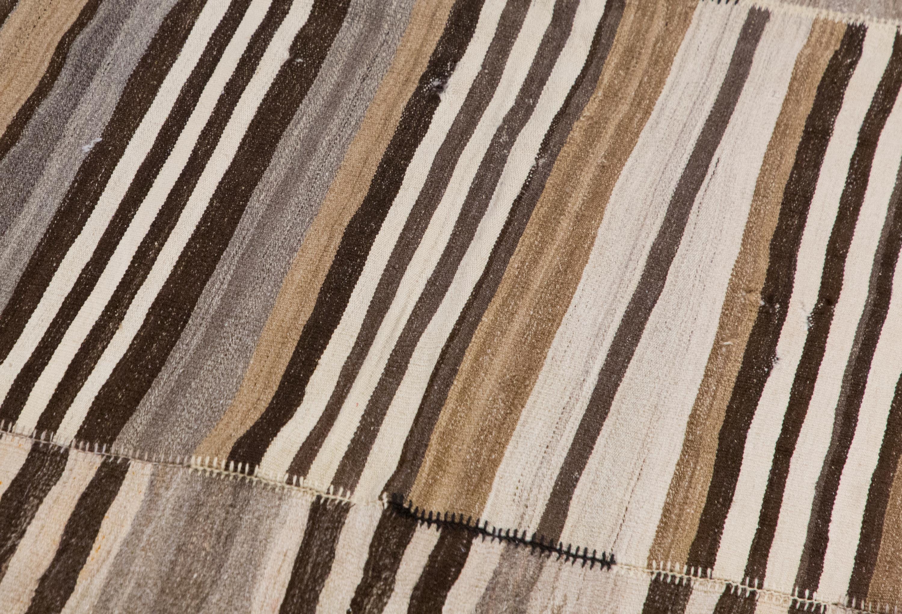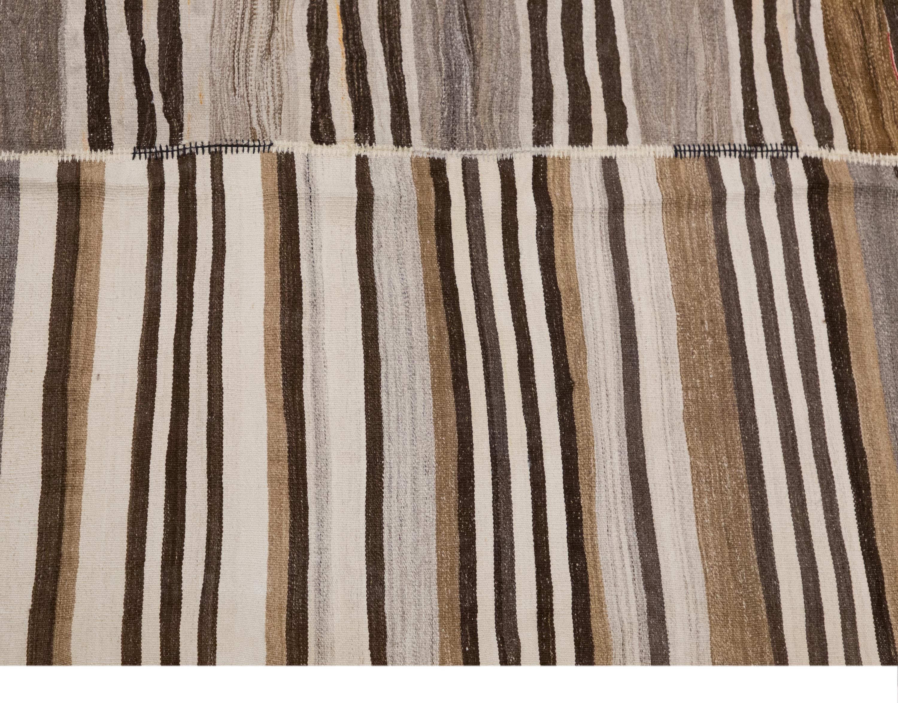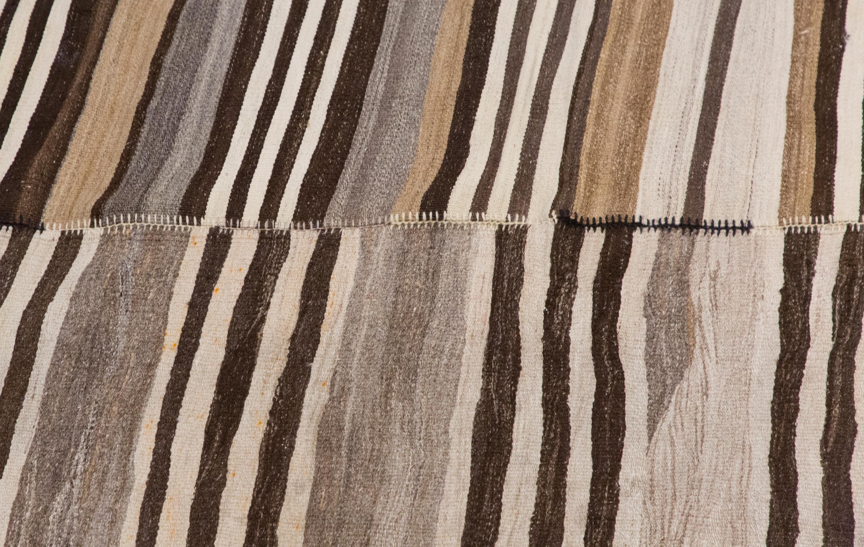 This authentic vintage Turkish Kilim rug is a handwoven piece from the 1960s, crafted with goat hair and naturally dyed using plants. Its minimalist striped design, soft muted tones, and large nearly square format make it a stunning choice for modern, boho, Scandinavian, or traditional interiors. The rug is in excellent condition and ready to use.