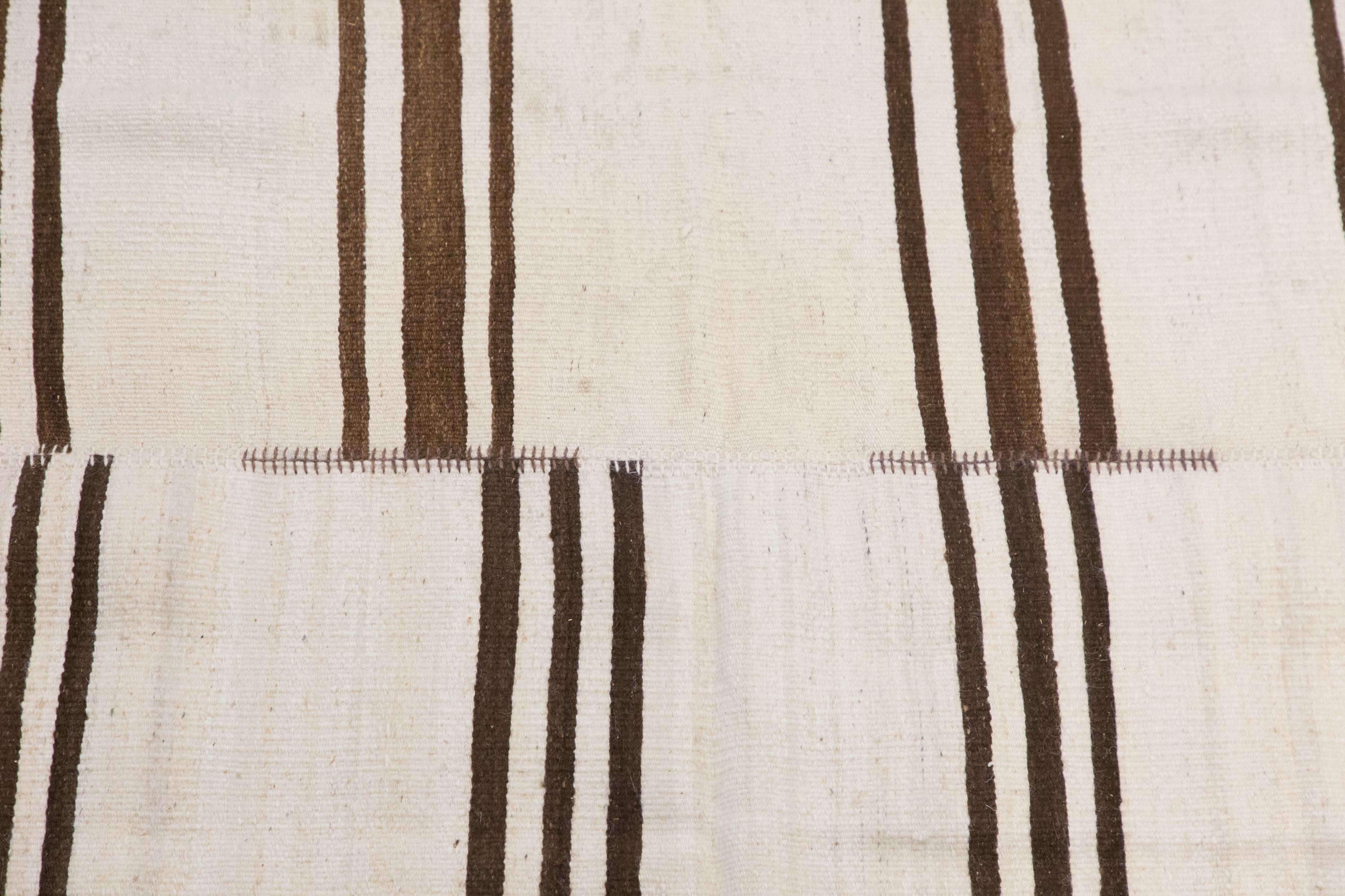 This authentic vintage Turkish Kilim rug is a handwoven piece from the 1960s, crafted with goat hair and naturally dyed using plants. Its minimalist striped design, soft muted tones, and medium rectangular size make it ideal for living rooms, bedrooms, or layered rug setups. The rug is in excellent condition and ready to use.