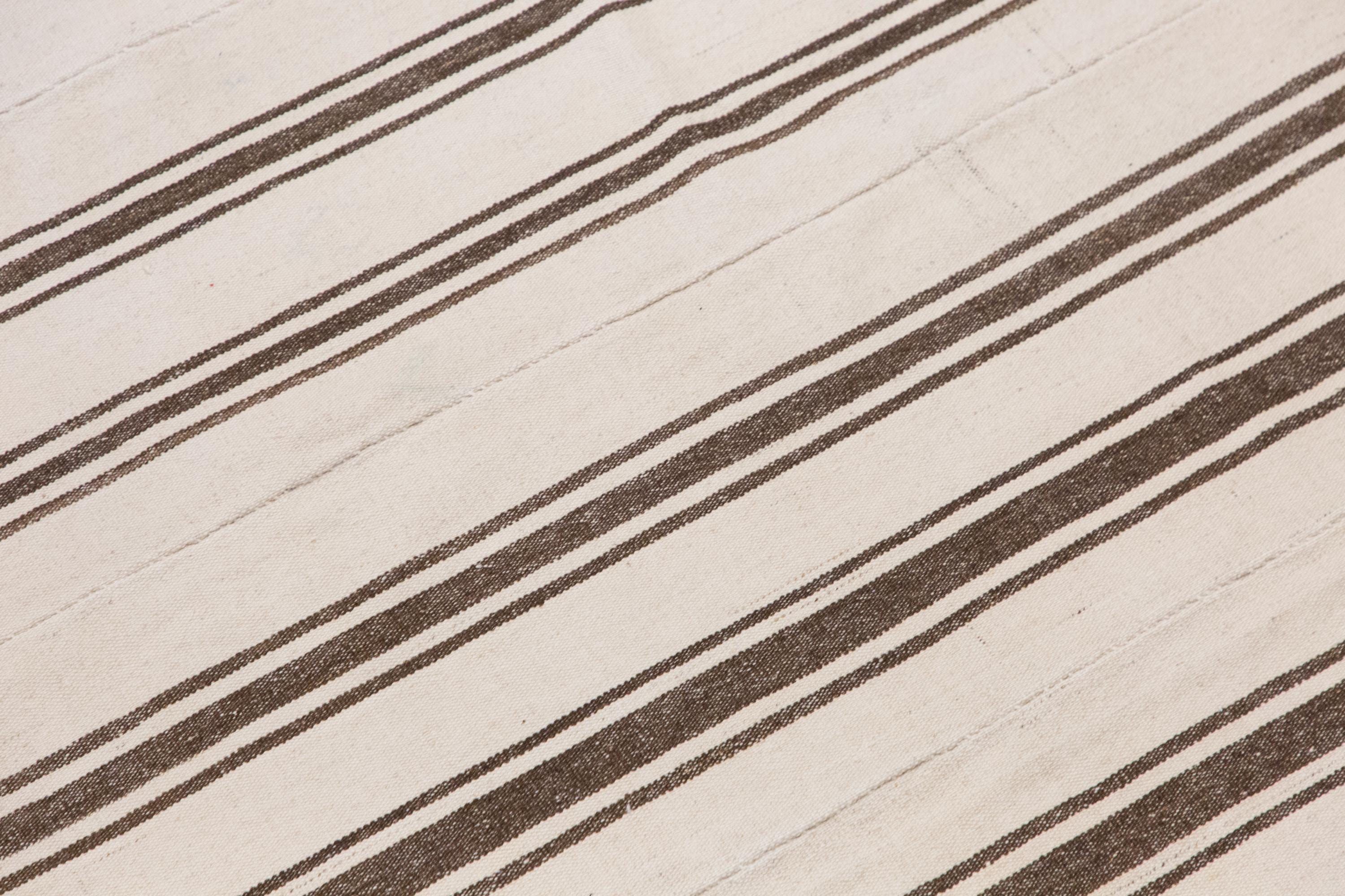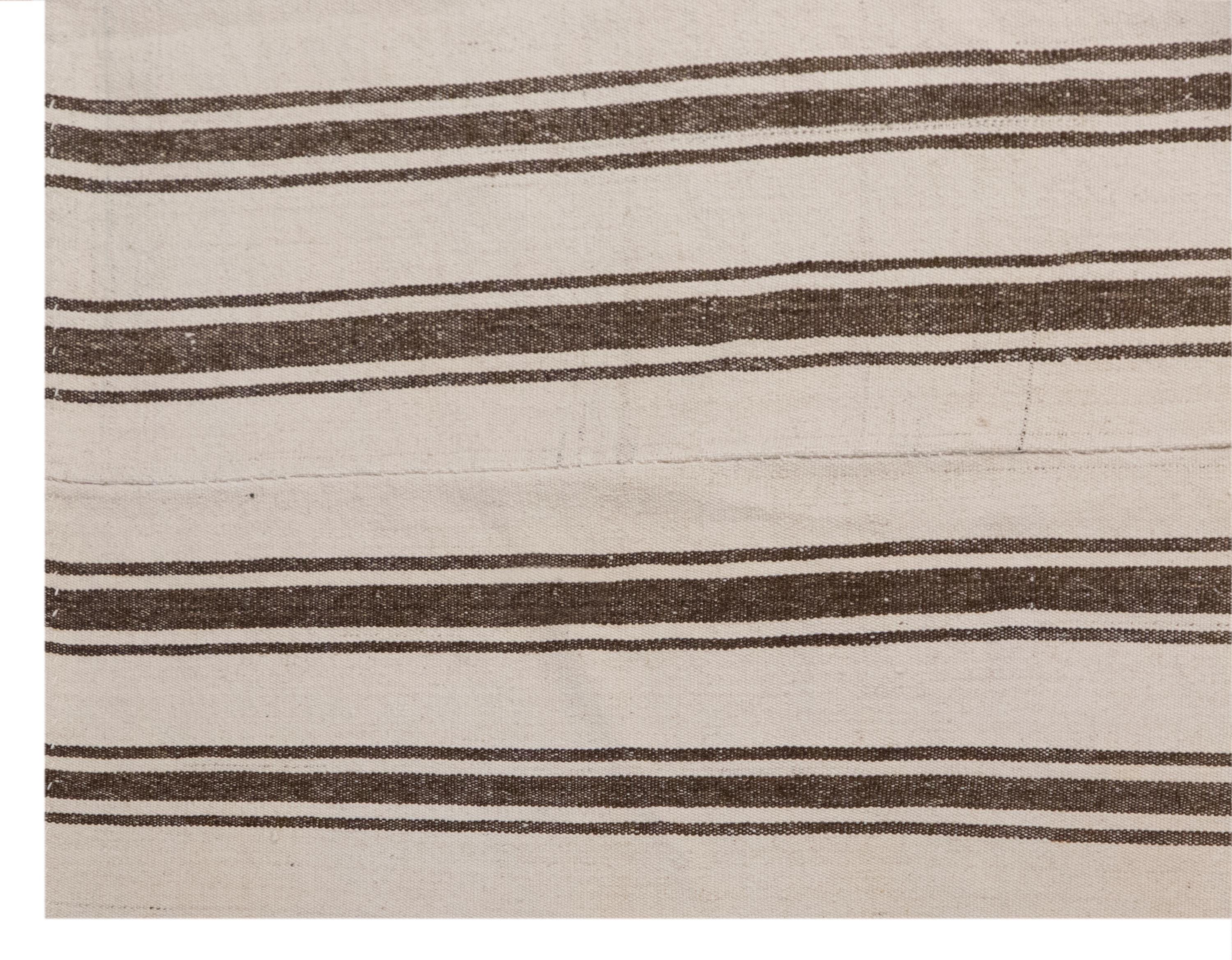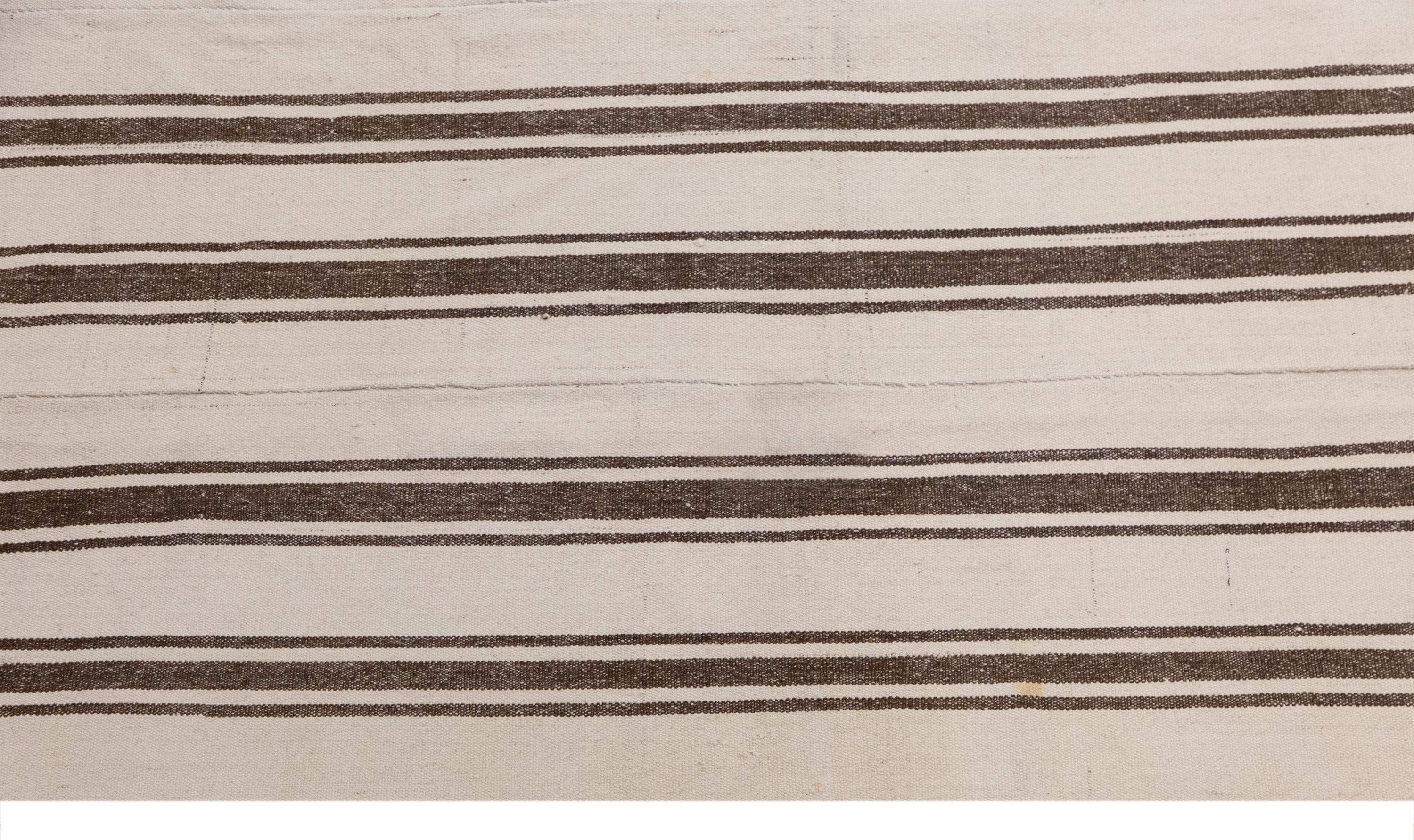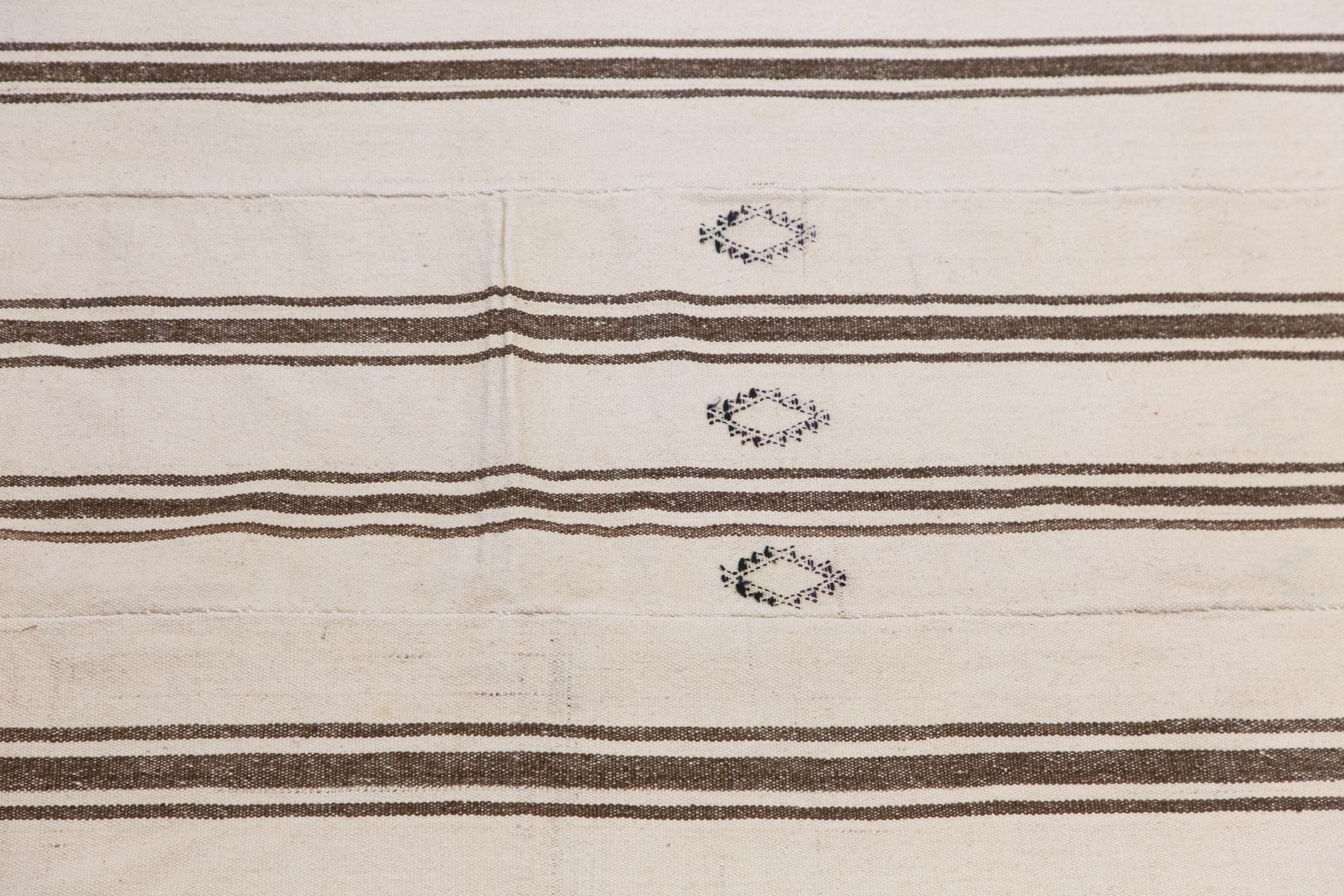 This authentic vintage Turkish Kilim rug is a handwoven piece from the 1960s, crafted with goat hair and naturally dyed using plants. Its minimalist striped design, soft muted tones, and long rectangular size make it perfect for living rooms, hallways, or statement interiors. The rug is in excellent condition and ready to use.