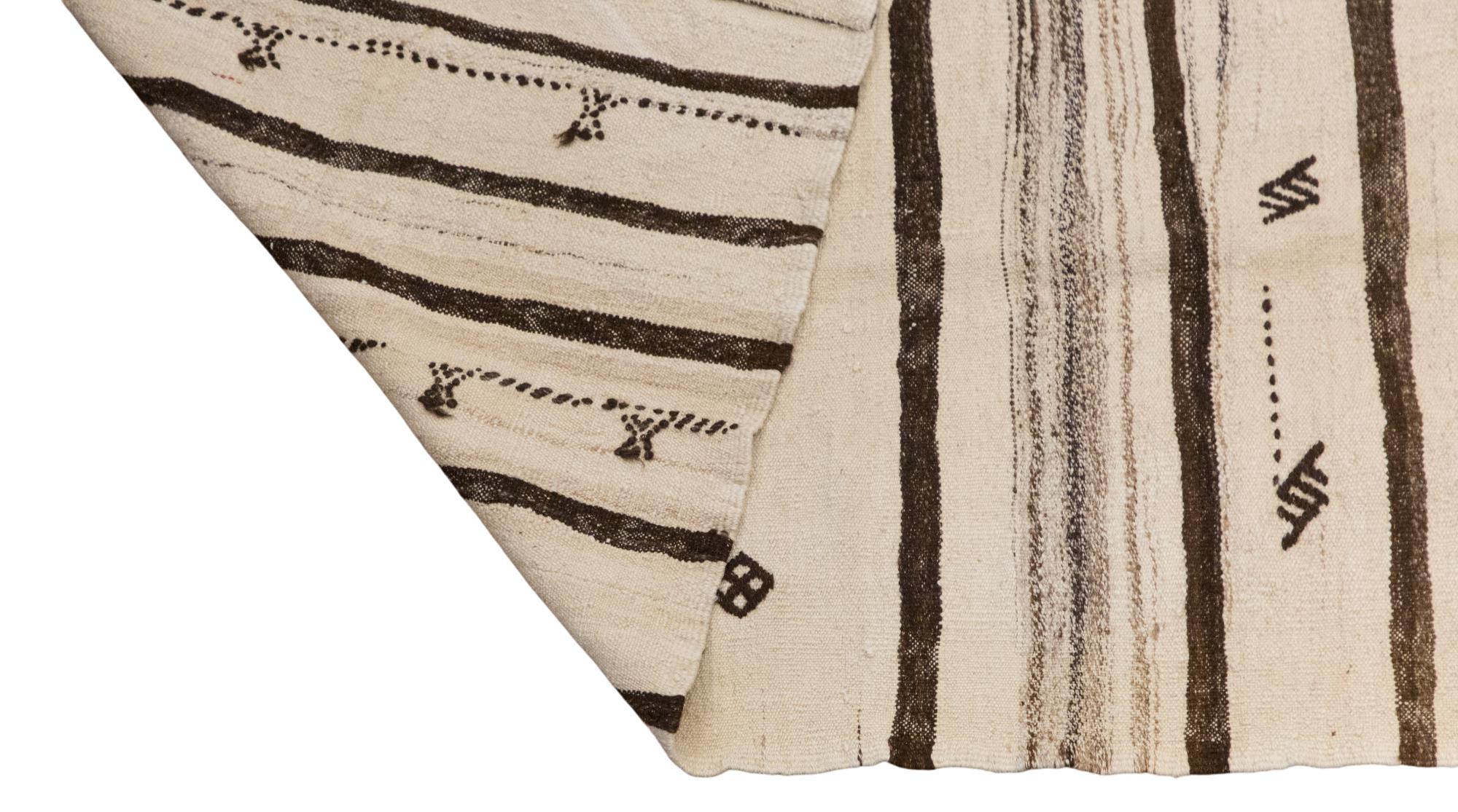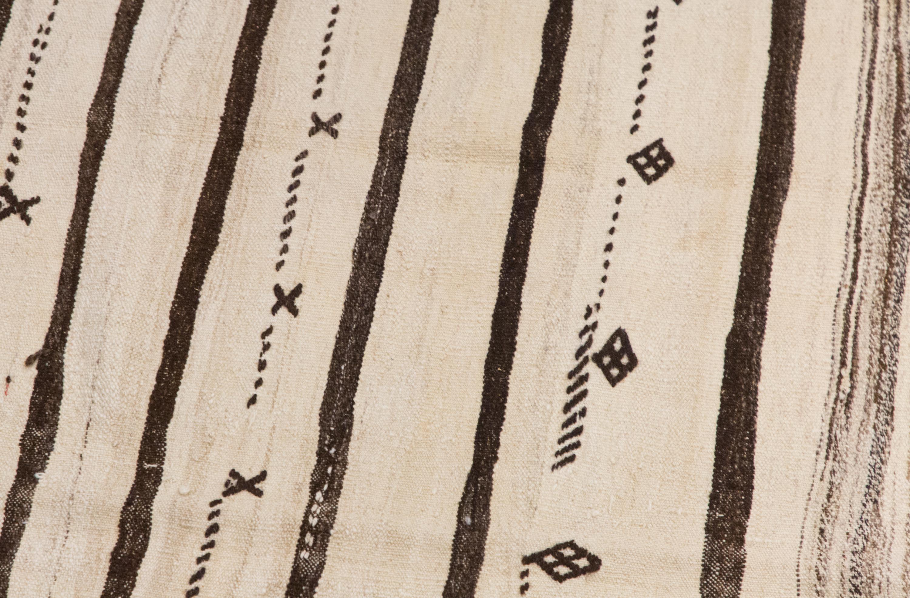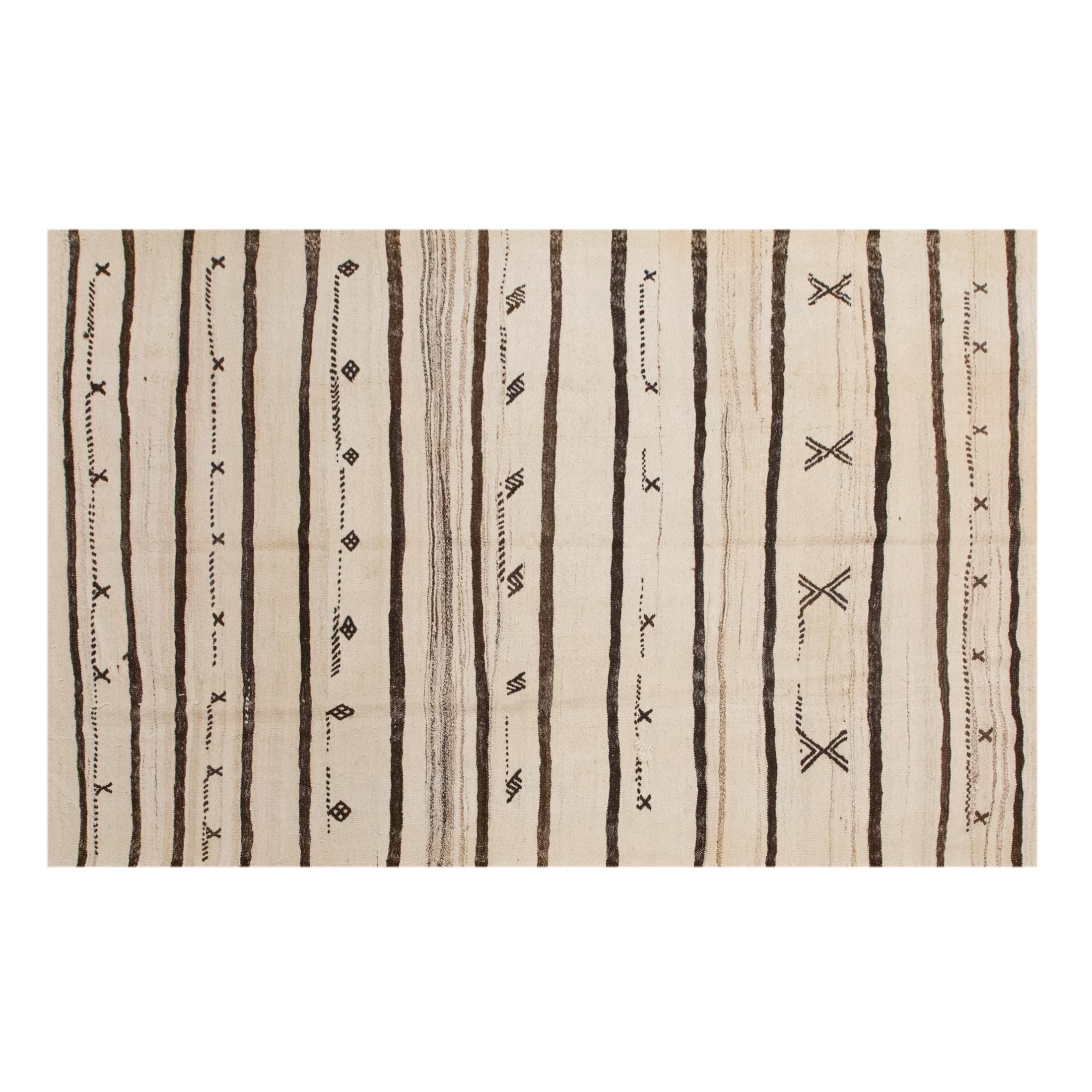 This authentic vintage Turkish Kilim rug is a handwoven piece from the 1960s, crafted with goat hair and naturally dyed using plants. Its minimalist striped design, soft muted tones, and medium rectangular size make it ideal for living rooms, bedrooms, or layered rug setups. The rug is in excellent condition and ready to use.