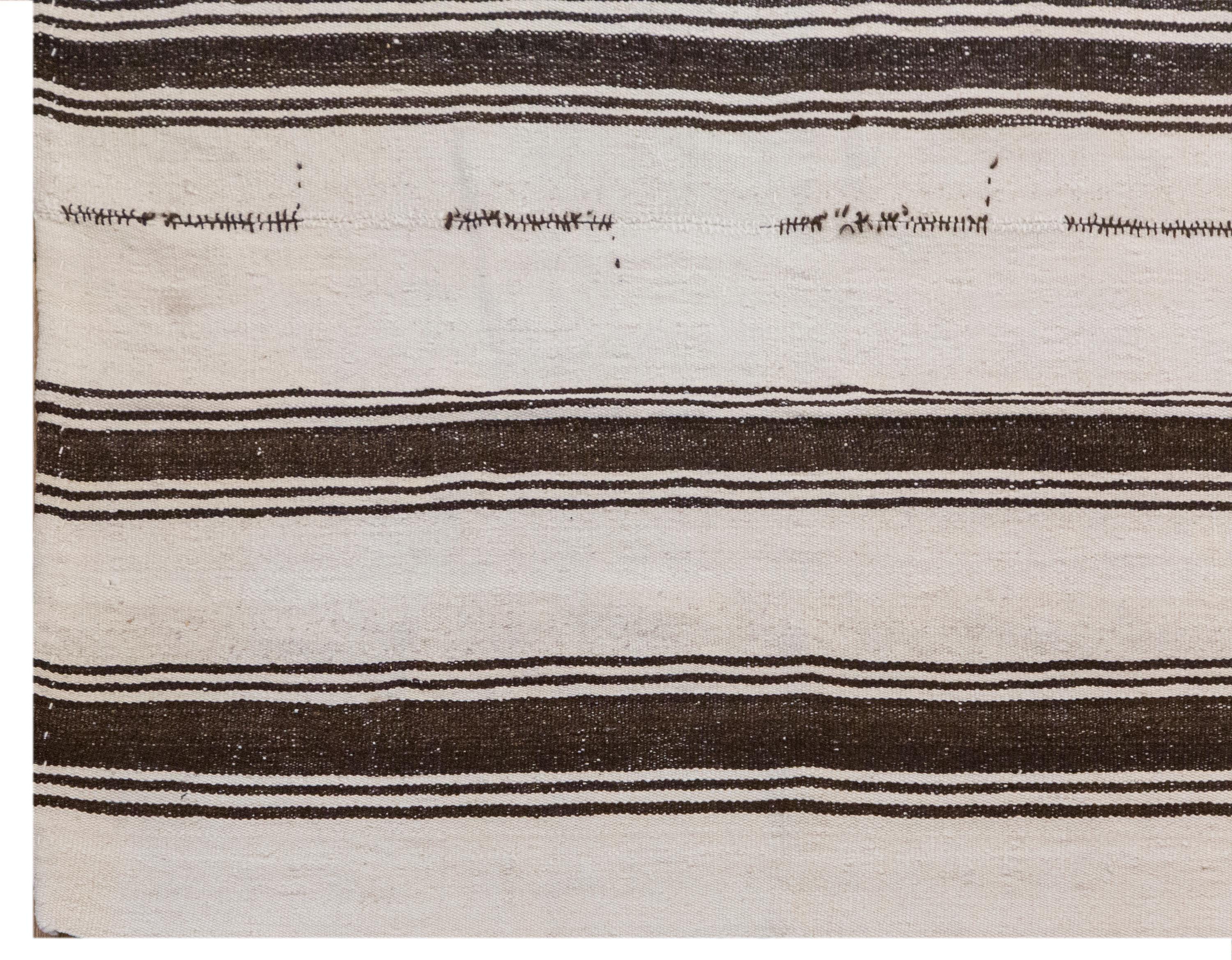 This authentic vintage Turkish Kilim rug is a handwoven piece from the 1960s, crafted with goat hair and naturally dyed using plants. Its minimalist striped design, soft muted tones, and large rectangular size make it perfect for living rooms, bedrooms, or accent spaces. The rug is in excellent condition and ready to use.