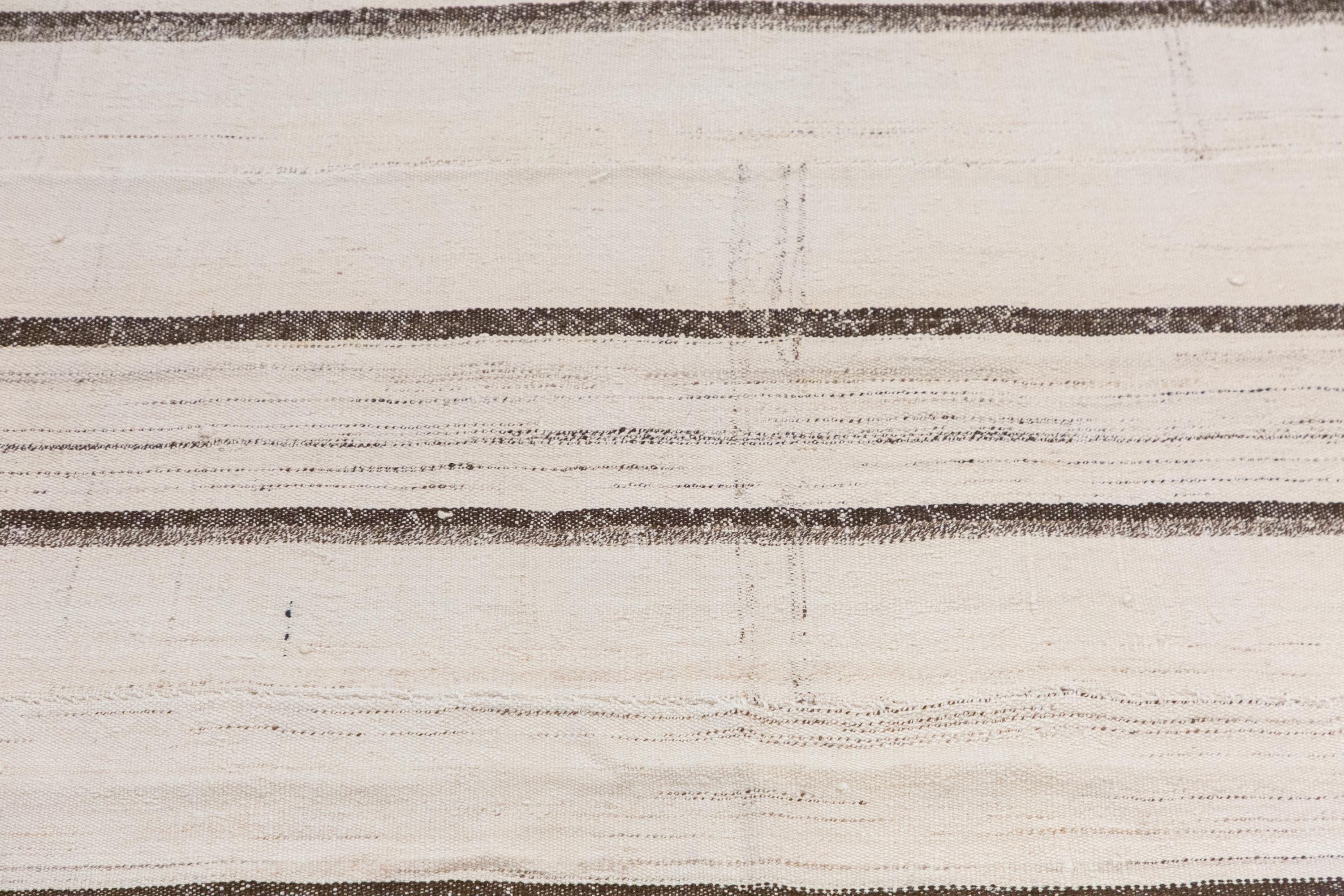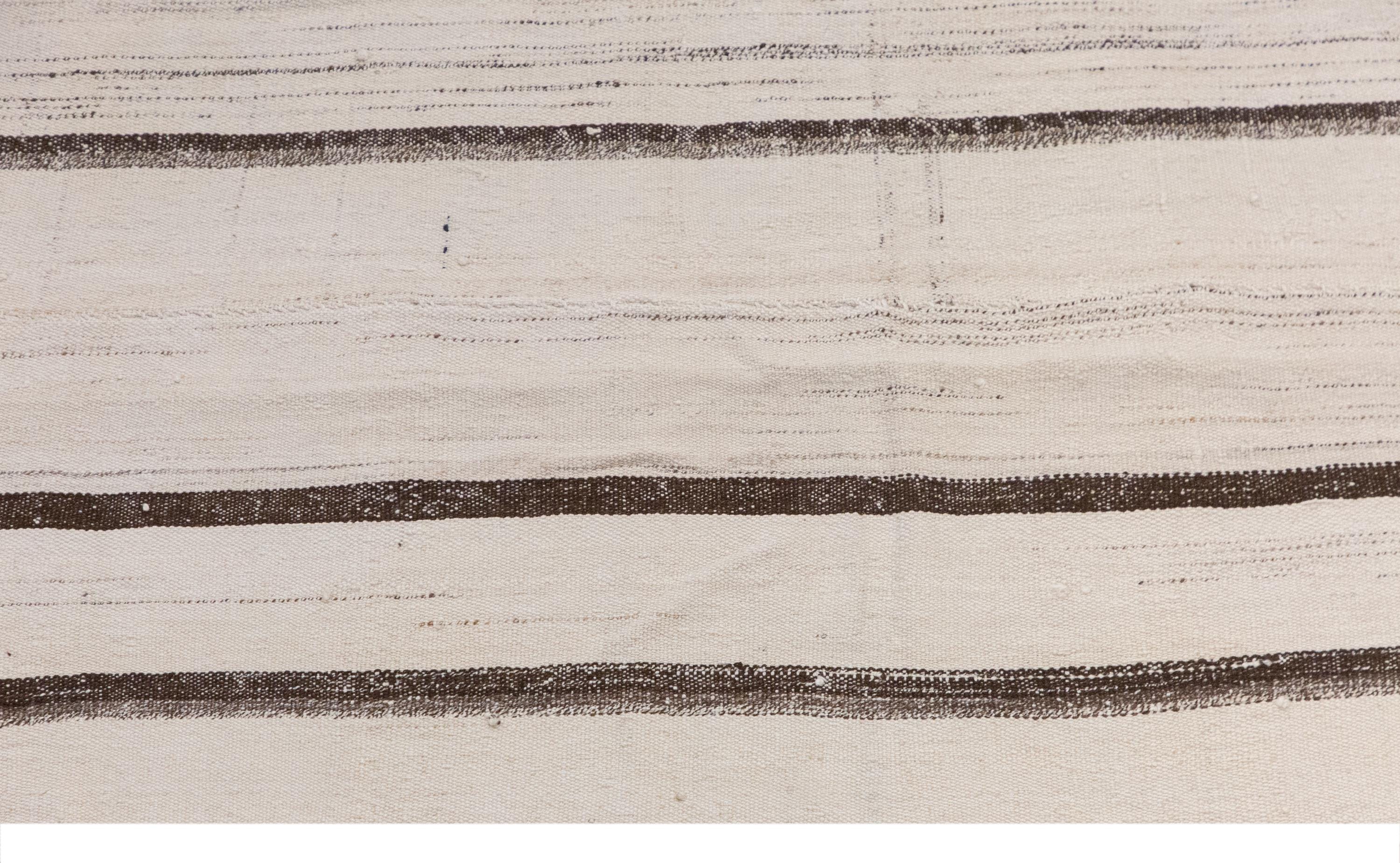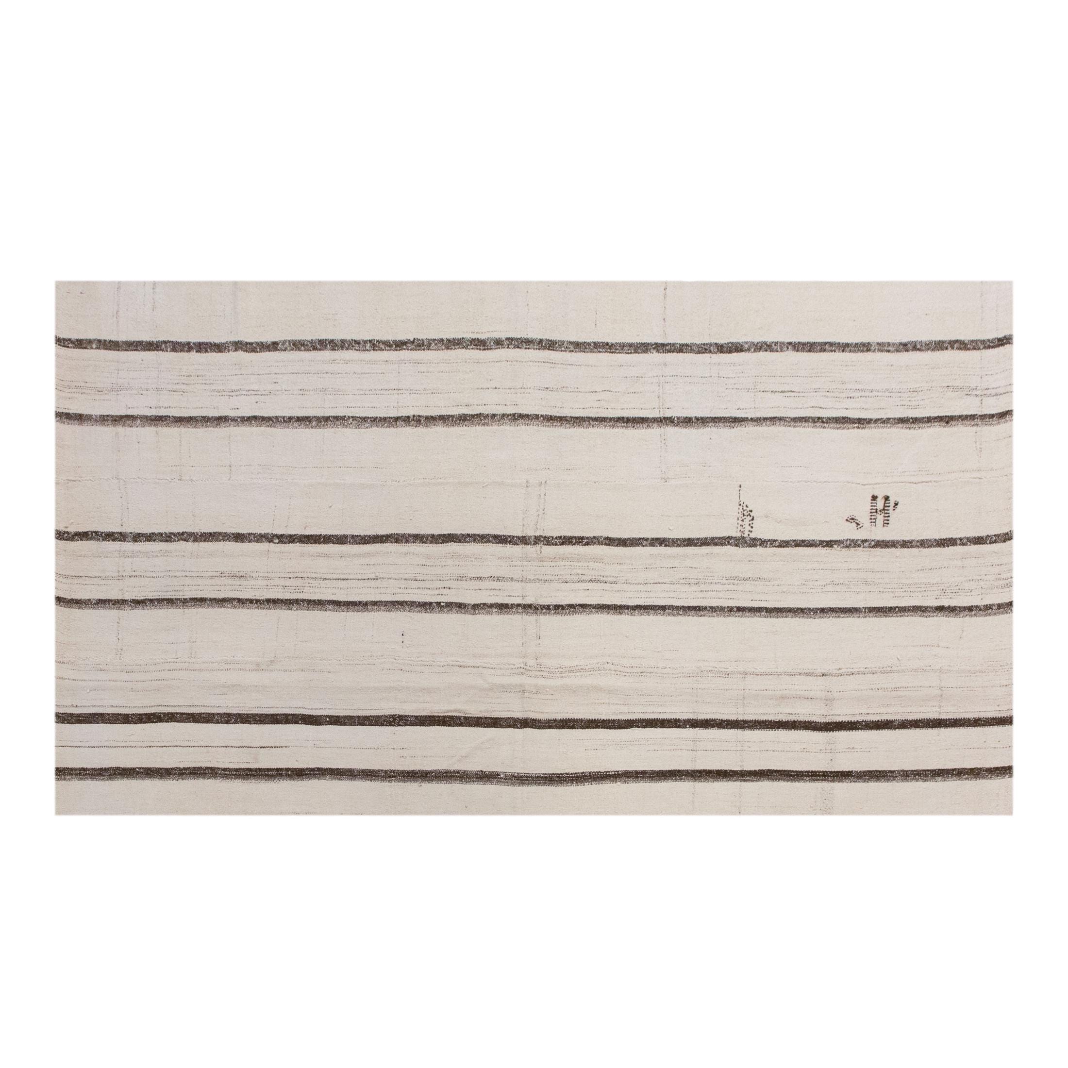 This authentic vintage Turkish Kilim rug is a handwoven piece from the 1960s, crafted with goat hair and naturally dyed using plants. Its minimalist striped design, soft muted tones, and rectangular size make it perfect for living rooms, bedrooms, or accent spaces. The rug is in excellent condition and ready to use.
