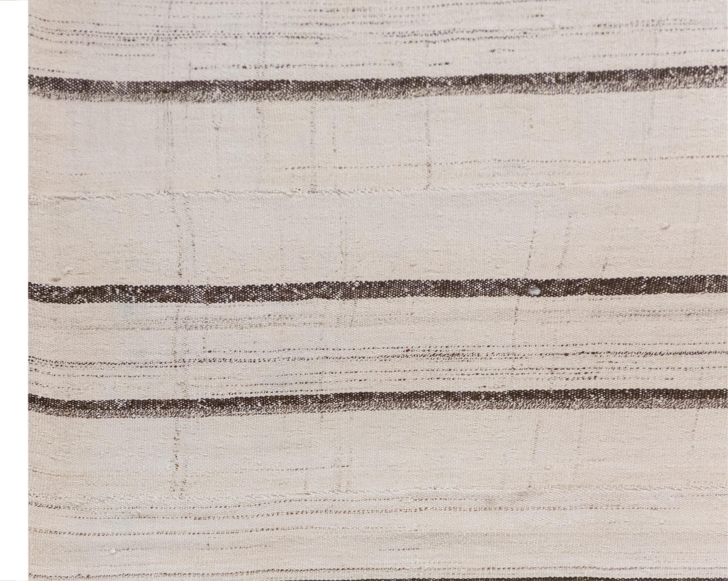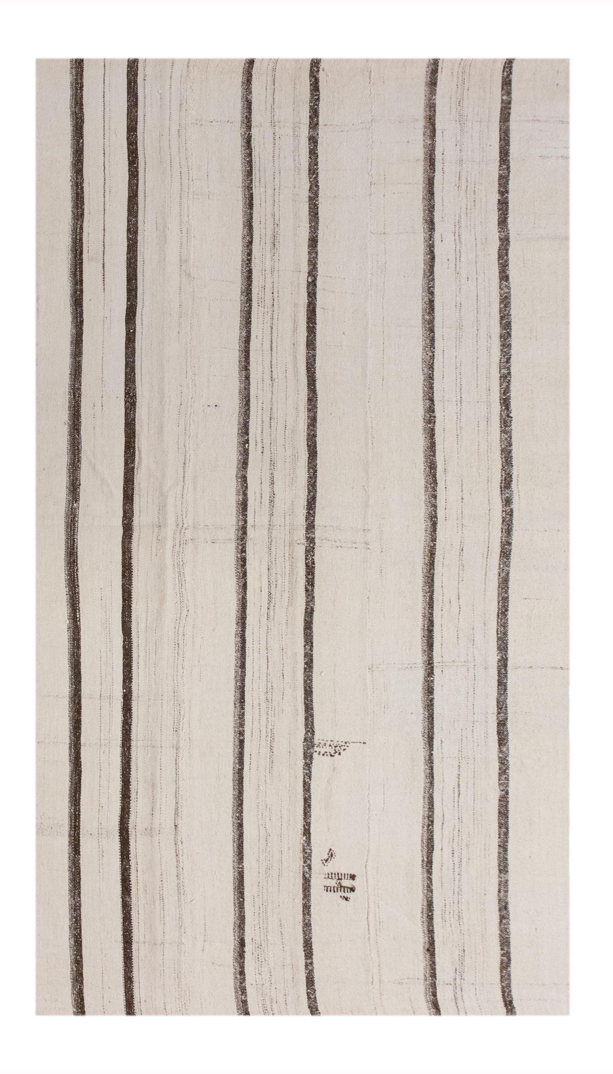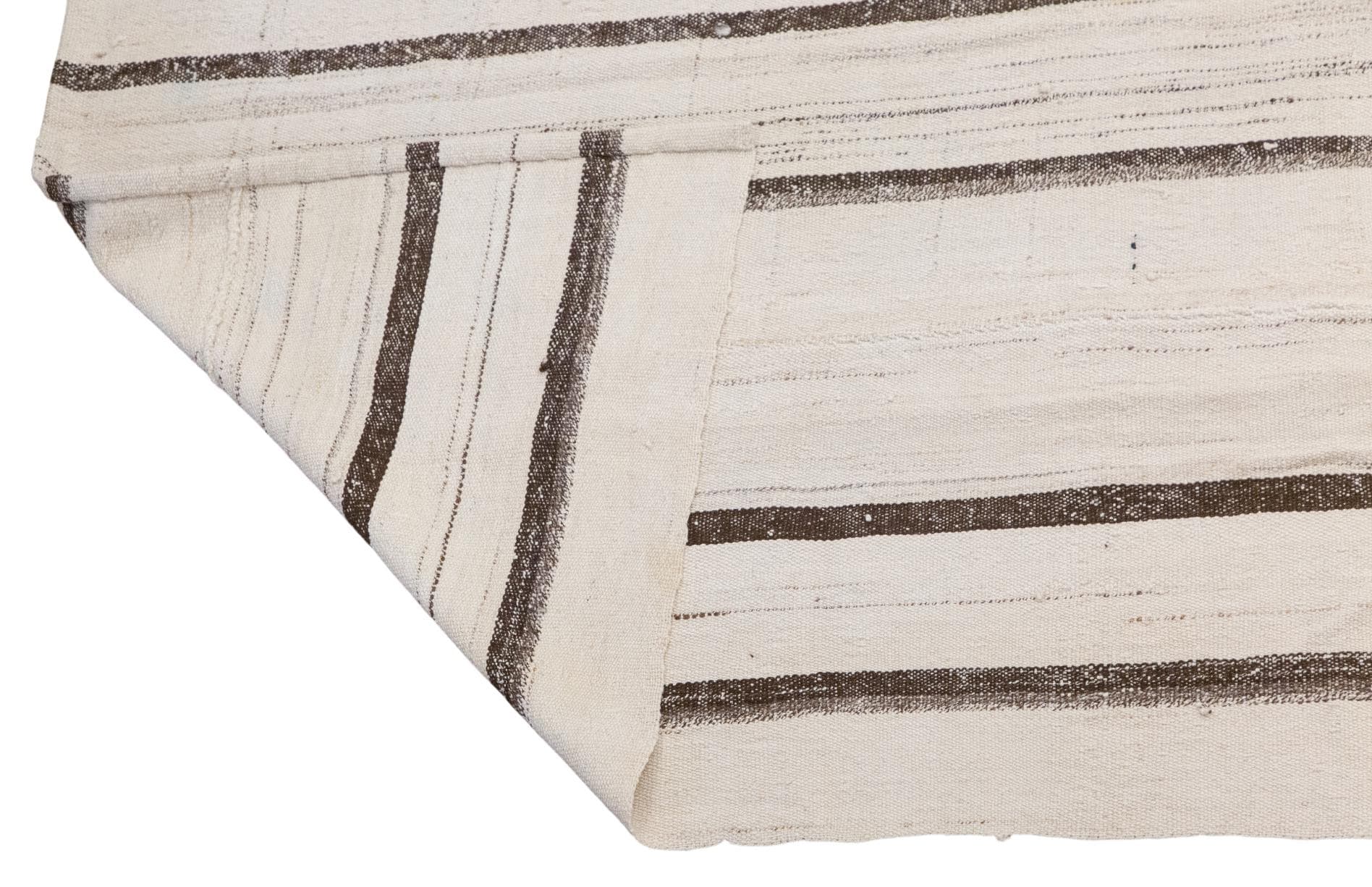 This authentic vintage Turkish Kilim rug is a handwoven piece from the 1960s, crafted with goat hair and naturally dyed using plants. Its minimalist striped design, soft muted tones, and rectangular size make it perfect for living rooms, bedrooms, or accent spaces. The rug is in excellent condition and ready to use.