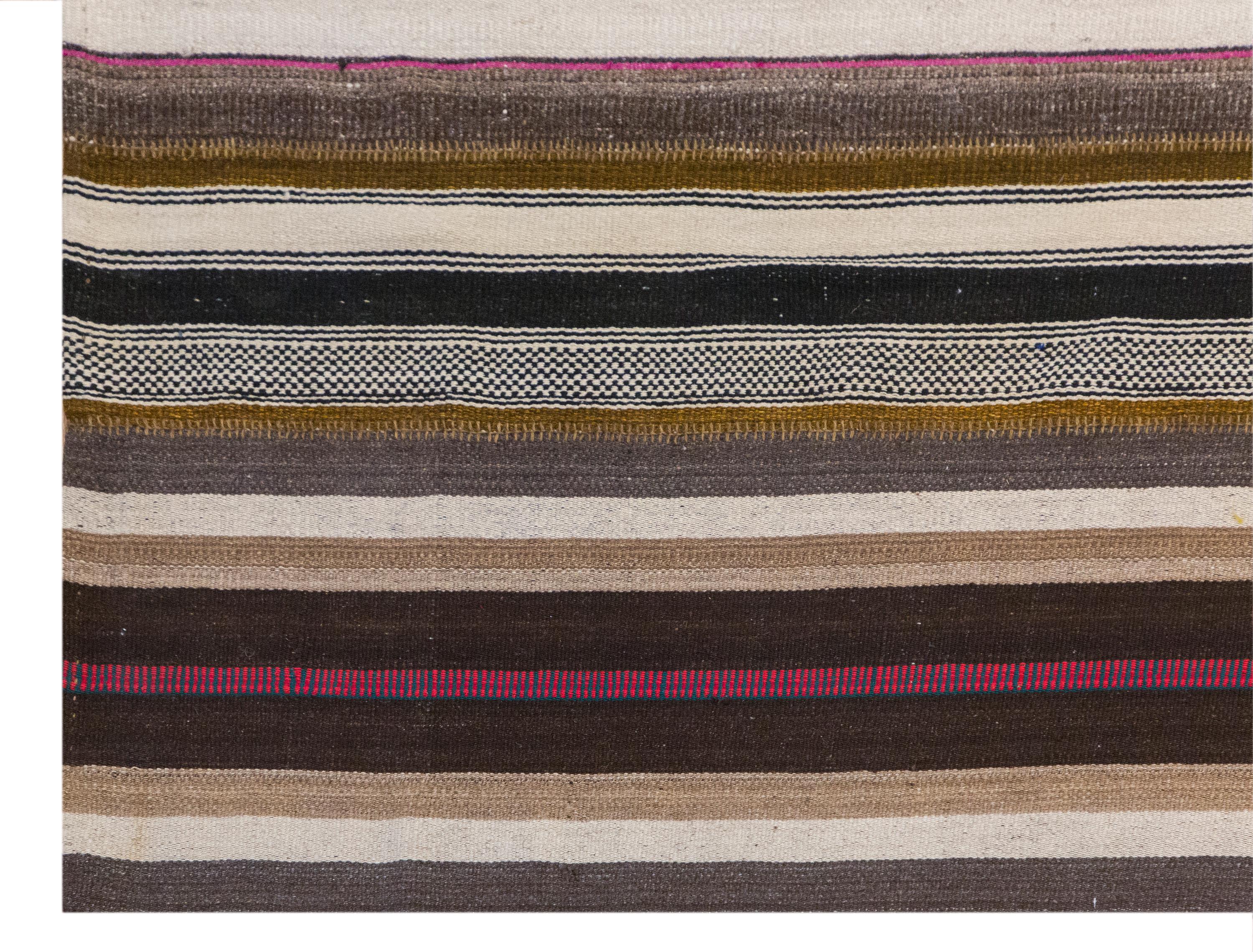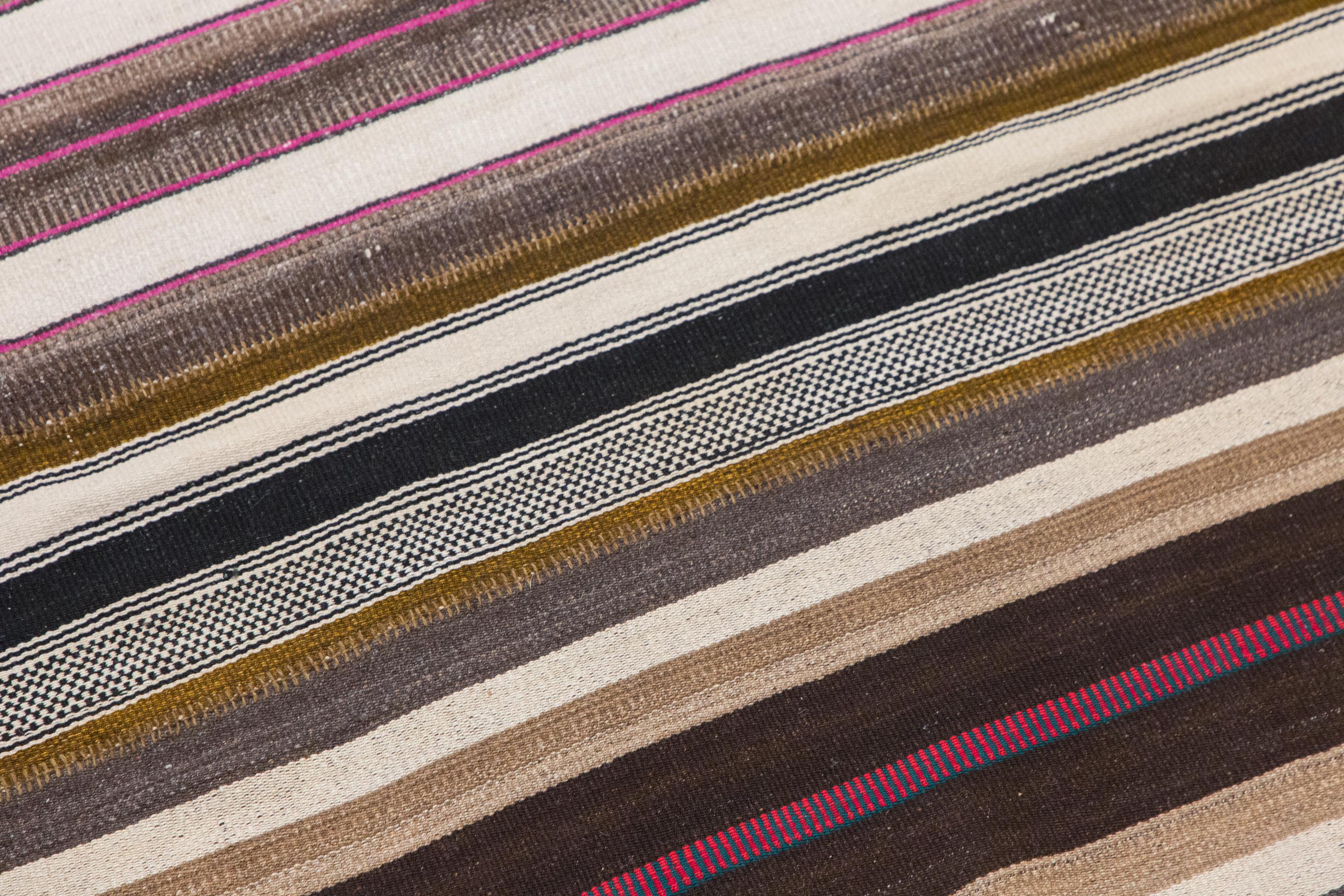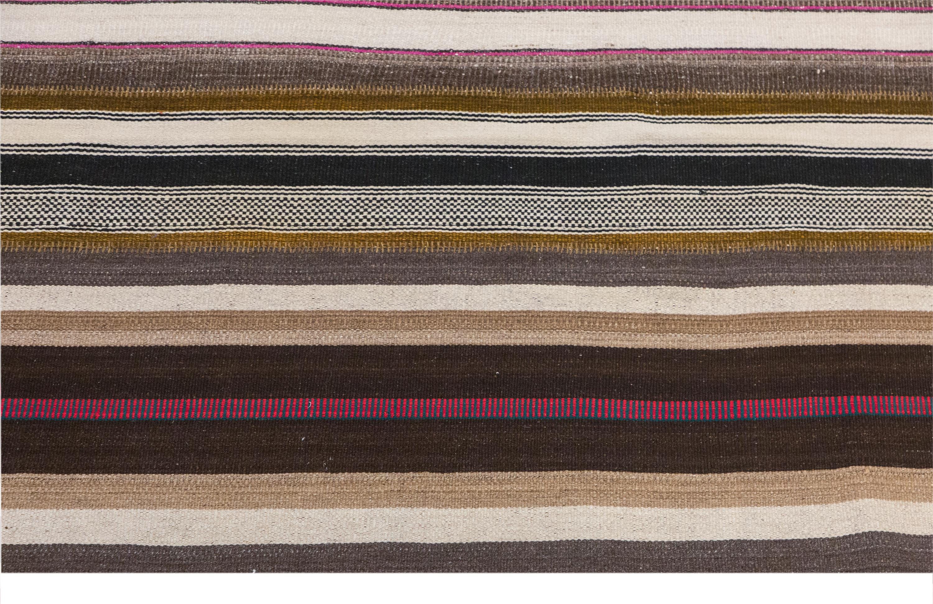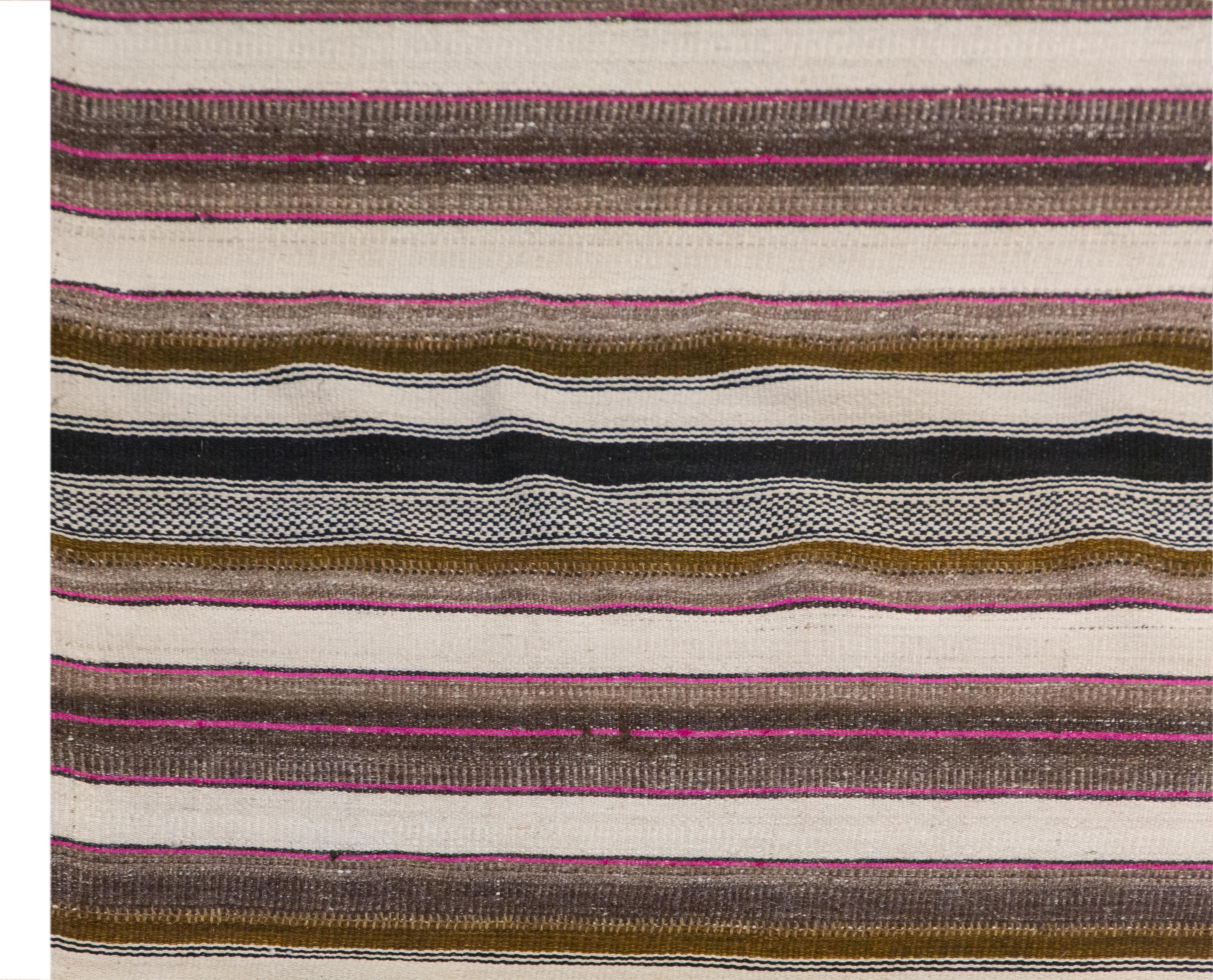 This authentic vintage Turkish Kilim rug is a handwoven piece from the 1960s, crafted with goat hair and naturally dyed using plants. Its minimalist striped design, soft muted tones, and large rectangular size make it perfect for living rooms, bedrooms, or accent spaces. The rug is in excellent condition and ready to use.