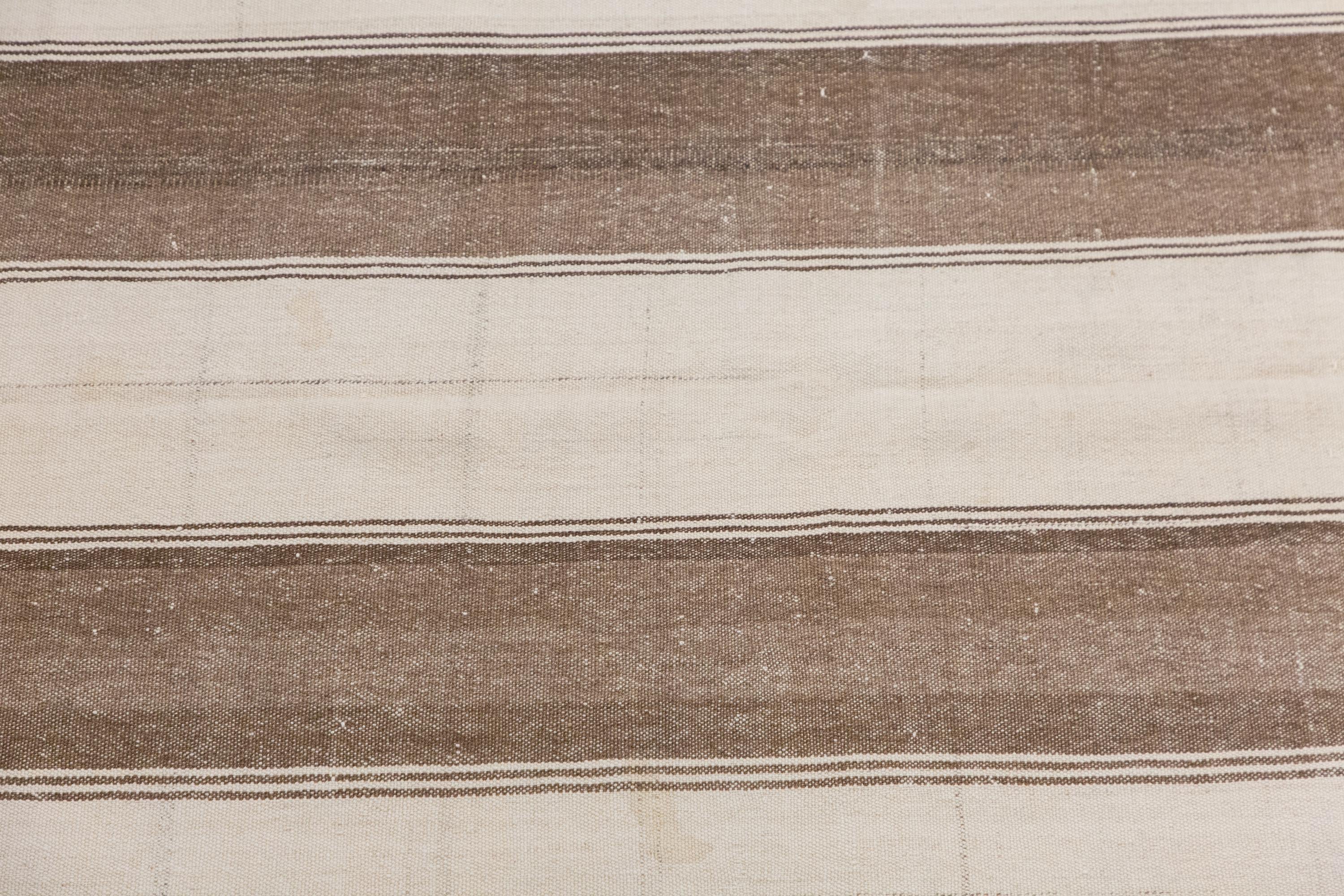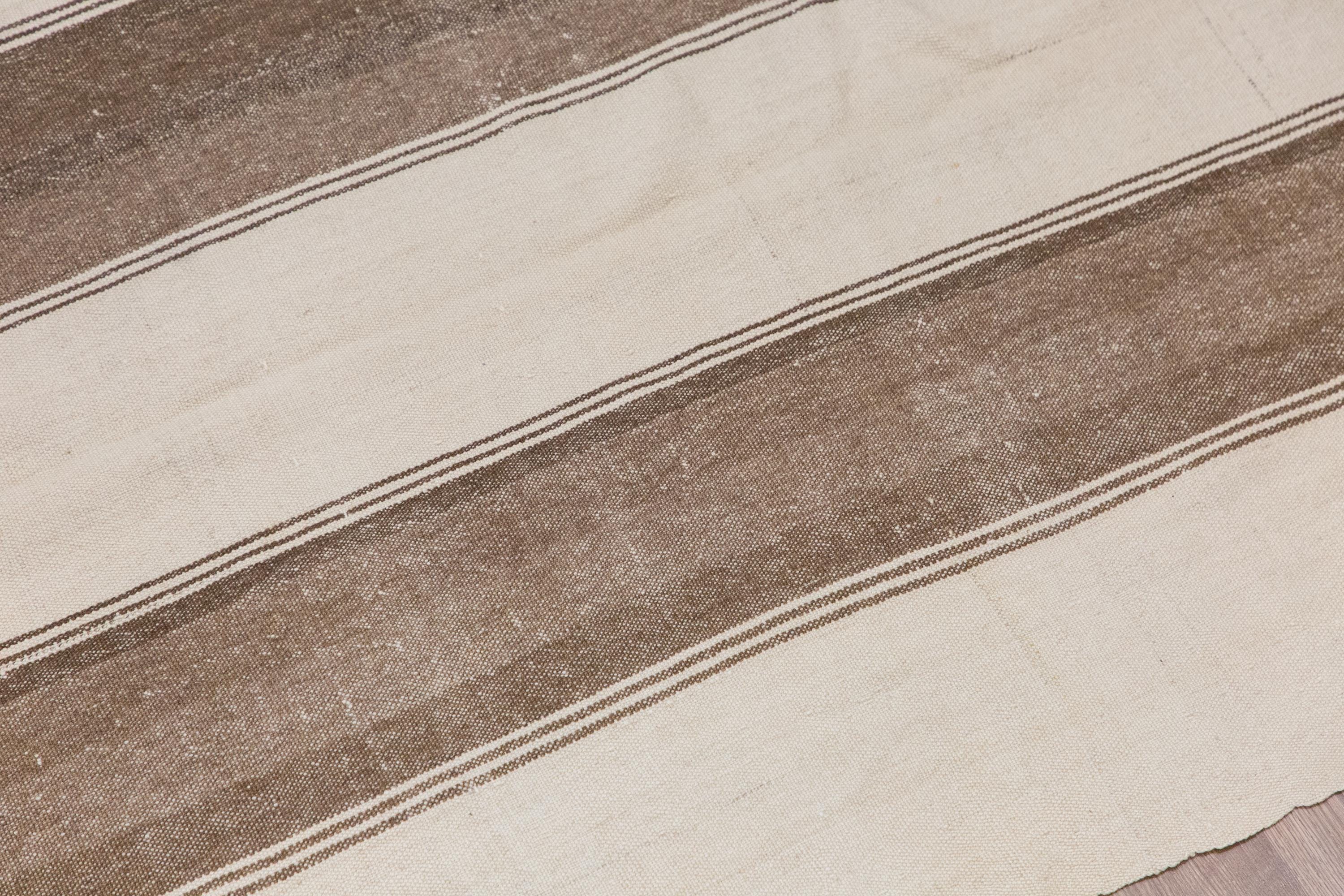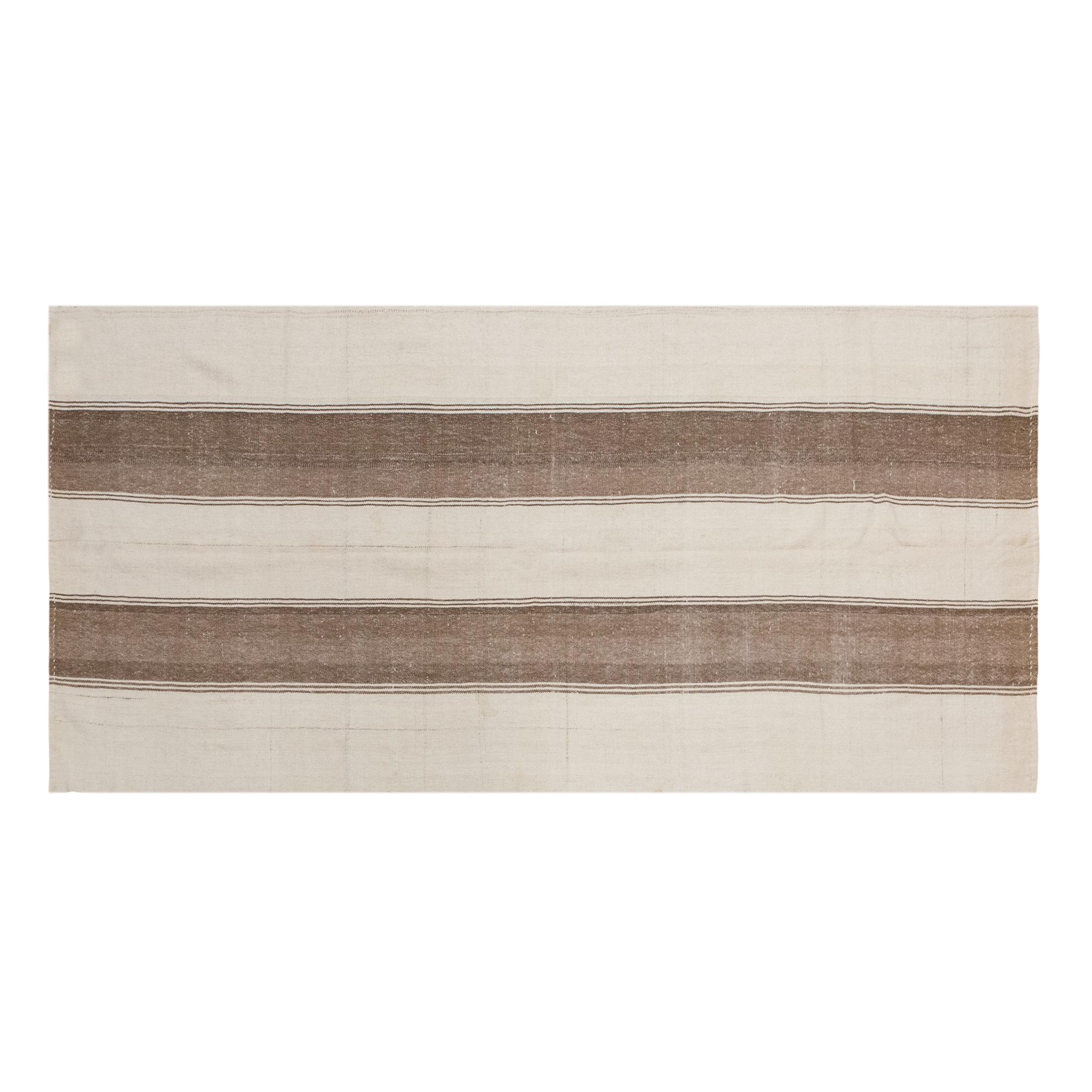This authentic vintage Turkish Kilim rug is a handwoven piece from the 1960s, crafted with goat hair and naturally dyed using plants. Its minimalist striped design, soft muted tones, and rectangular size make it perfect for living rooms, bedrooms, or accent spaces. The rug is in excellent condition and ready to use.