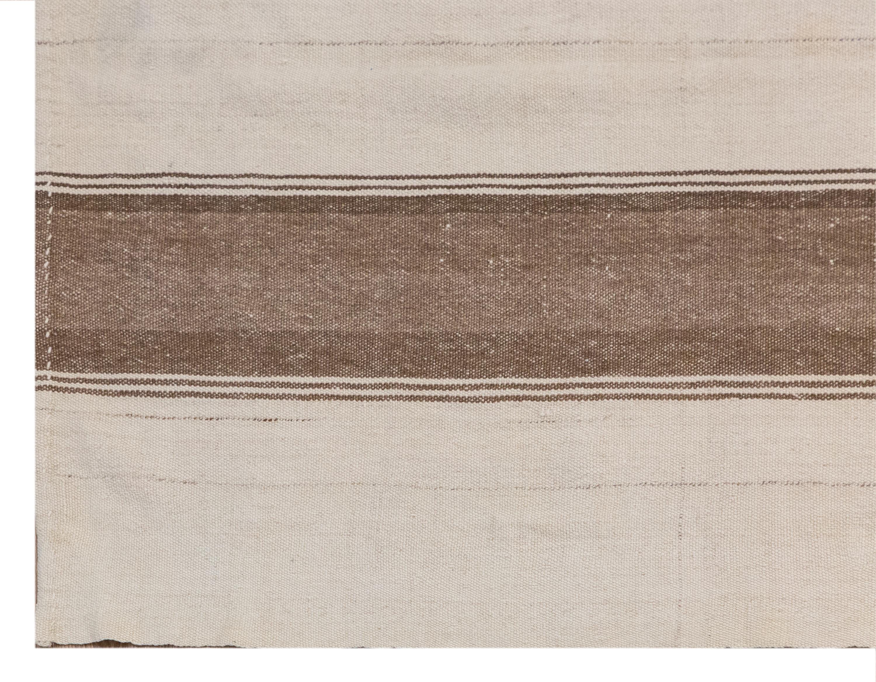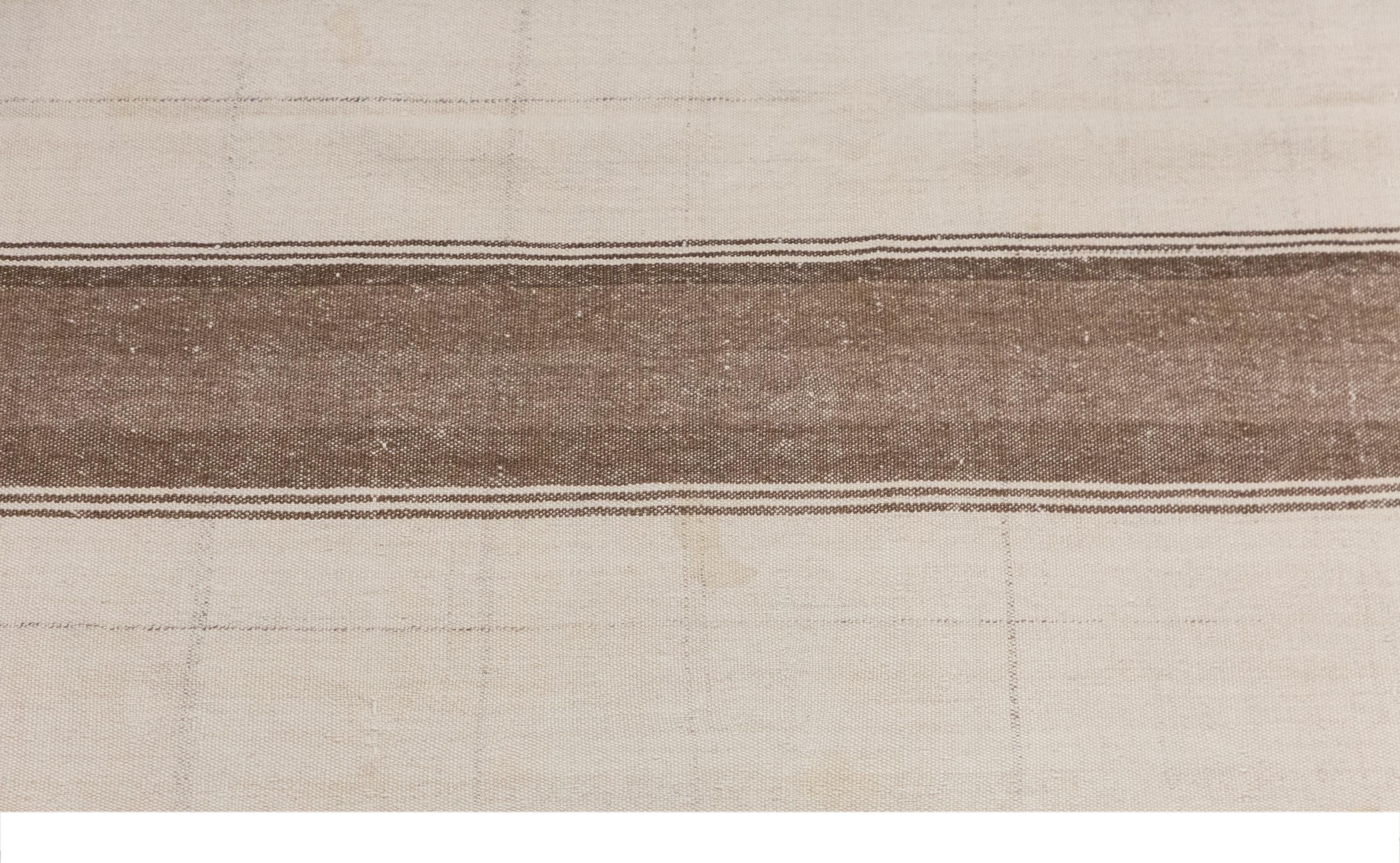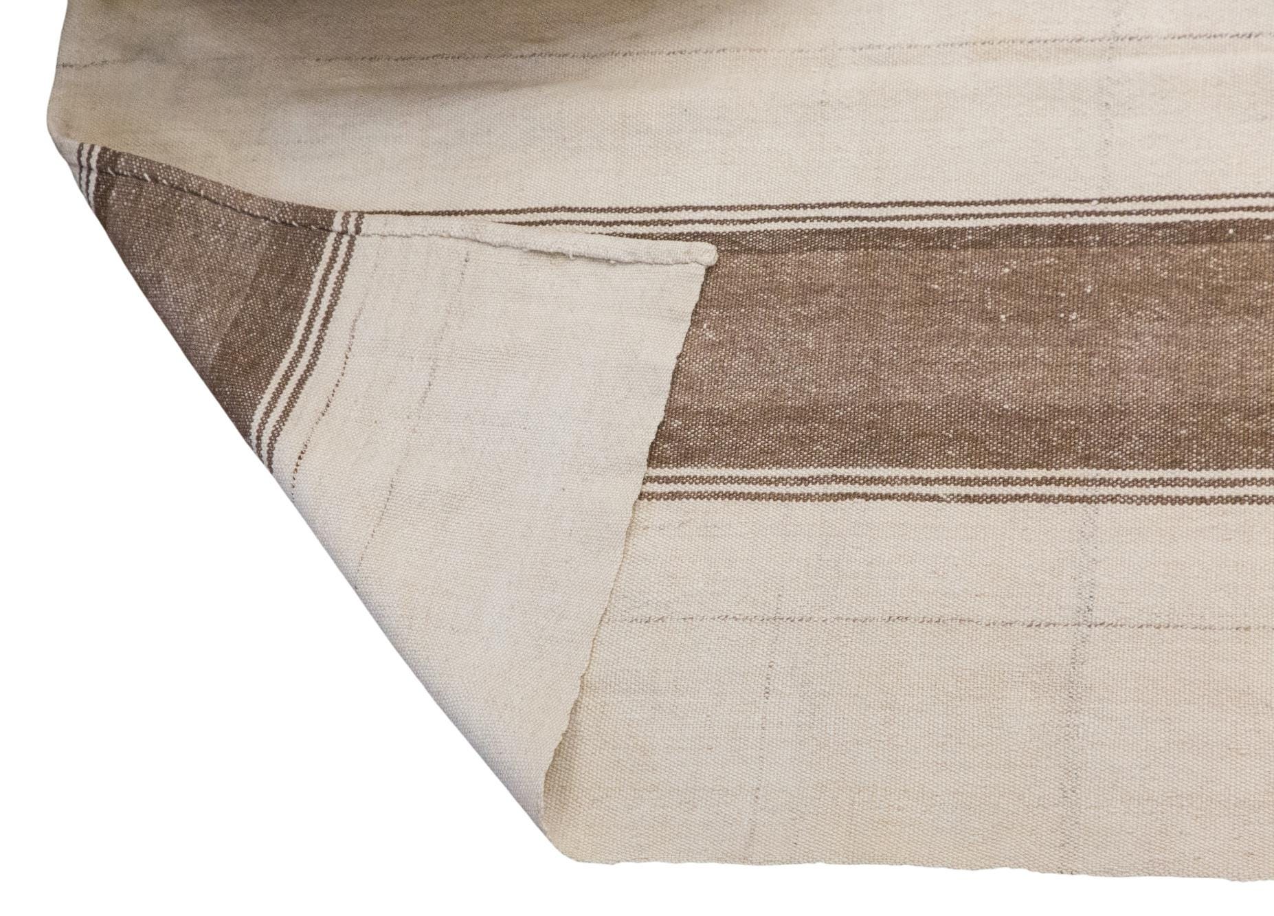 This authentic vintage Turkish Kilim rug is a handwoven piece from the 1960s, crafted with goat hair and naturally dyed using plants. Its minimalist striped design, soft muted tones, and rectangular size make it perfect for living rooms, bedrooms, or accent spaces. The rug is in excellent condition and ready to use.