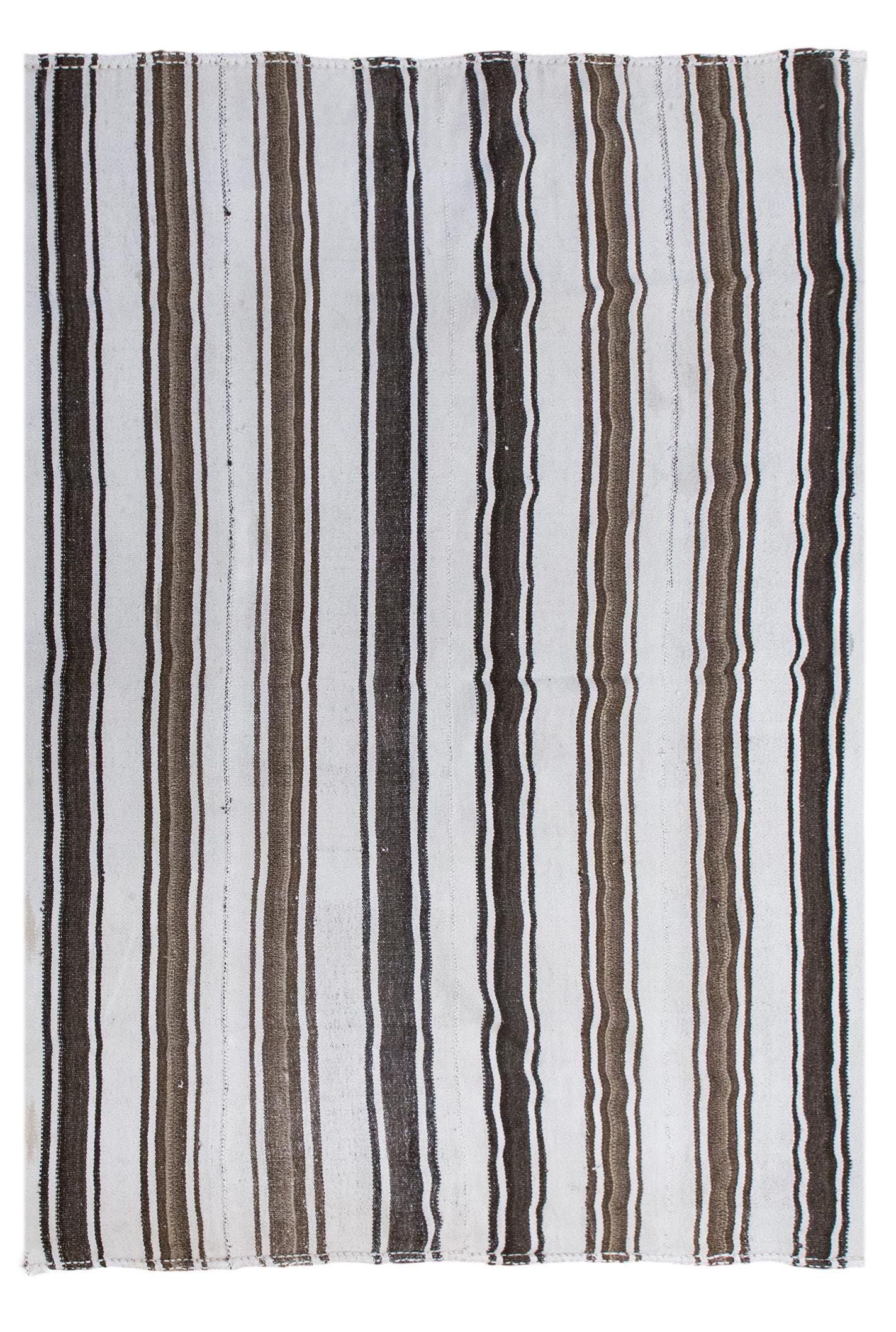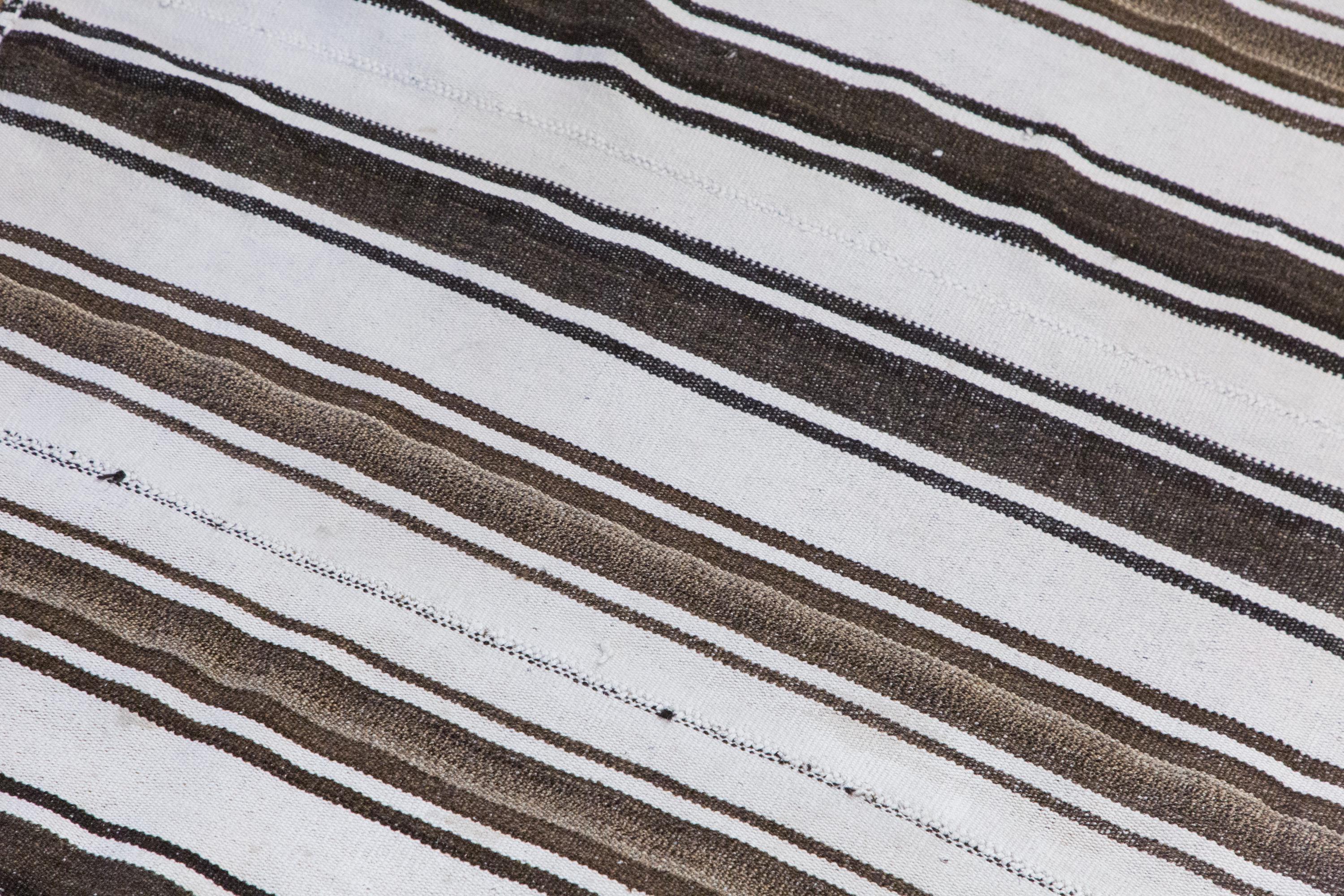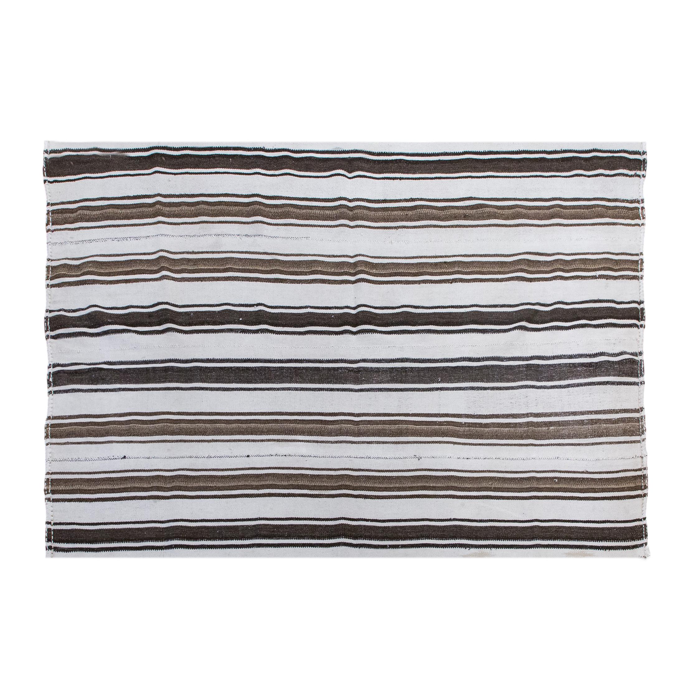 This authentic vintage Turkish Kilim rug is a handwoven piece from the 1960s, crafted with goat hair and naturally dyed using plants. Its minimalist striped design, soft muted tones, and rectangular size make it perfect for living rooms, bedrooms, or accent spaces. The rug is in excellent condition and ready to use.