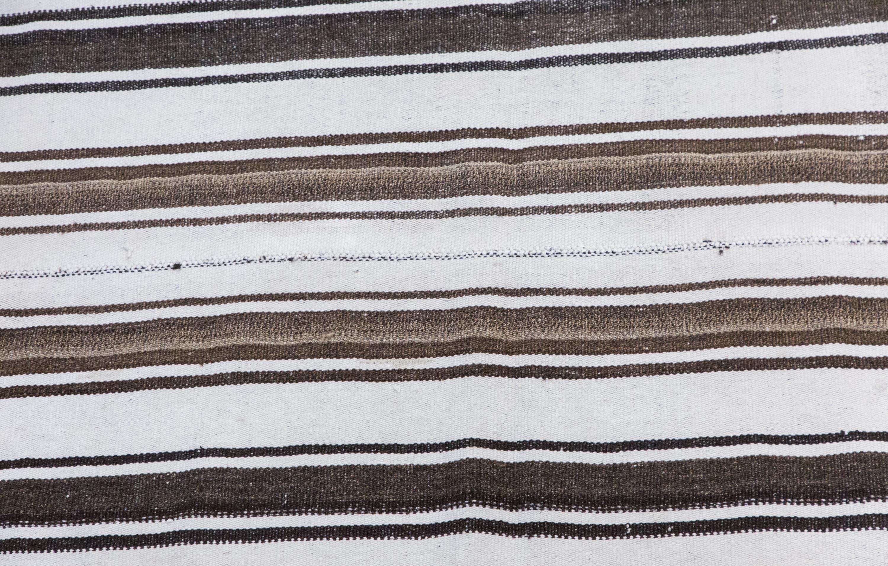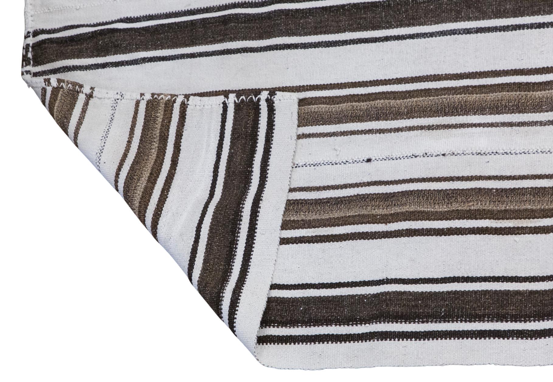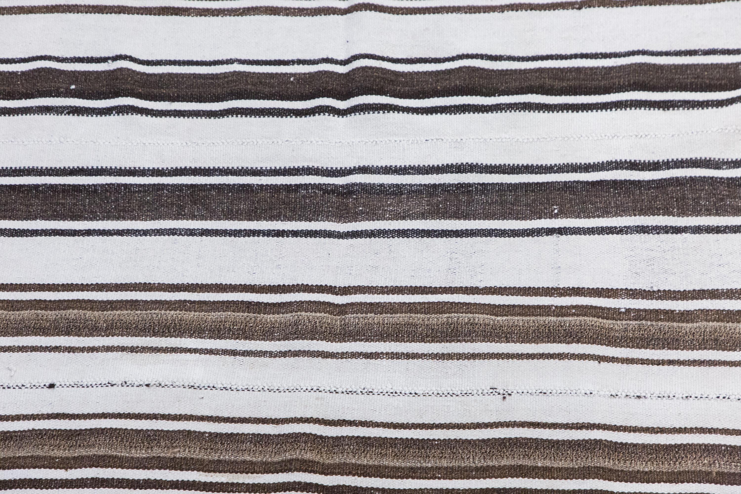 This authentic vintage Turkish Kilim rug is a handwoven piece from the 1960s, crafted with goat hair and naturally dyed using plants. Its minimalist striped design, soft muted tones, and rectangular size make it perfect for living rooms, bedrooms, or accent spaces. The rug is in excellent condition and ready to use.
