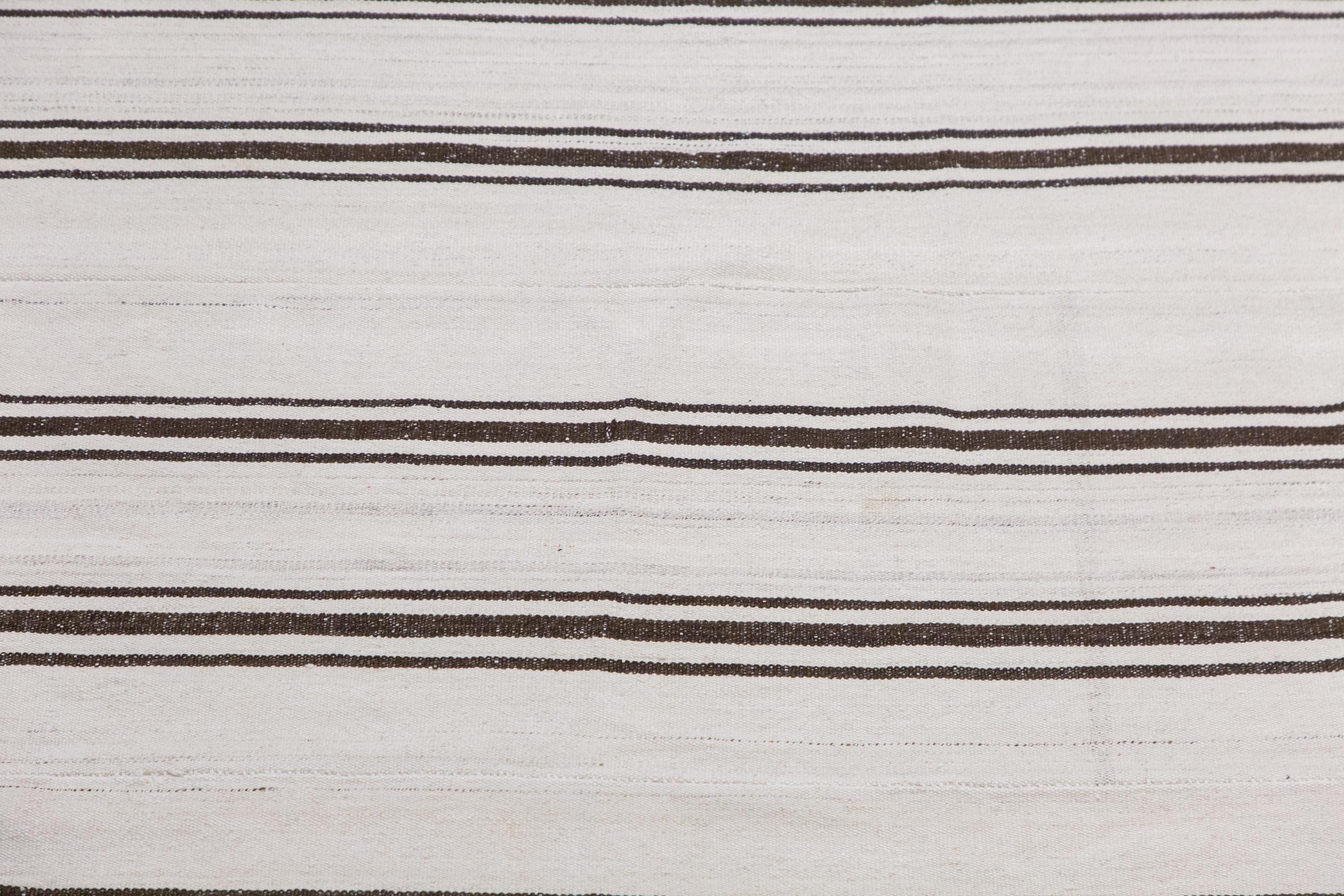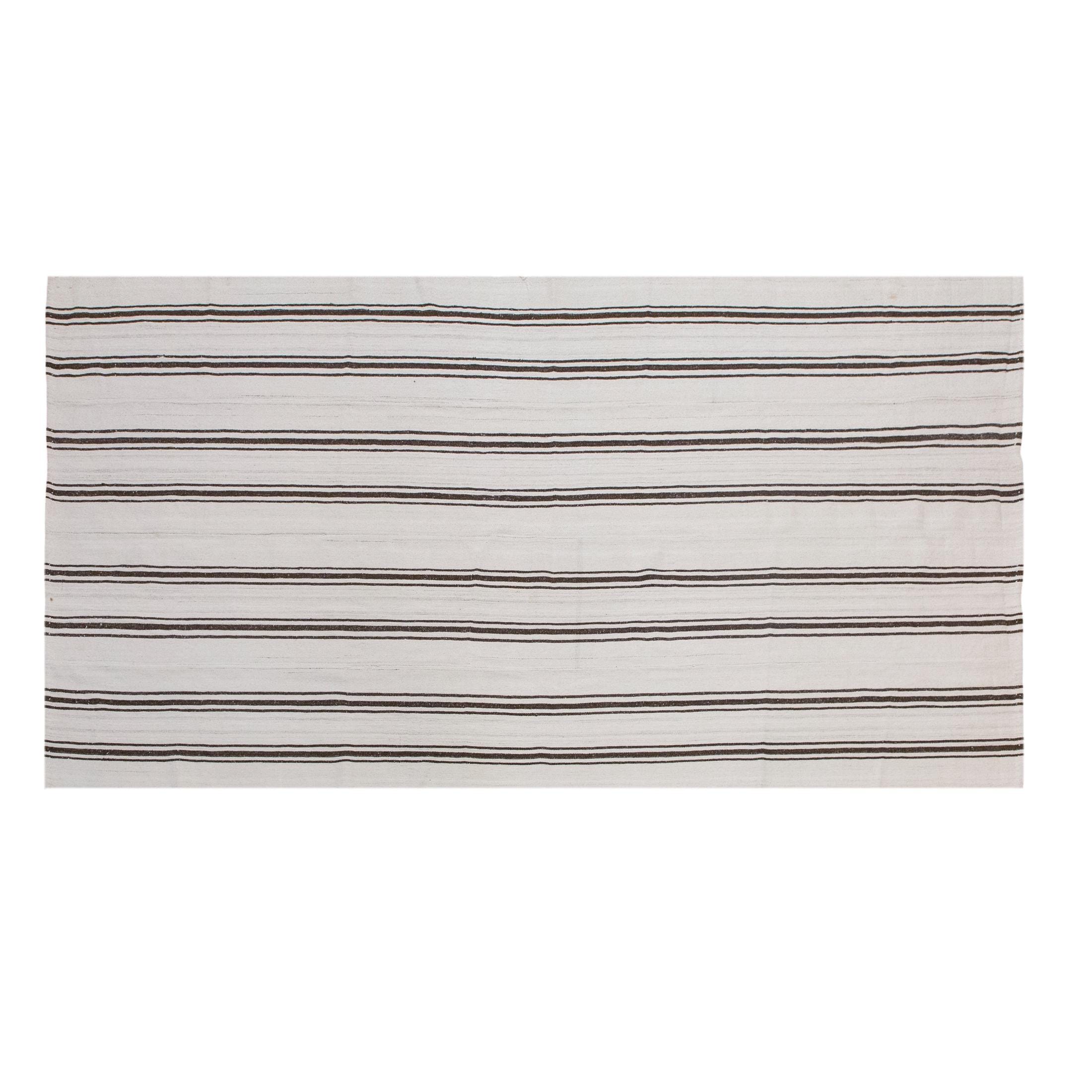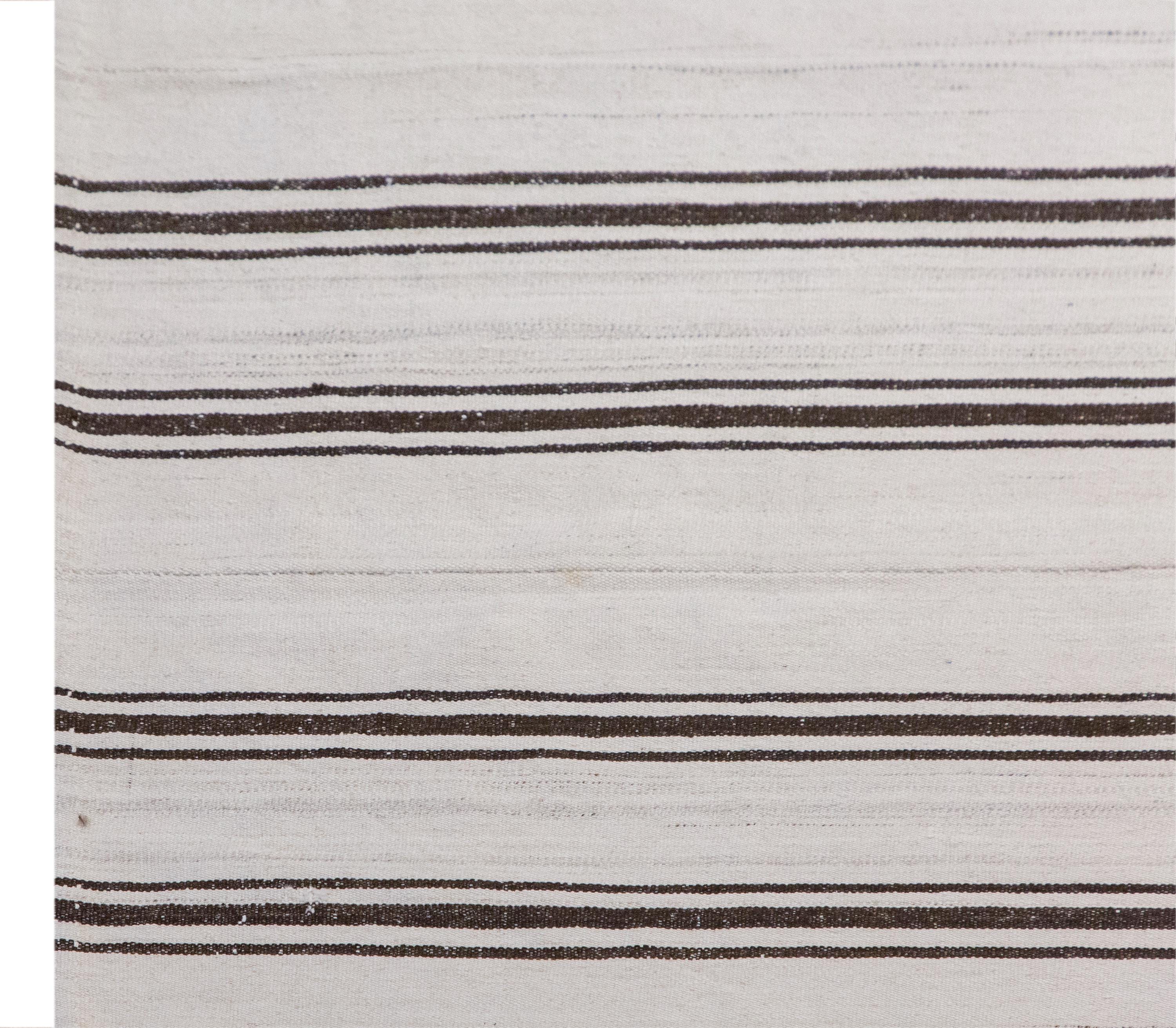 This authentic vintage Turkish Kilim rug is a handwoven piece from the 1960s, crafted with goat hair and naturally dyed using plants. Its minimalist striped design, soft muted tones, and large rectangular size make it perfect for living rooms, bedrooms, or accent spaces. The rug is in excellent condition and ready to use.