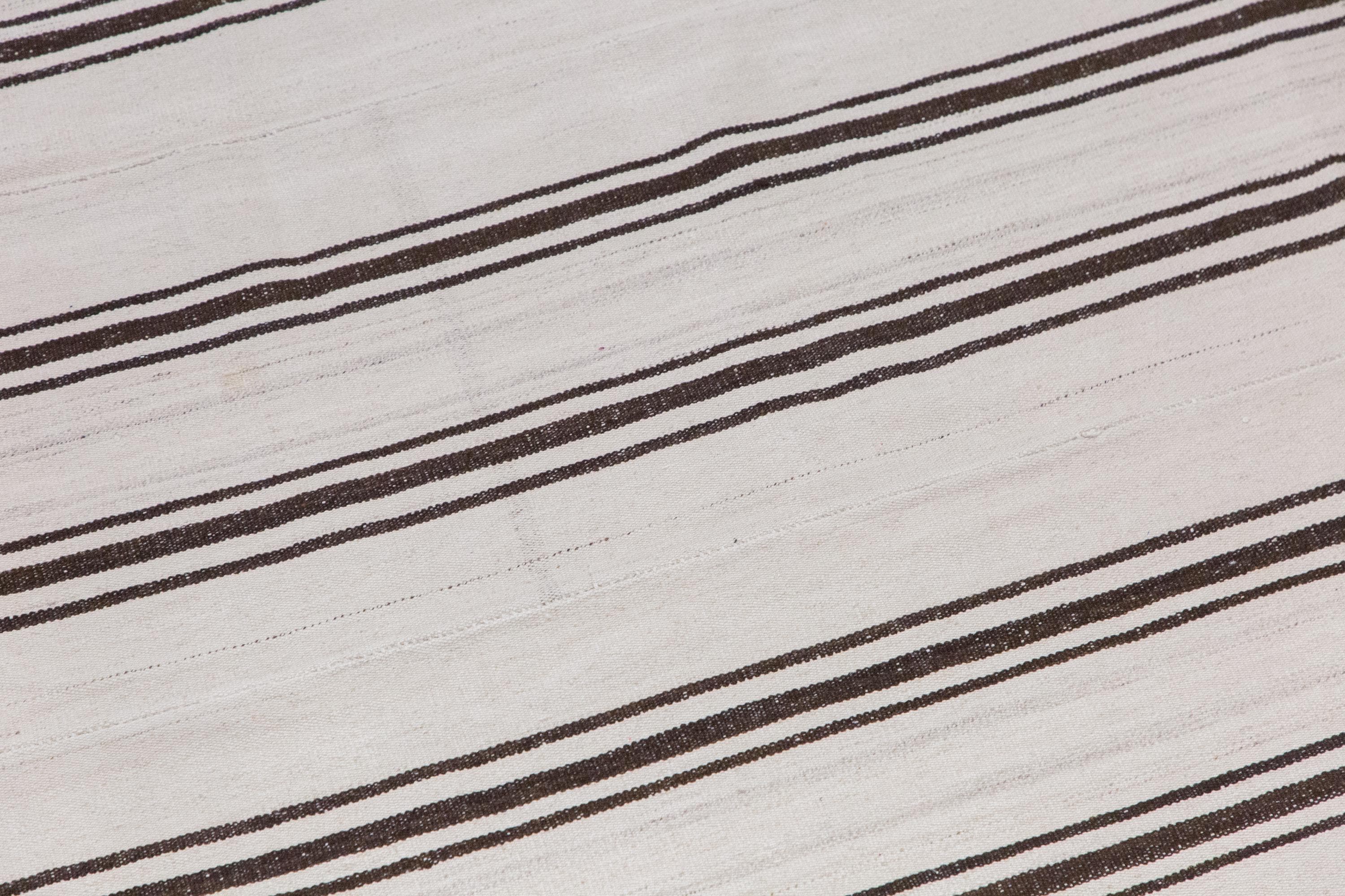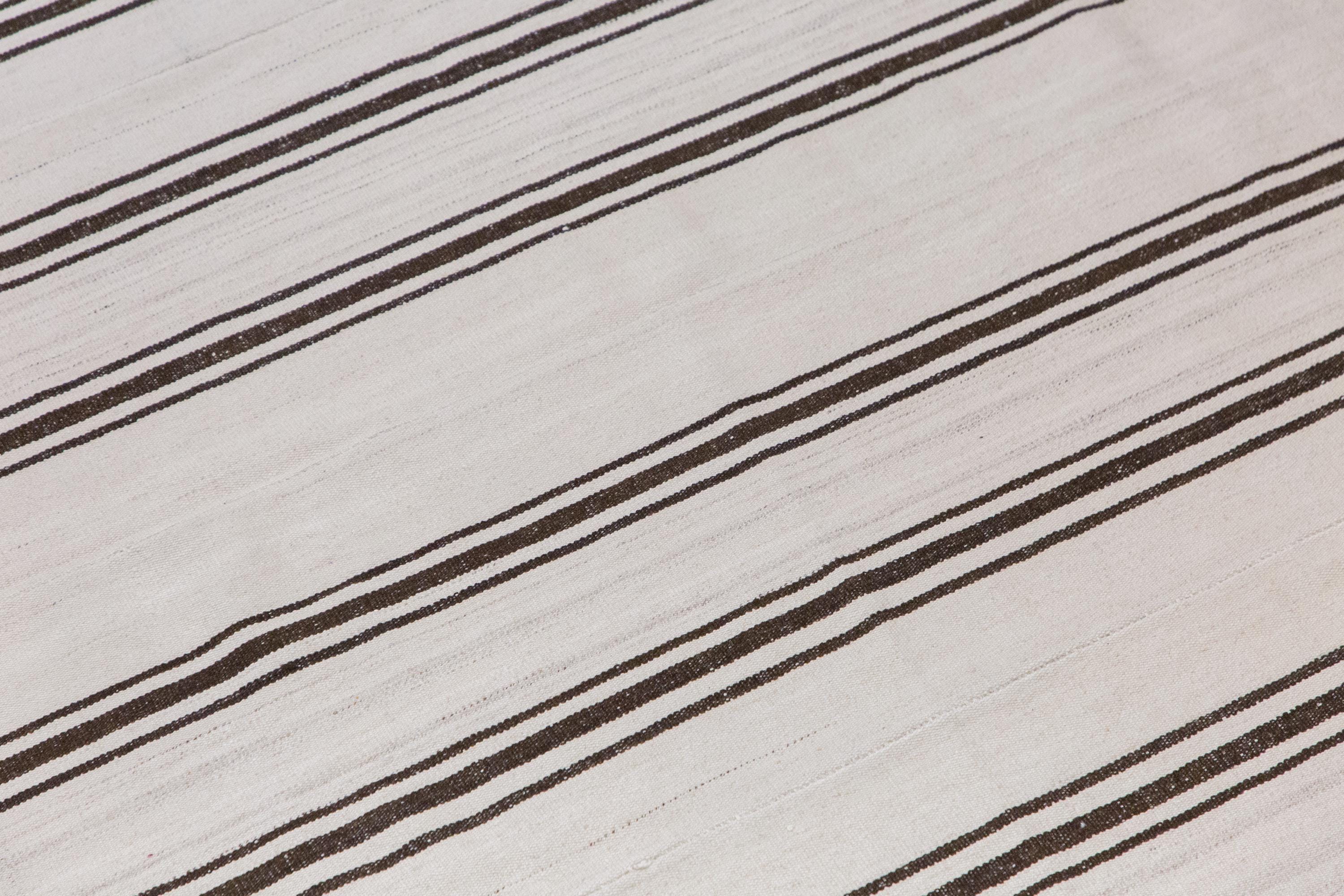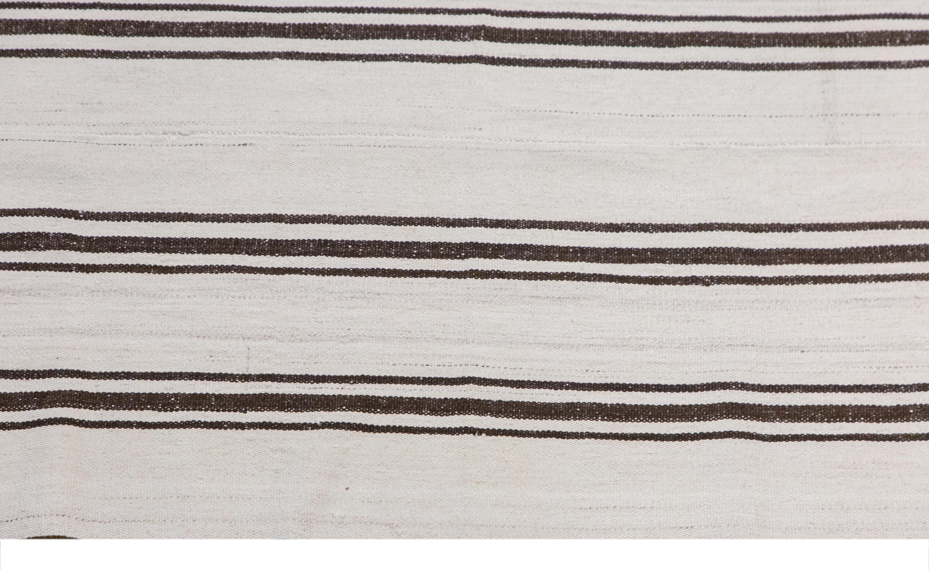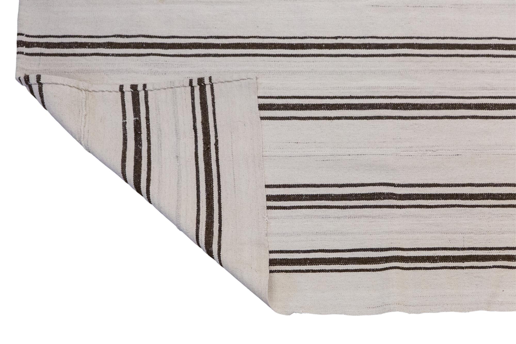 This authentic vintage Turkish Kilim rug is a handwoven piece from the 1960s, crafted with goat hair and naturally dyed using plants. Its minimalist striped design, soft muted tones, and large rectangular size make it perfect for living rooms, bedrooms, or accent spaces. The rug is in excellent condition and ready to use.