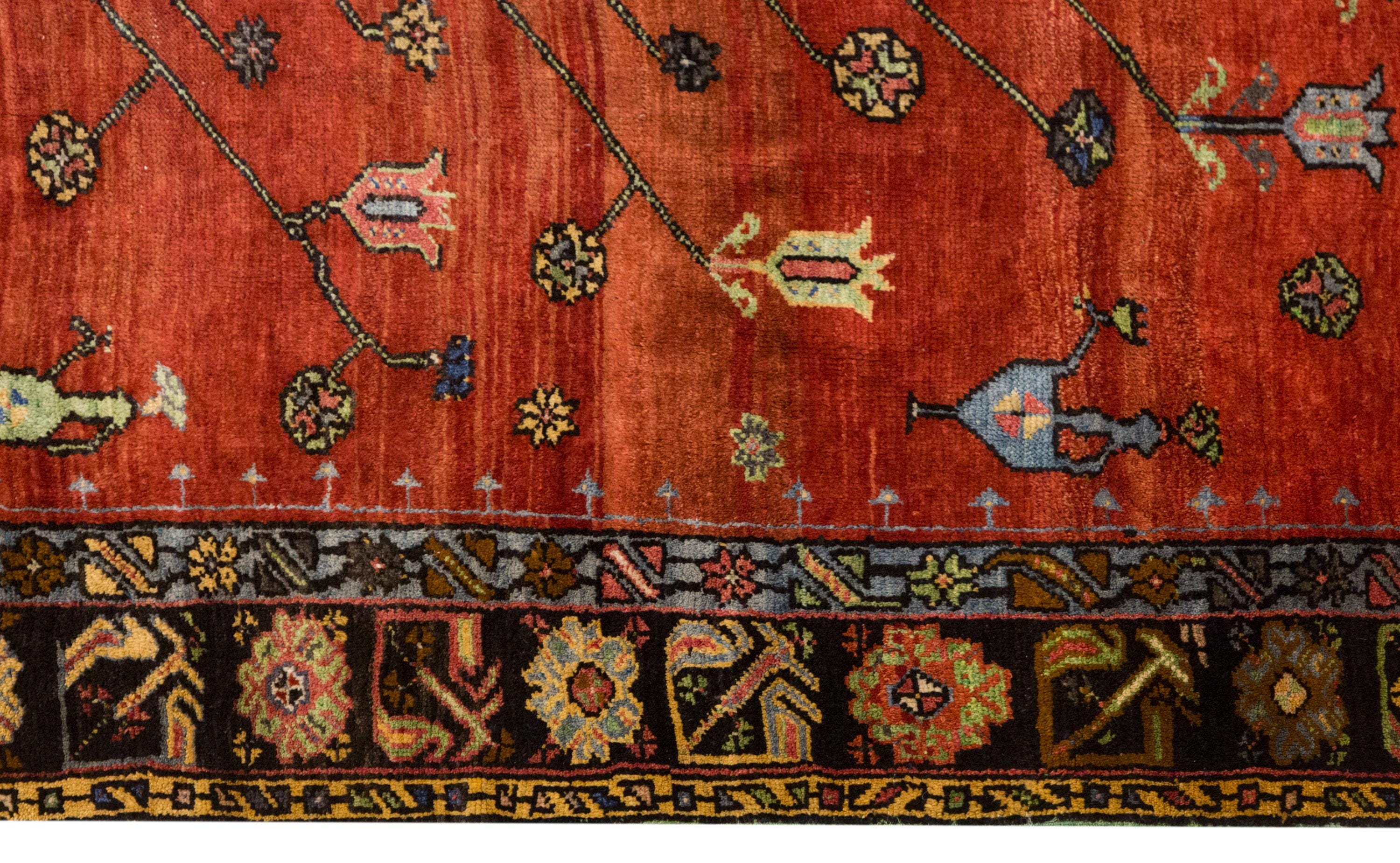 This 60+ year old handwoven Turkish wool rug is a magnificent example of Anatolian artistry, featuring a richly detailed traditional floral design. The deep navy field is filled with blossoms, vines, and leaves, surrounding a bold central medallion symbolizing unity and abundance. Warm shades of red, green, and gold create a striking contrast against the dark background, beautifully highlighting the craftsmanship of traditional weaving.
