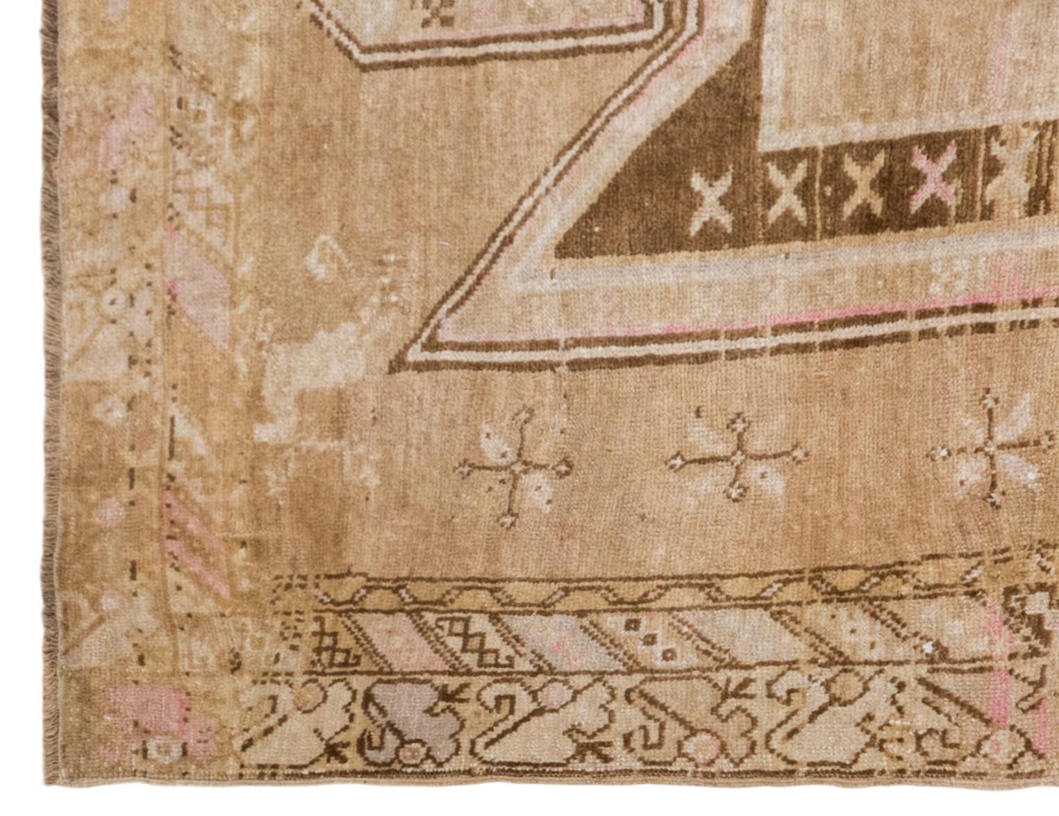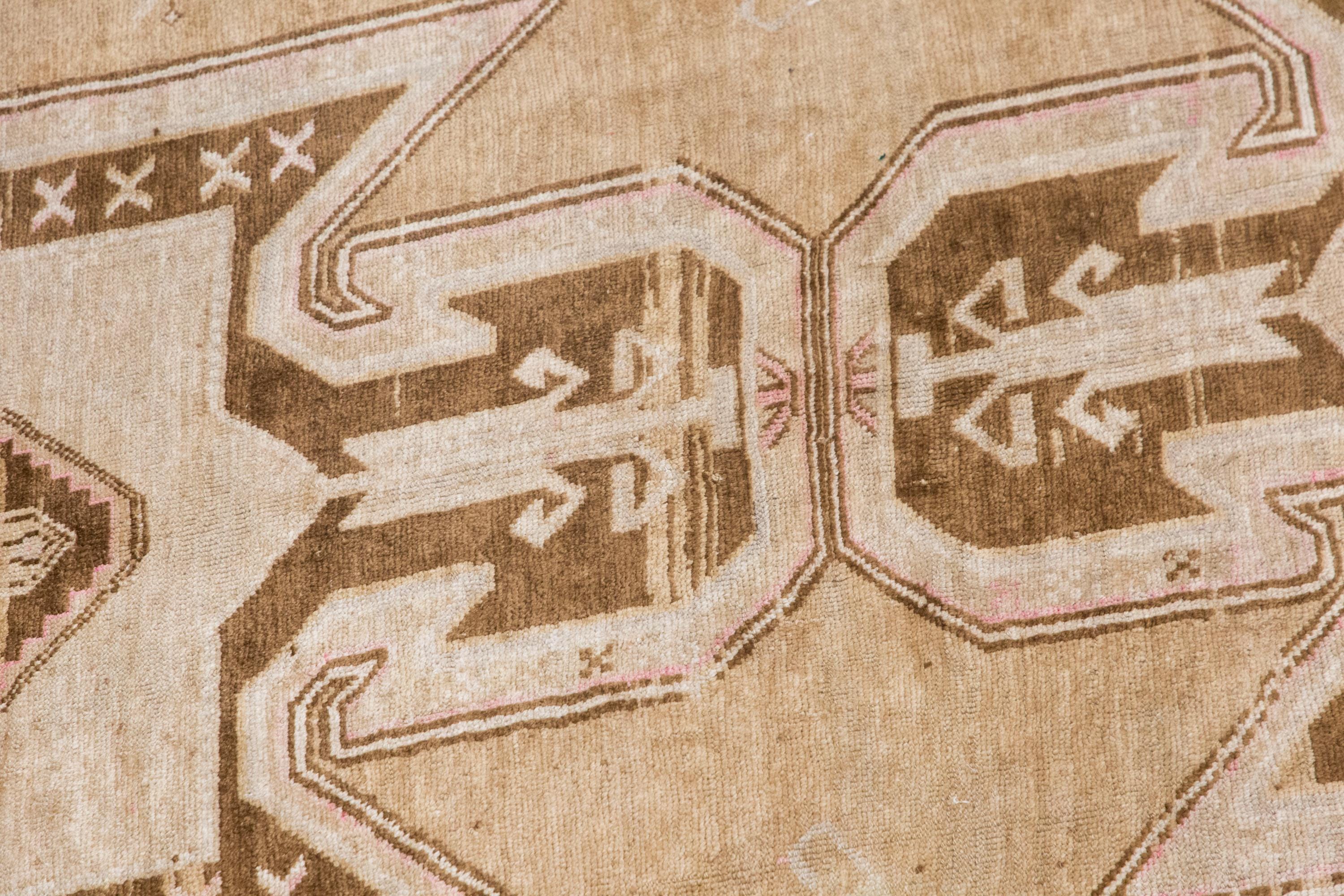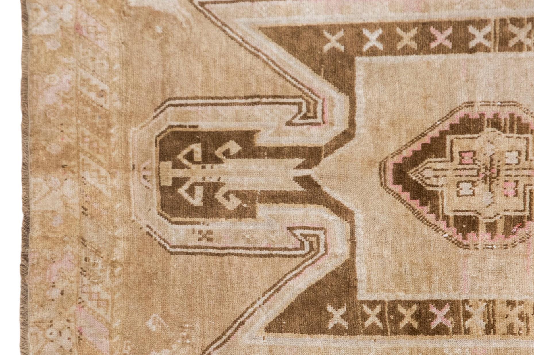 This handwoven vintage wool rug reflects a quiet and timeless beauty shaped by approximately 60 years of age and artisan craftsmanship. Its gently distressed surface, warm beige field, and soft brown geometric motifs create a harmonious composition that feels both earthy and elegant. With its generous dimensions and restrained palette, this piece fits beautifully in a living room, bedroom, dining space, or any spacious interior that calls for warmth, texture, and authentic handmade charm.