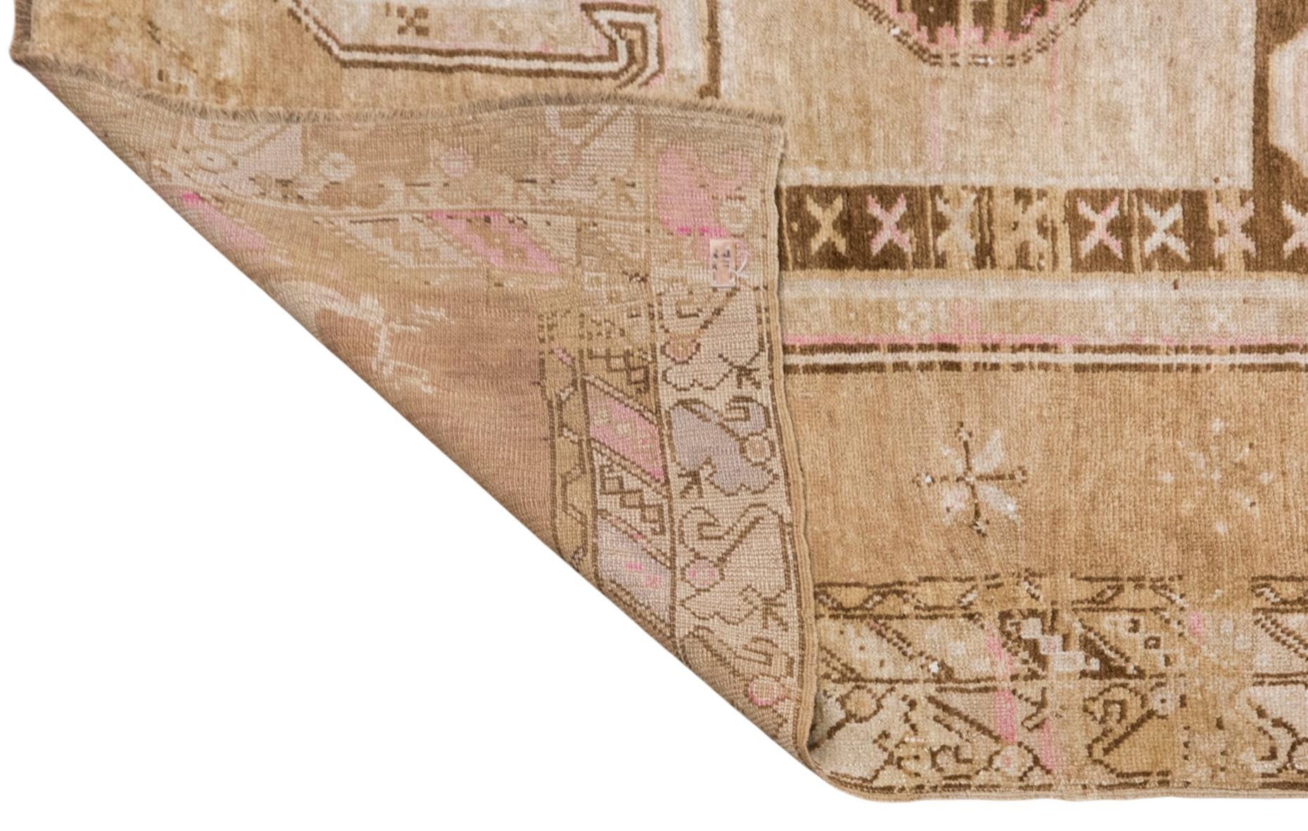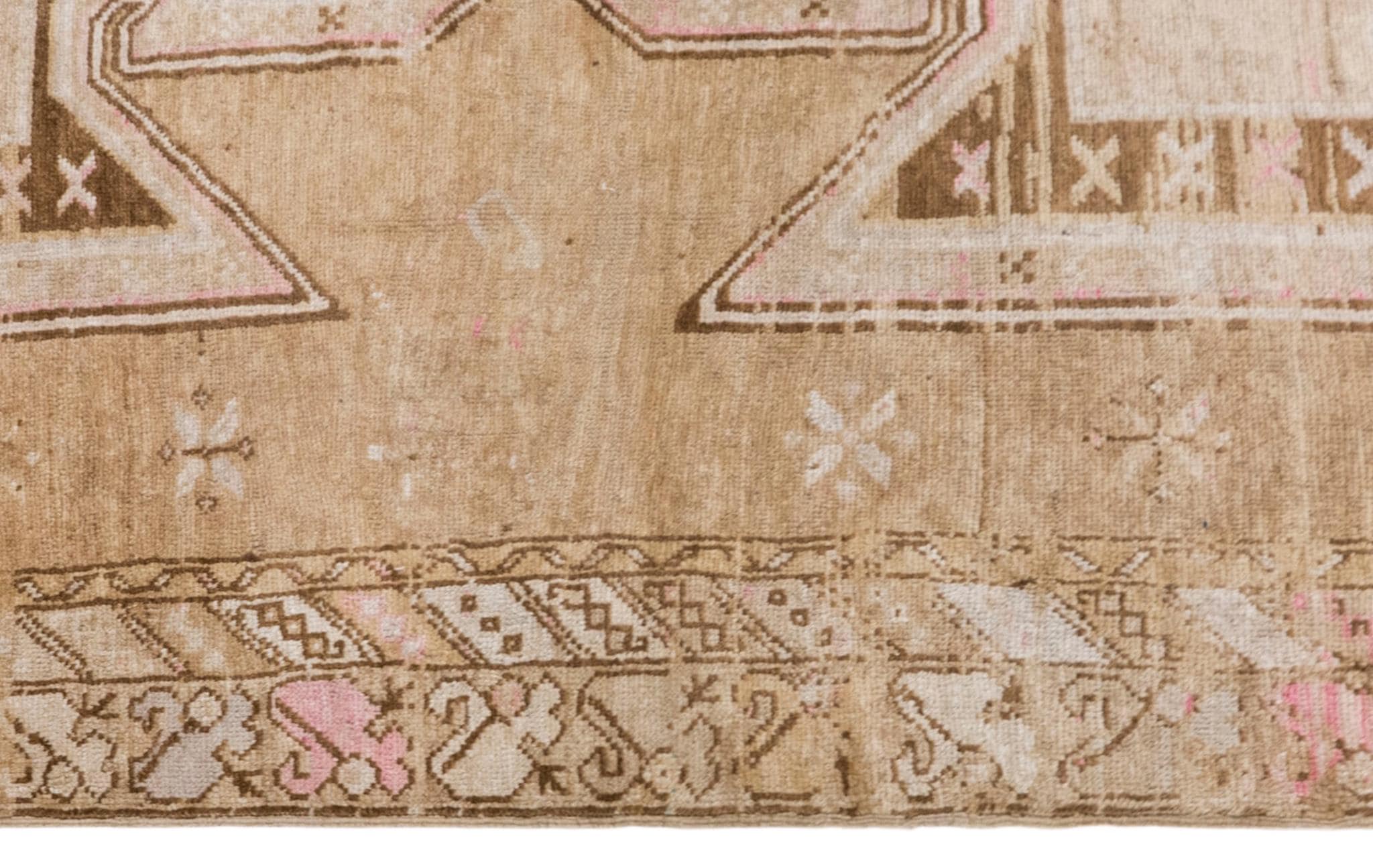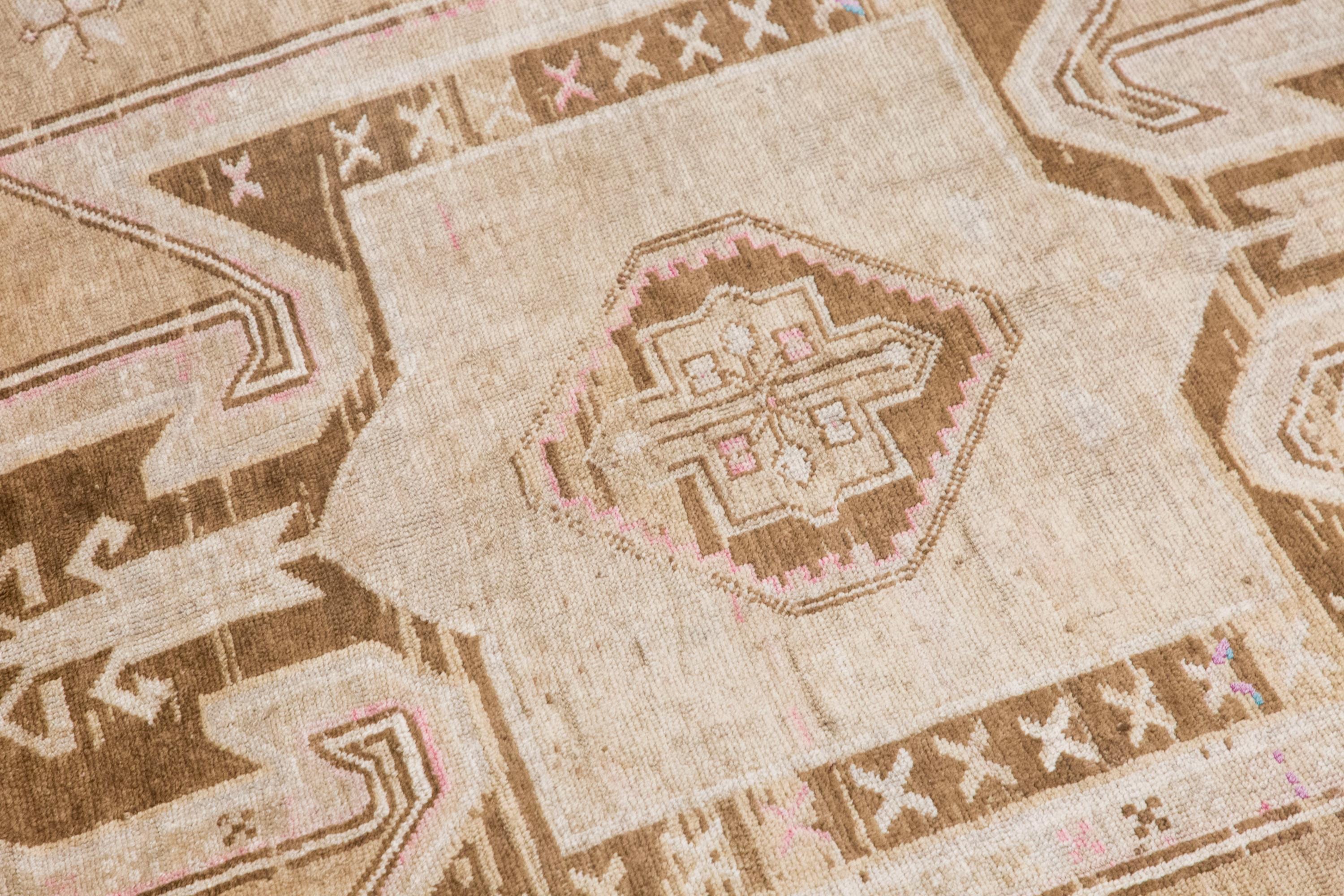 This handwoven vintage wool rug reflects a quiet and timeless beauty shaped by approximately 60 years of age and artisan craftsmanship. Its gently distressed surface, warm beige field, and soft brown geometric motifs create a harmonious composition that feels both earthy and elegant. With its generous dimensions and restrained palette, this piece fits beautifully in a living room, bedroom, dining space, or any spacious interior that calls for warmth, texture, and authentic handmade charm.