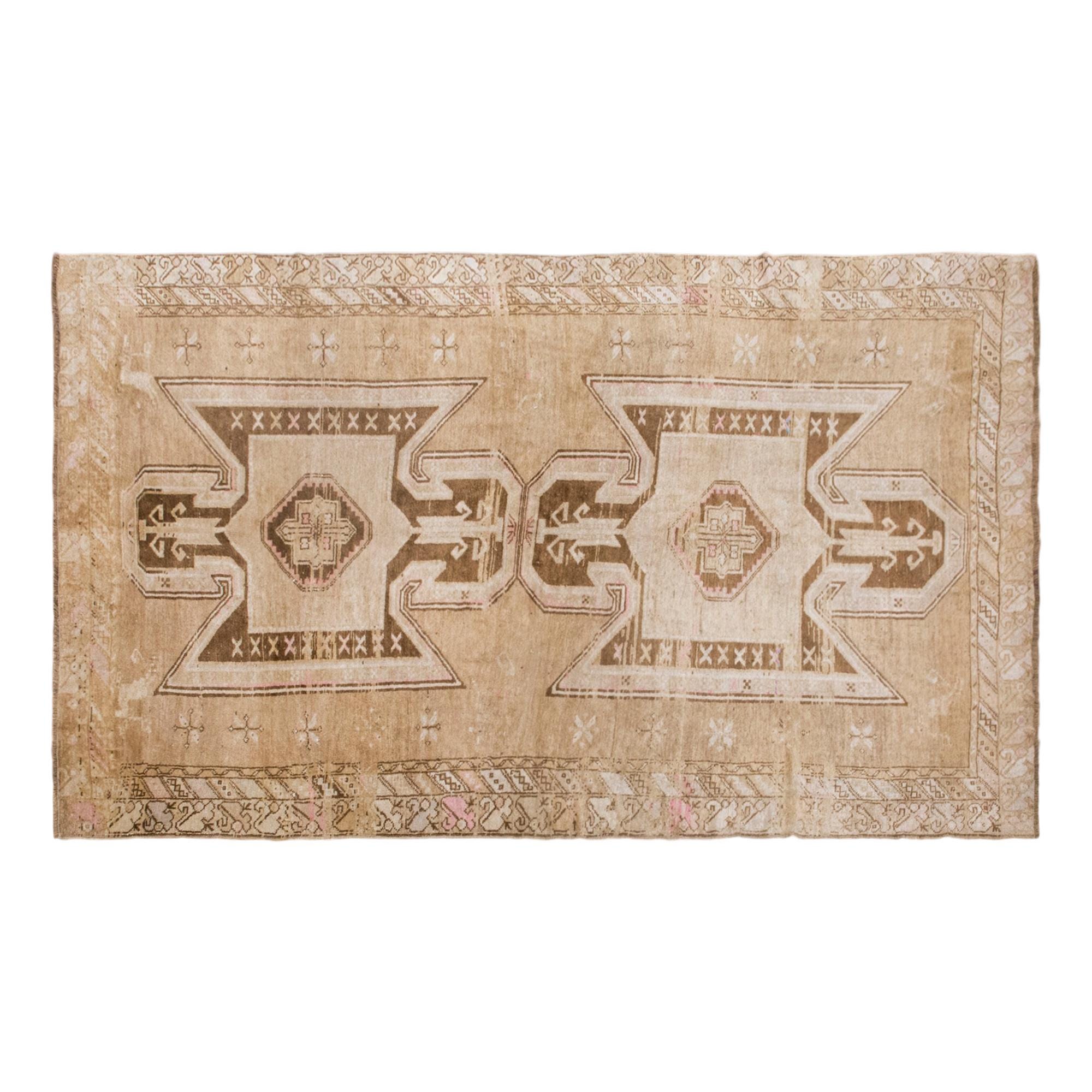 The story of its pattern feels symbolic, structural, and quietly protective. Across the field, the two large central motifs resemble woven guardians arranged in balance, facing one another through a connected design. Their bold angular outlines give the rug a strong sense of order and presence, while the smaller diamond forms at their centers feel like preserved symbols holding the soul of the composition. The surrounding motifs remain softer, almost emerging gently from the faded ground, giving the entire piece a poetic aged character. Rather than depending on sharp contrast, the rug expresses its story through softened borders, timeworn symbols, and balanced geometry that evoke shelter, continuity, and resilience. Altogether, the design feels like a woven reflection of protection and permanence, gracefully softened by time.