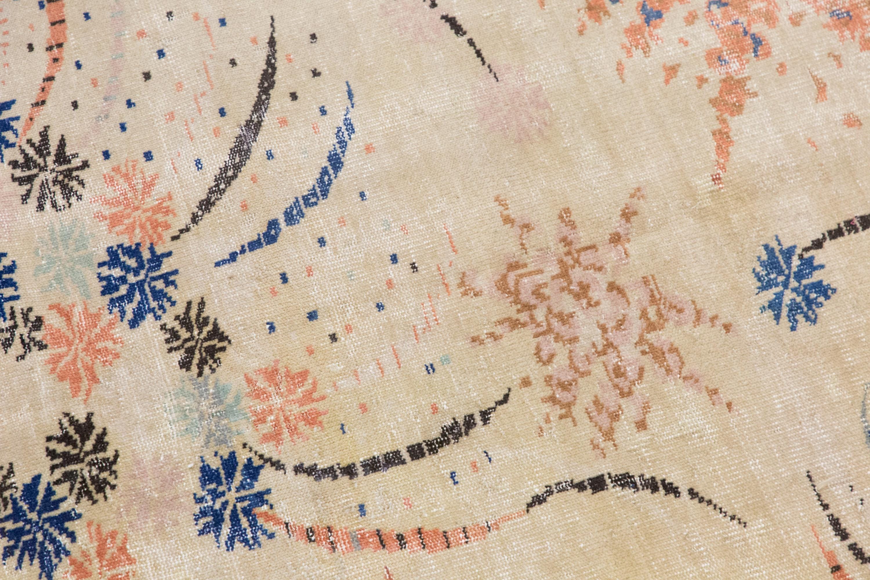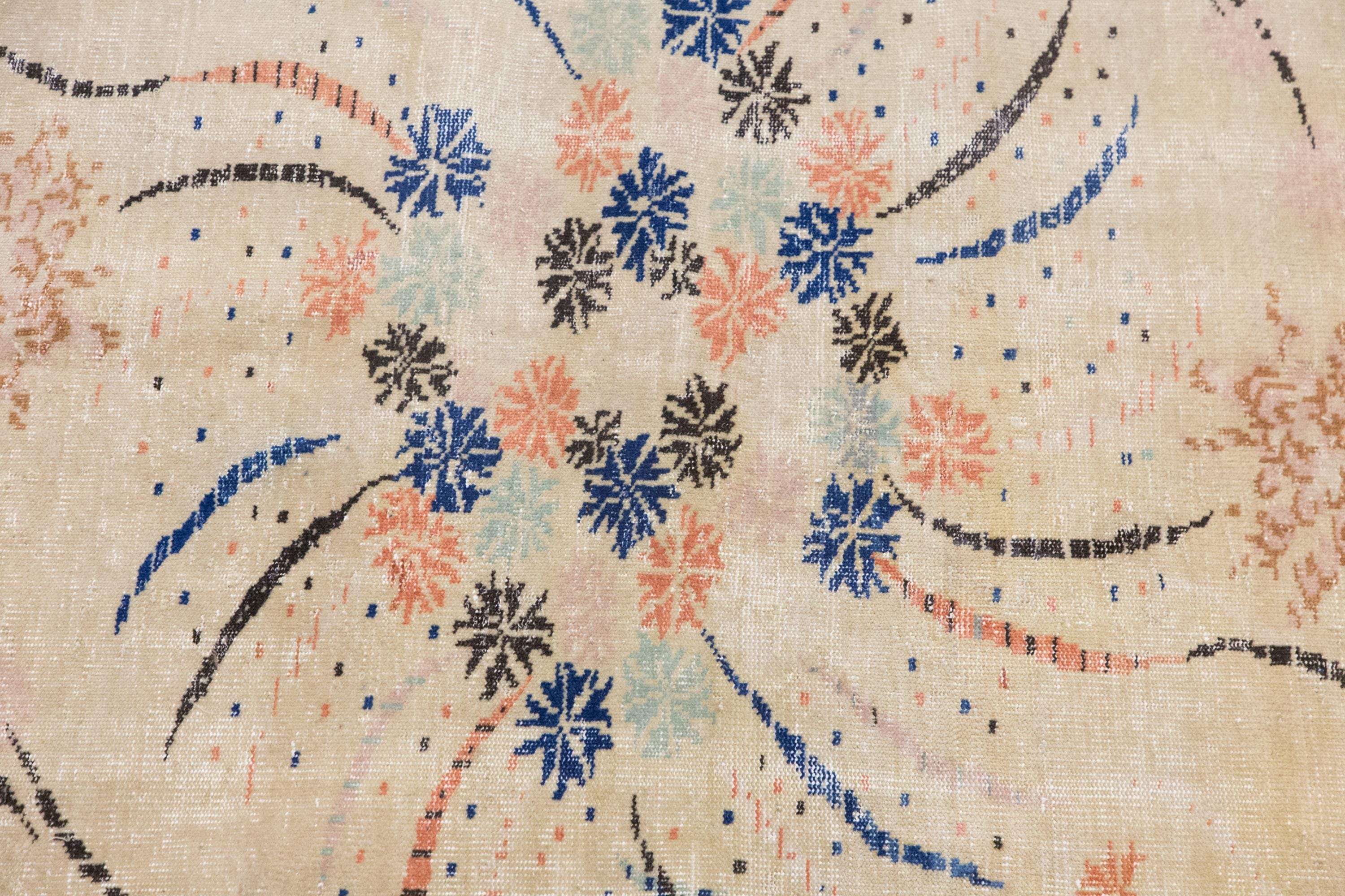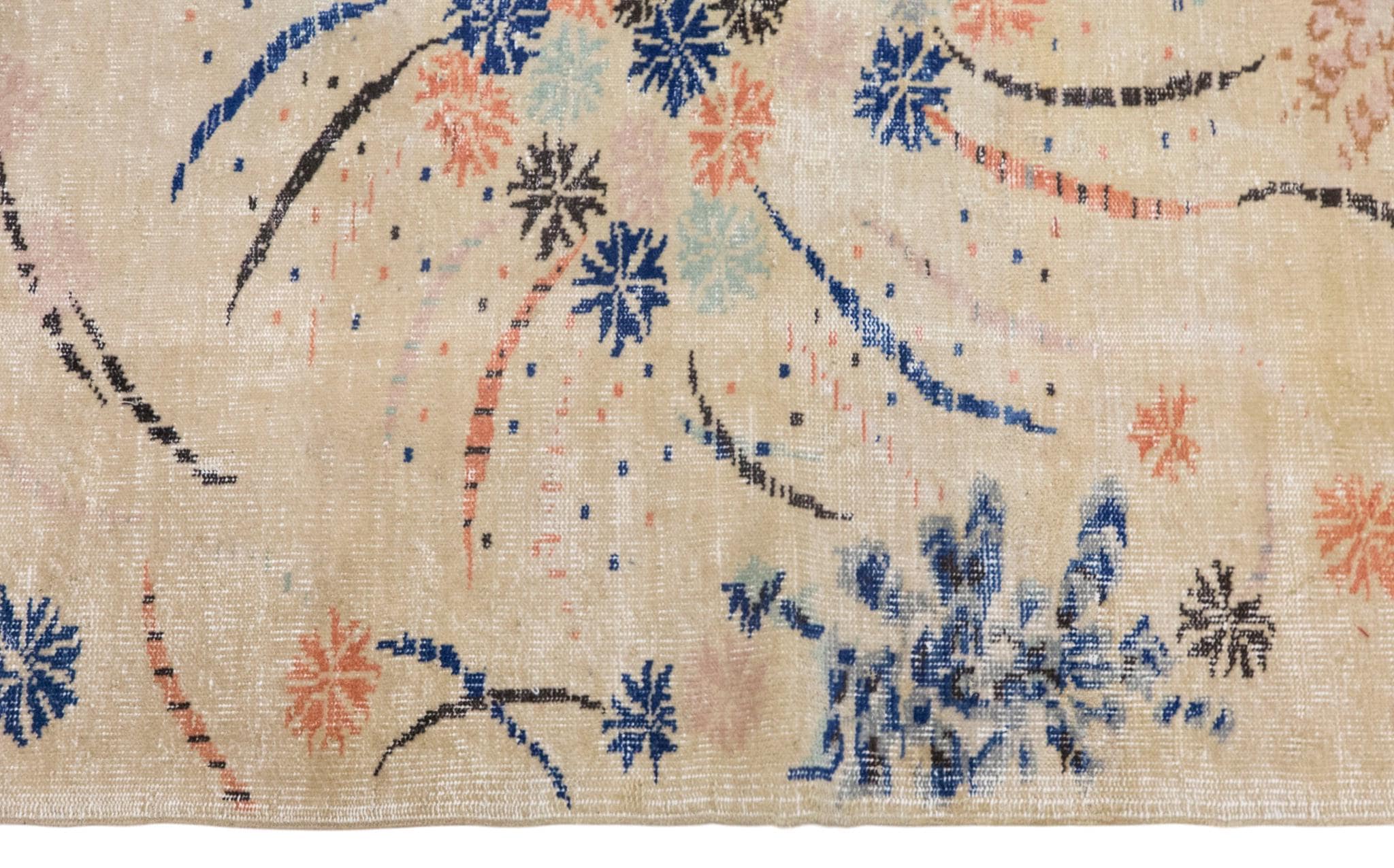 Its palette makes it especially versatile for interiors that combine vintage warmth with artistic or modern styling. From a distance, it feels airy and decorative; up close, the handwoven texture and scattered abstract motifs reveal its individuality and age.