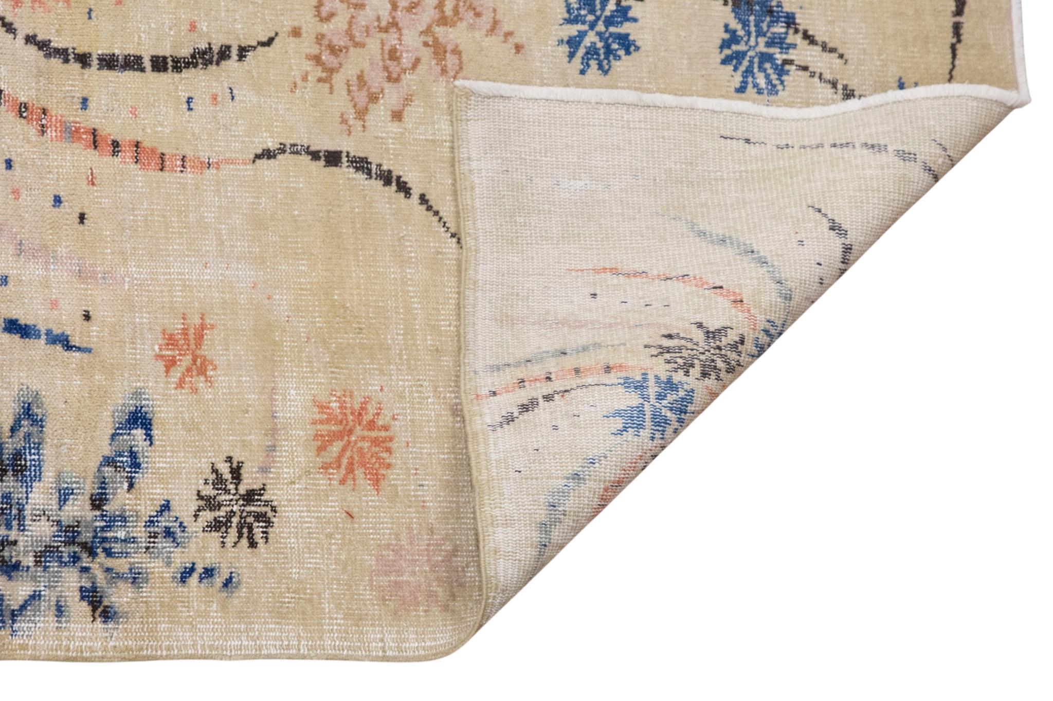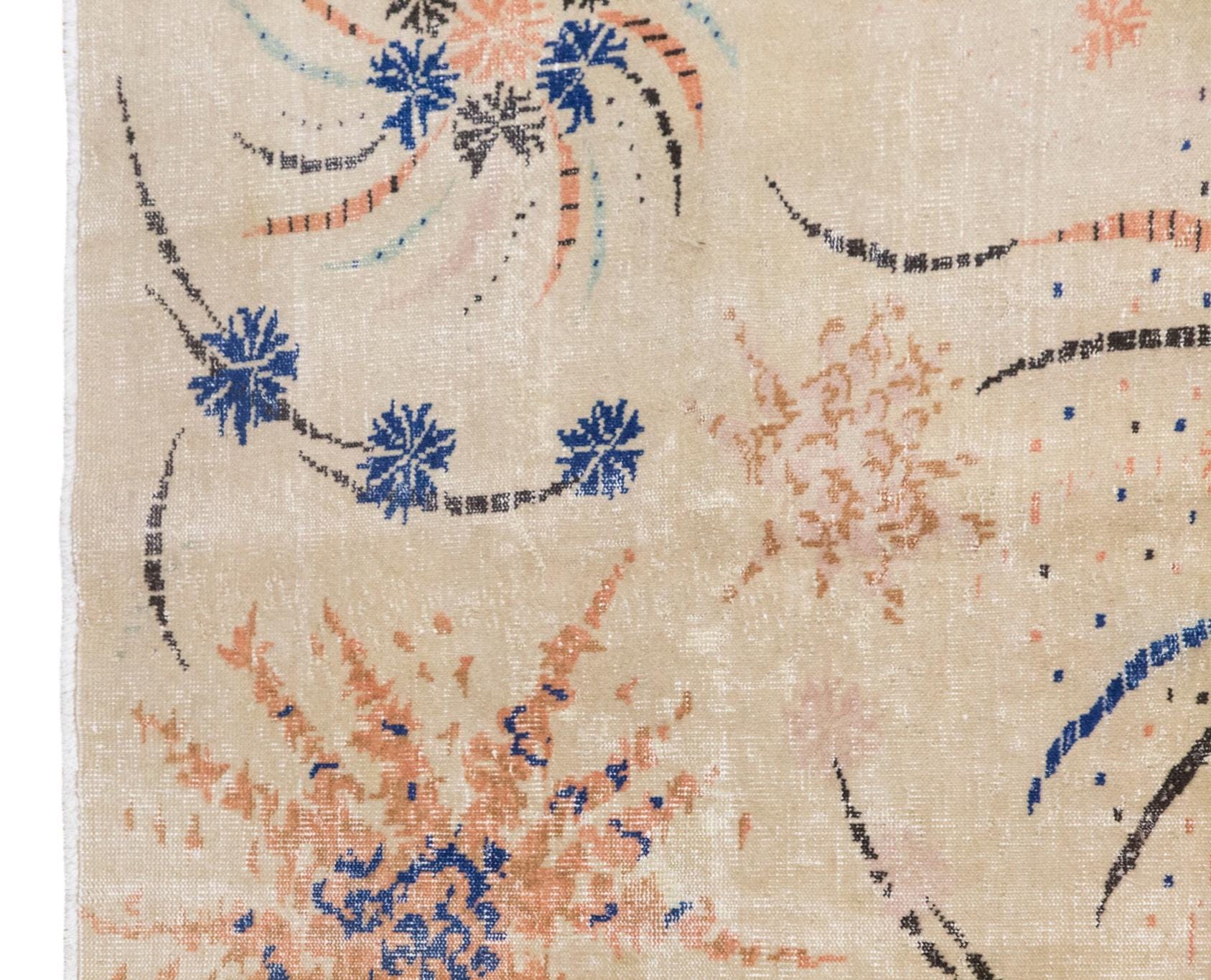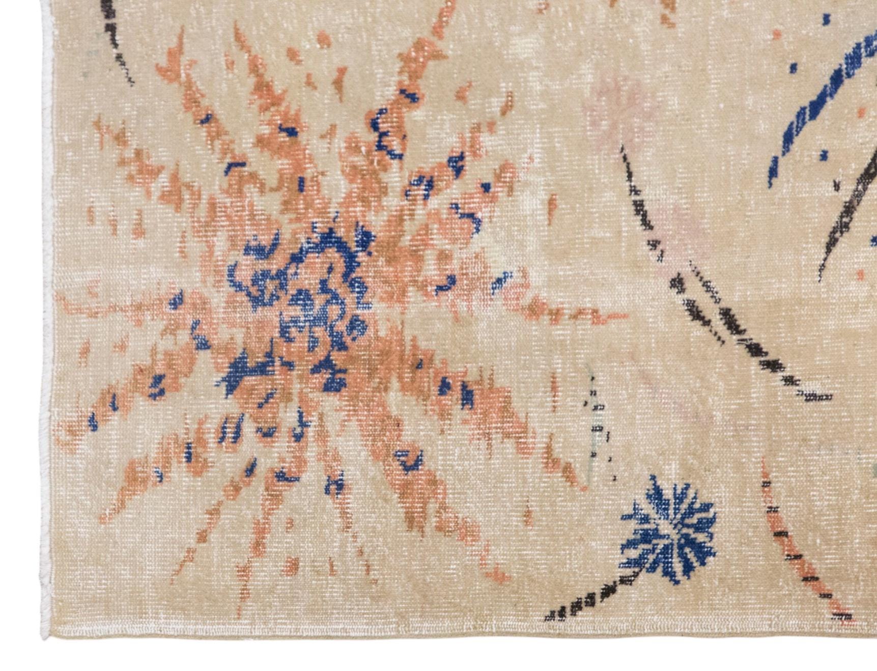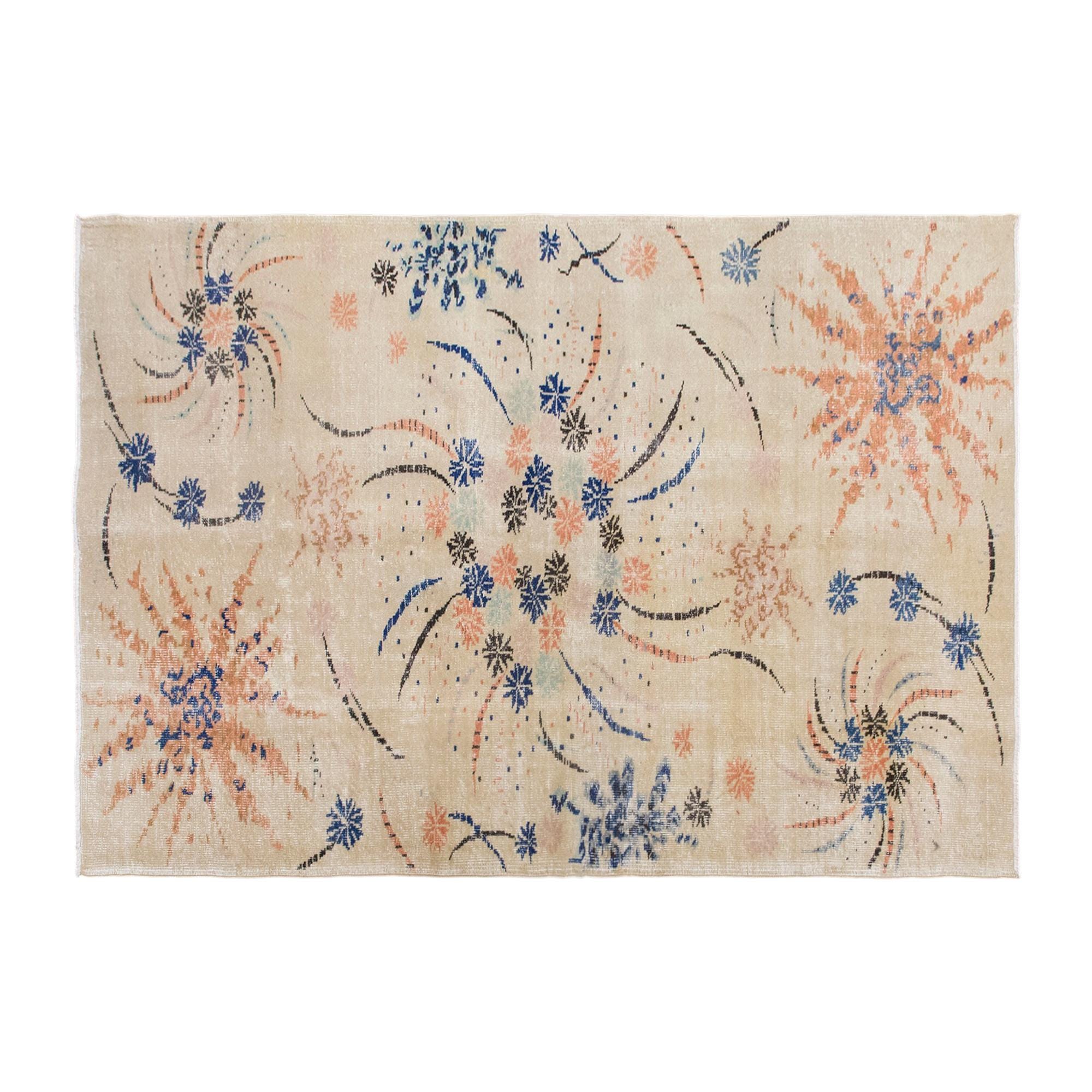 This handwoven vintage wool rug offers a distinctive and artistic presence with its soft ivory ground and expressive bursts of coral, blue, and charcoal tones. At approximately 60 years old, it feels both lively and refined, carrying the charm of a handmade textile while presenting a composition that feels surprisingly modern. Its balanced size makes it a wonderful choice for a living room, bedroom, studio, or any interior that benefits from a light and creative statement piece.