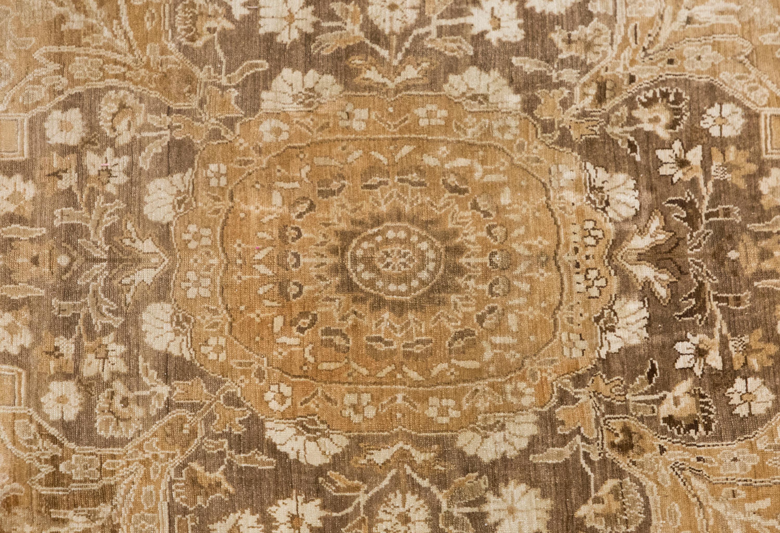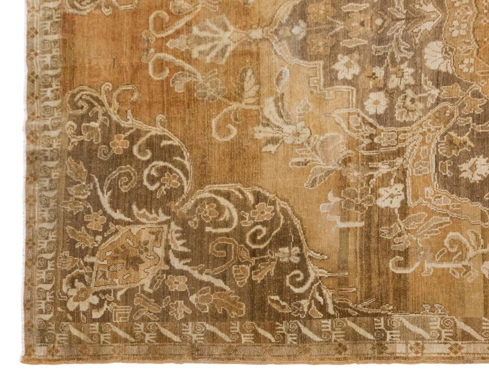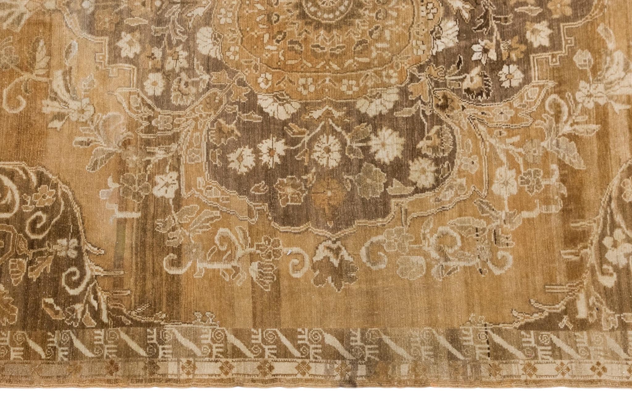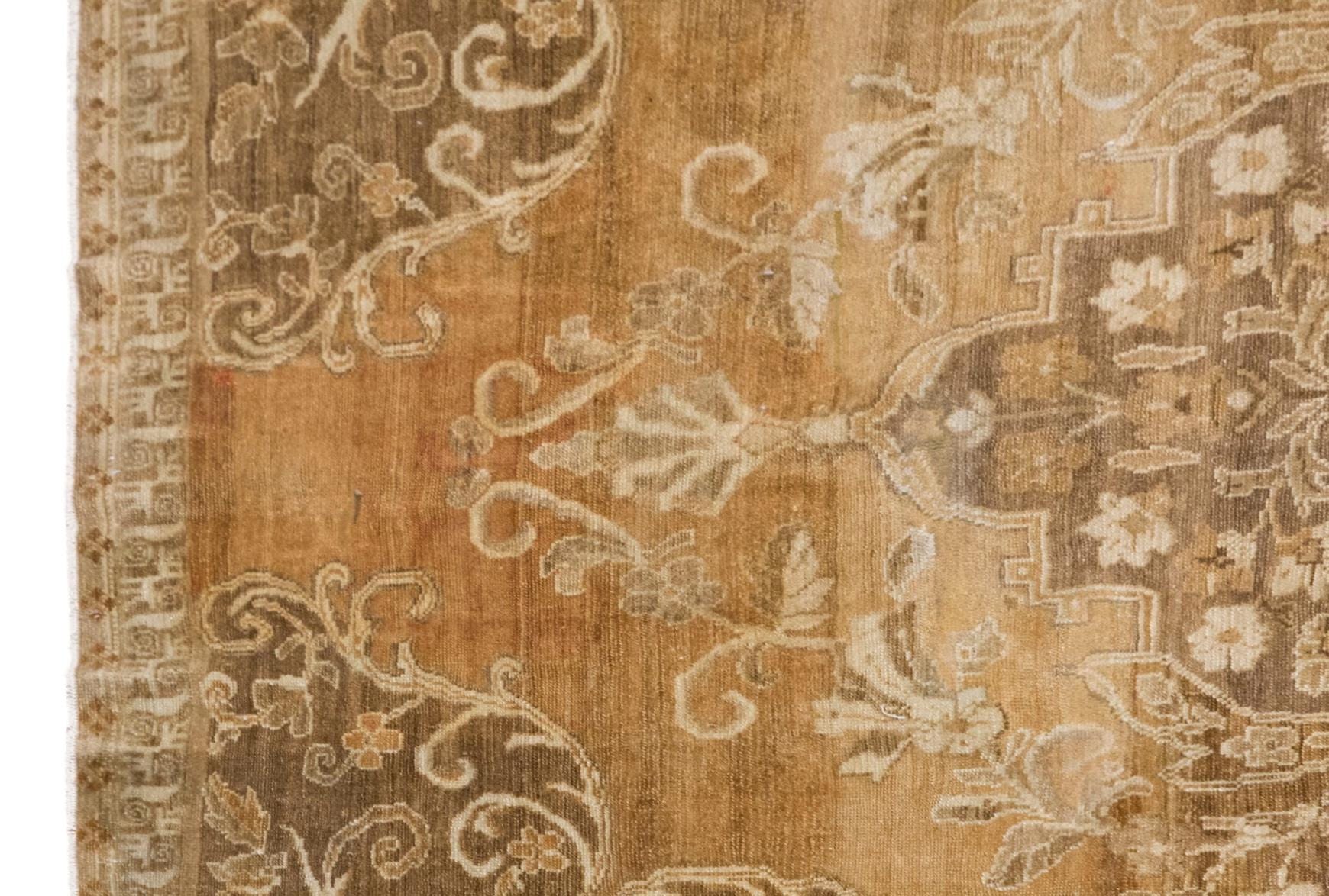 The story of its pattern feels like a quiet garden held in memory. At the center, the medallion stands like the heart of the design, holding the entire composition together with balance and grace. Around it, floral scrolls, curling leaves, and ornamental forms extend outward in a measured rhythm, almost as if vines are slowly opening across the surface. The corner motifs echo this movement, guiding the eye inward and giving the rug a sense of harmony and shelter. Because the pattern has softened over time, the design feels even more poetic; it does not appear in sharp contrast, but like an old story gently lingering beneath the surface. This fading gives the rug a subtle and atmospheric beauty, where age becomes part of the artistry itself.