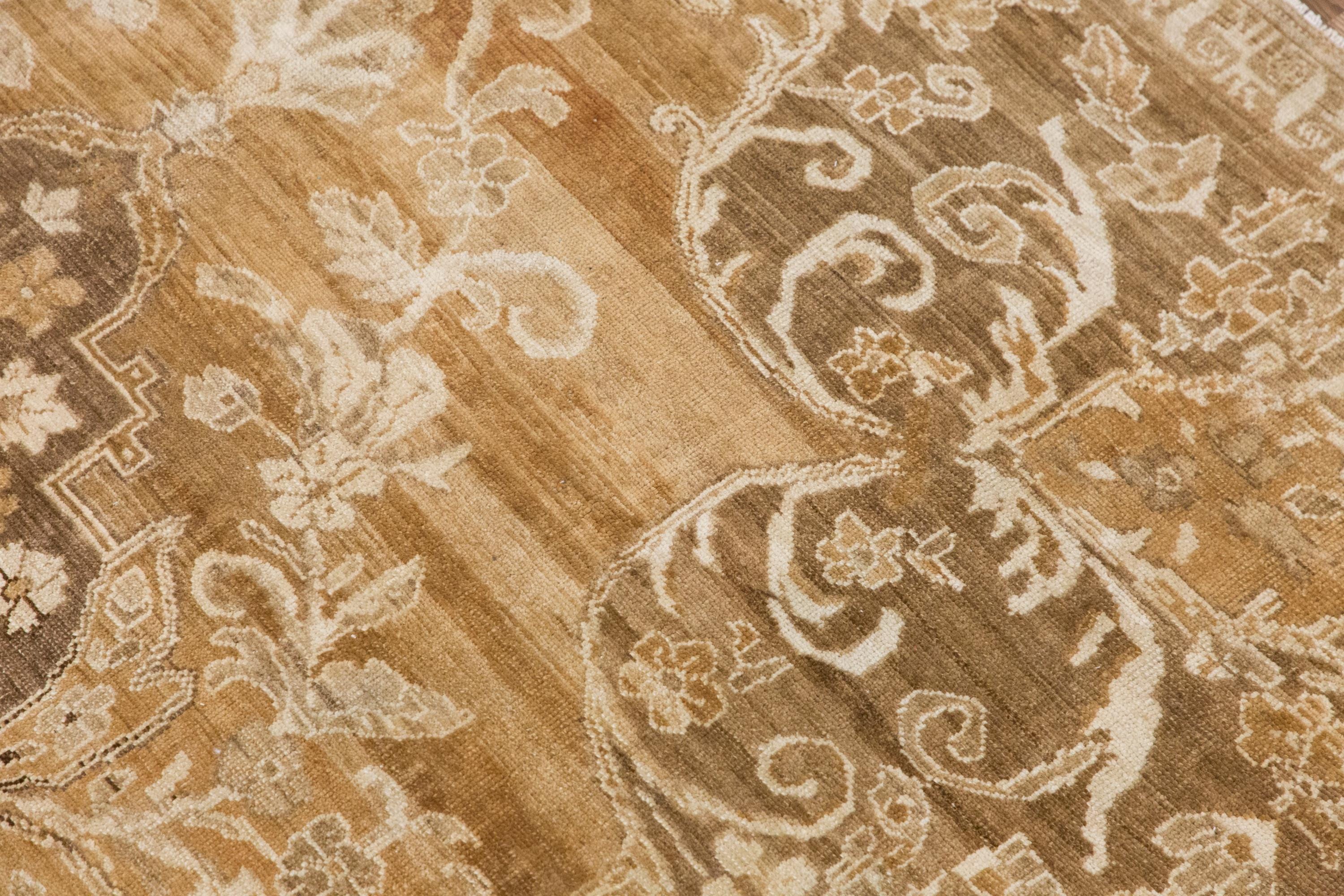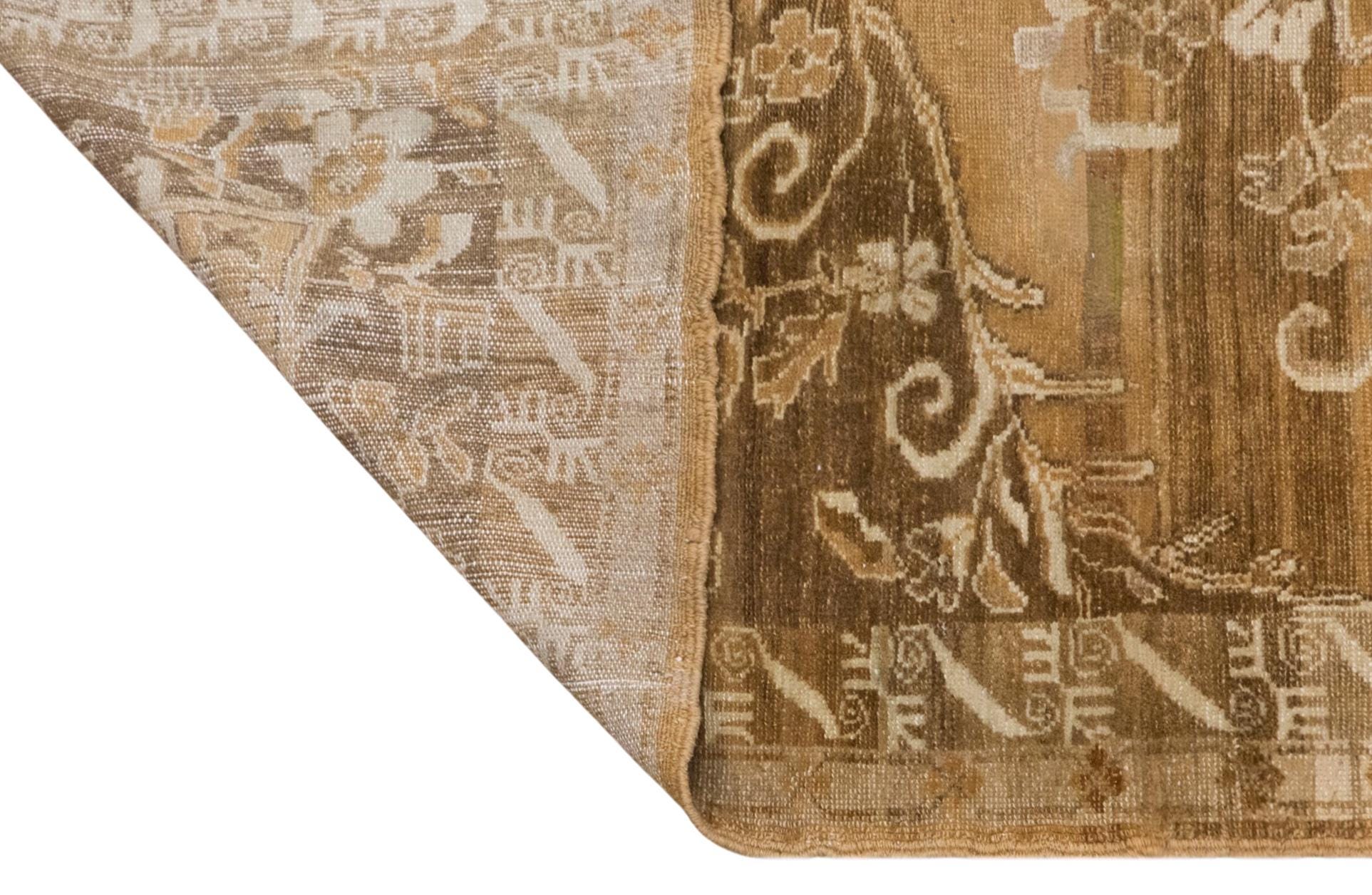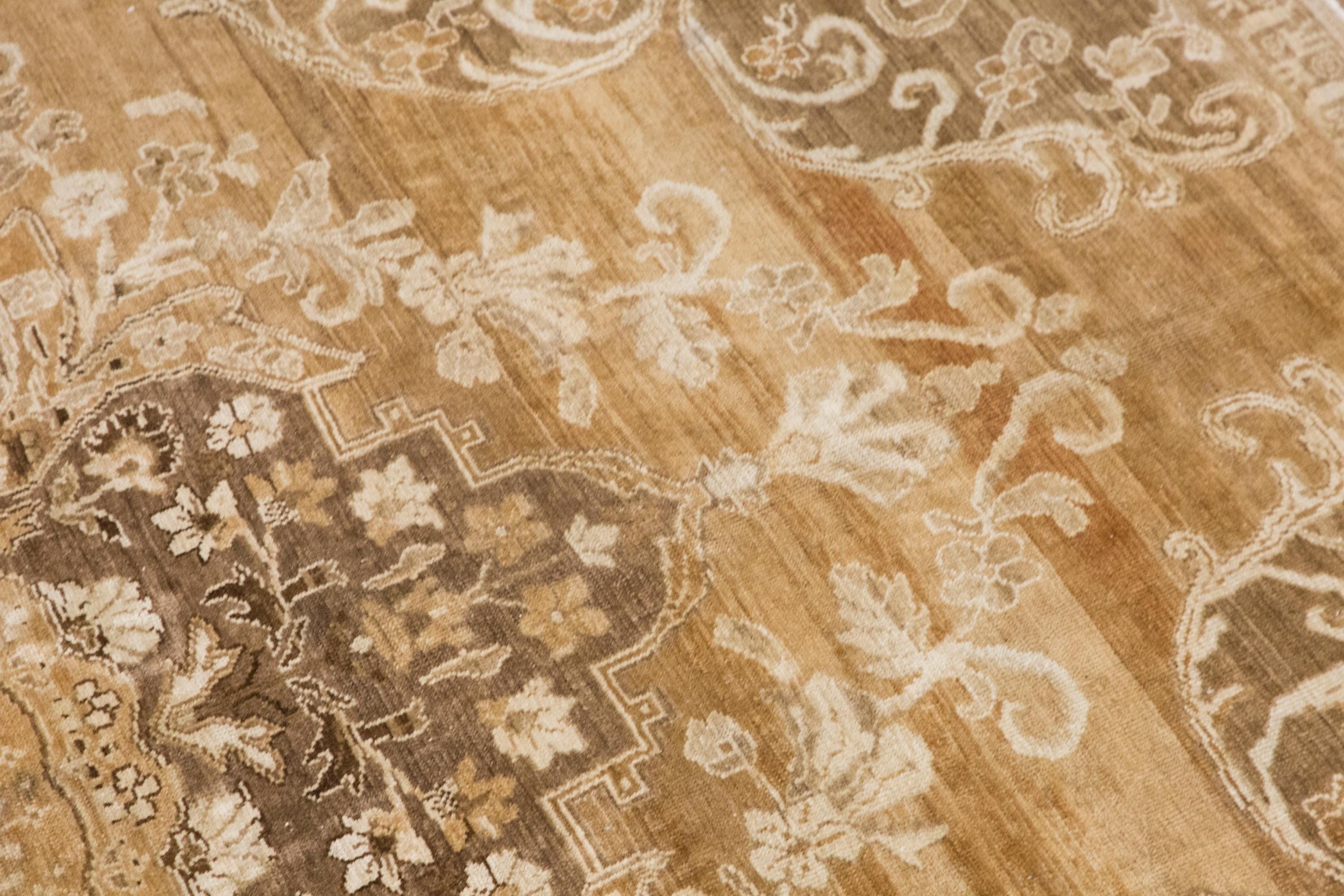 Its palette of beige, sand, warm taupe, soft brown, and faded cream makes it especially versatile for neutral, organic modern, rustic, classic, and collected interiors. From a distance, it feels serene and structured; up close, the floral details reveal the handwoven artistry and depth of the piece.