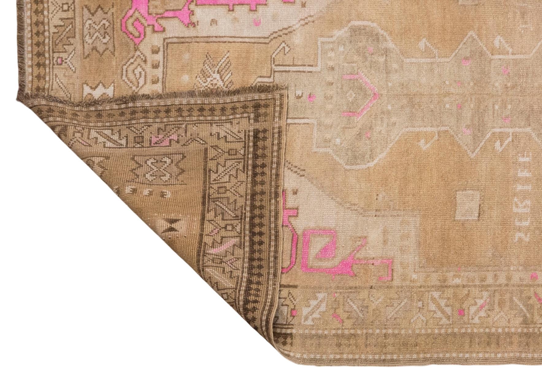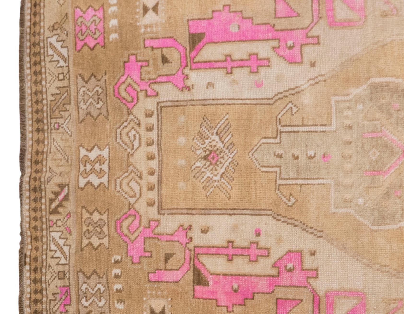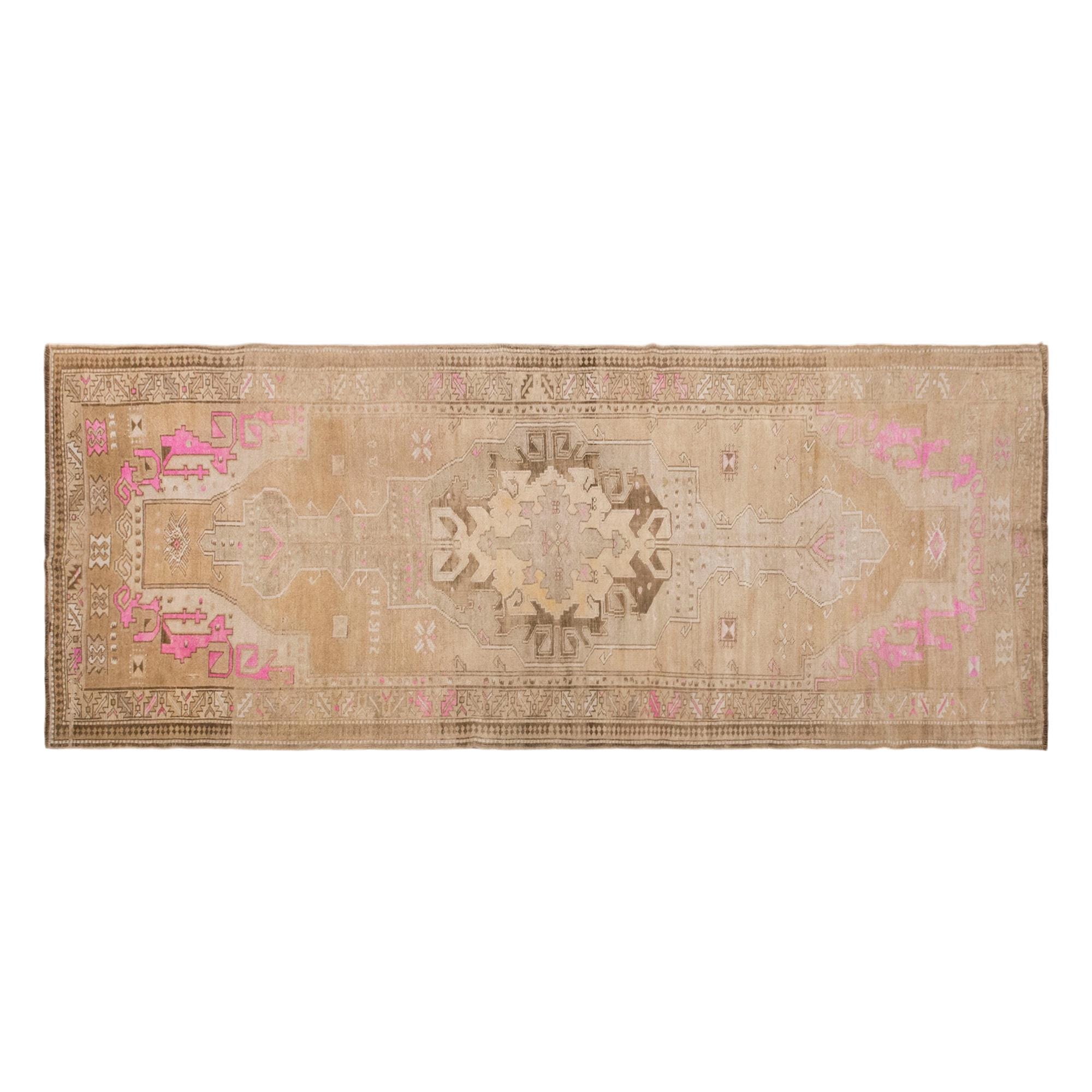 The story of its pattern feels like a quiet path of memory woven through light. At the center, the medallion anchors the design like a symbolic heart, bringing stillness and balance to the extended field. From both sides, the geometric forms stretch outward in a calm rhythm, almost like a journey unfolding toward the edges. The softly visible motifs seem to emerge rather than announce themselves, giving the runner a poetic and timeworn atmosphere. What makes this piece especially distinctive are the pink accents placed along the sides and within the border. These touches feel like gentle signs of life and joy, adding a delicate brightness to the otherwise quiet composition. Together, the medallion, borders, and softened geometric traces create a story of shelter, continuity, and grace shaped beautifully by time.
