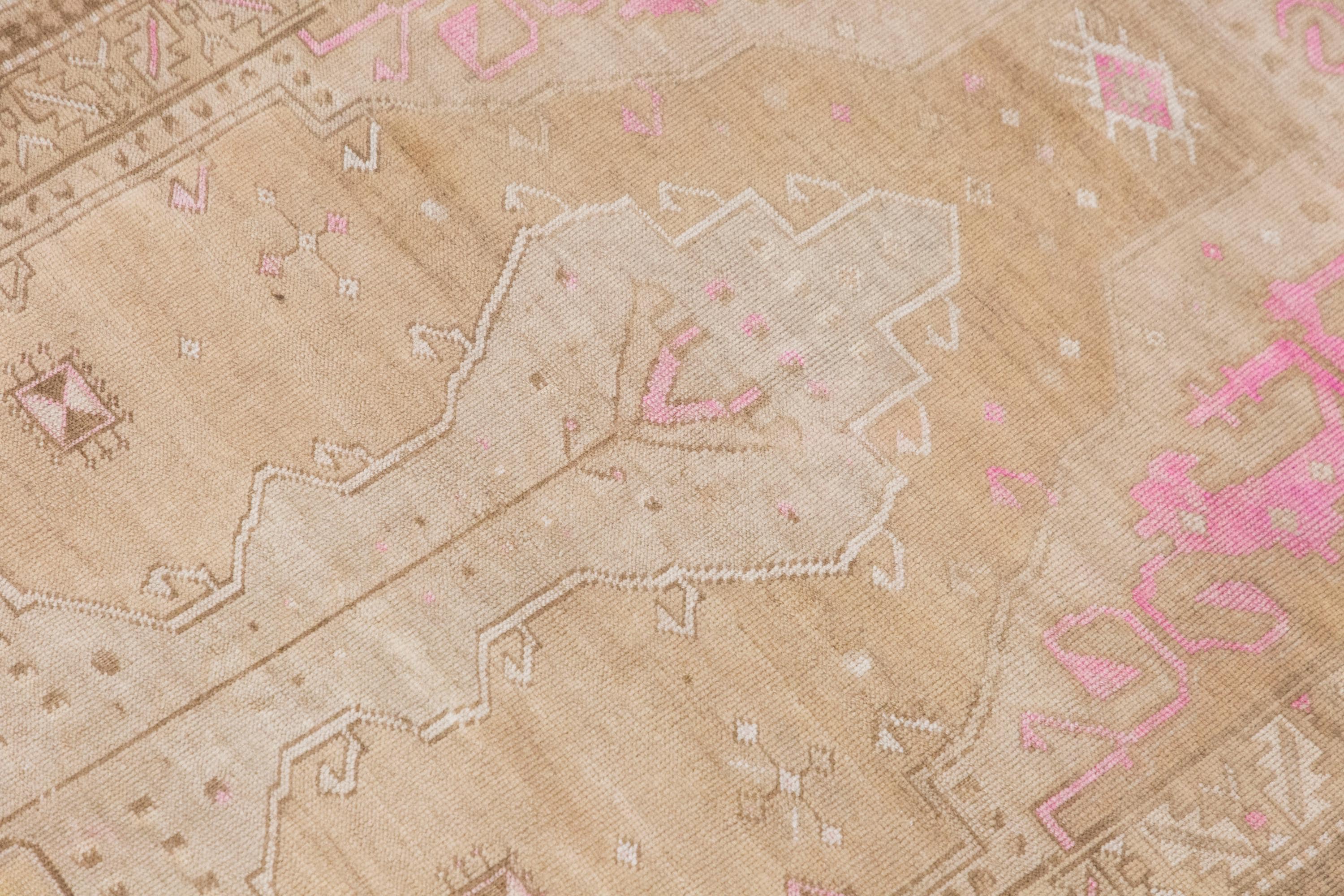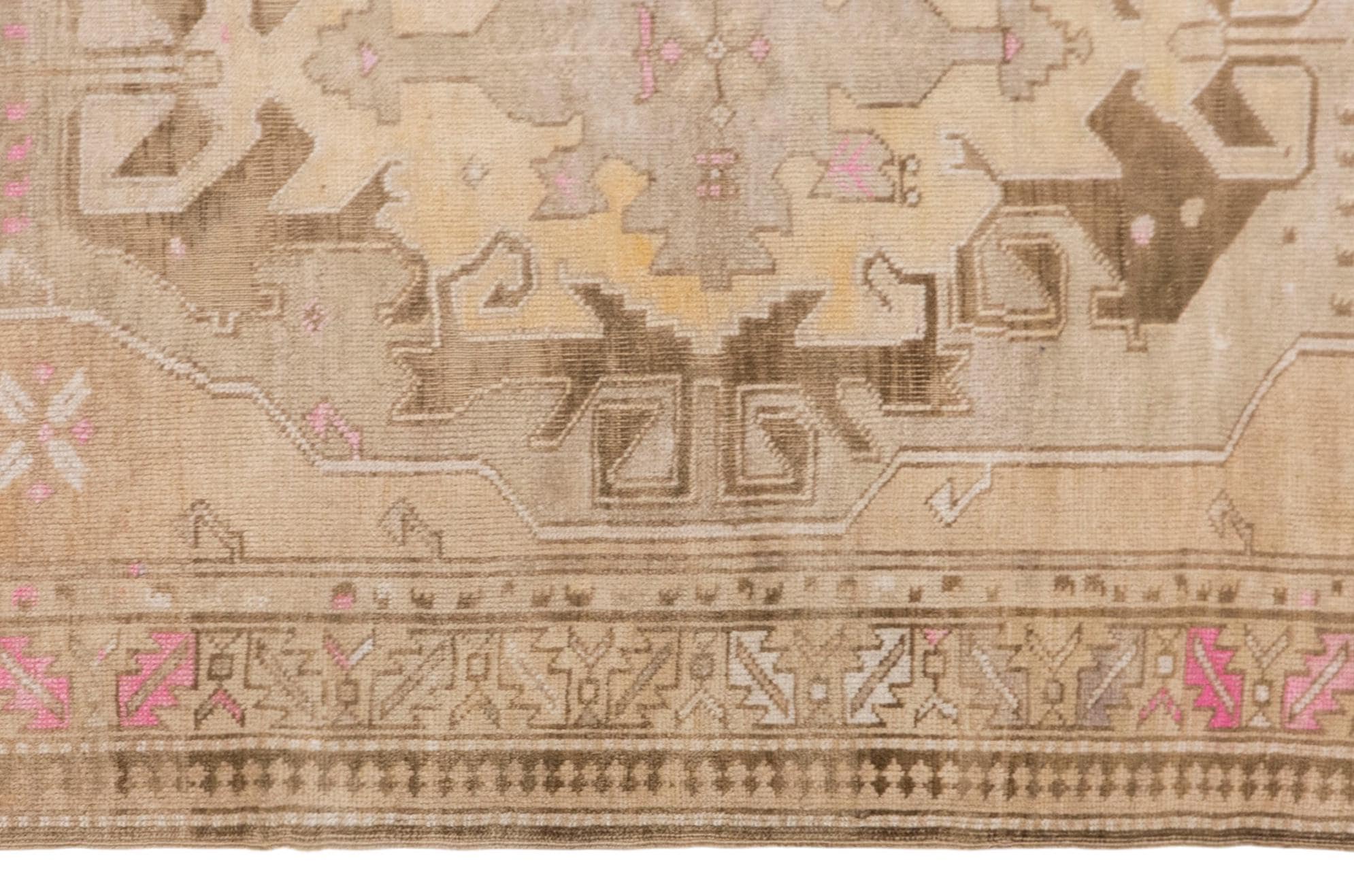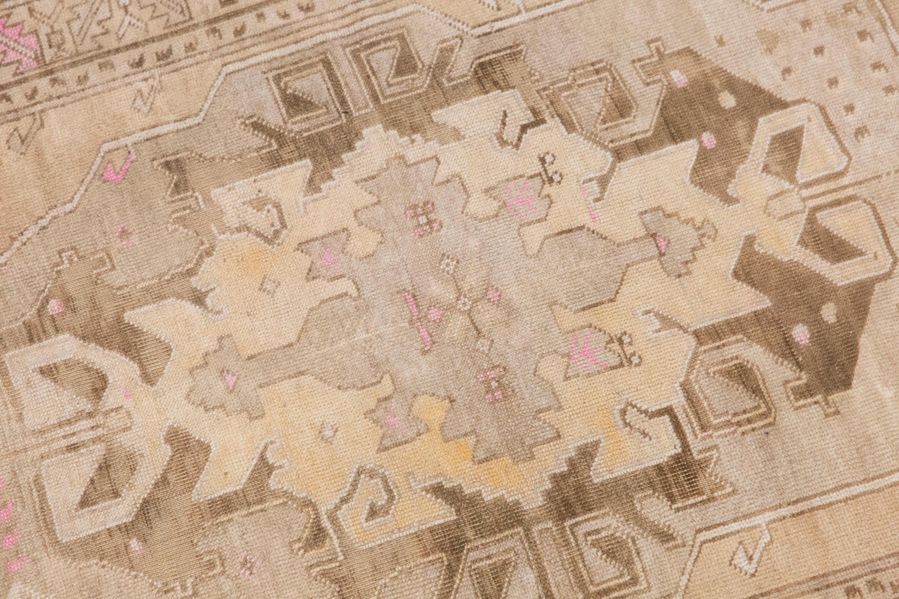 The story of its pattern feels like a quiet path of memory woven through light. At the center, the medallion anchors the design like a symbolic heart, bringing stillness and balance to the extended field. From both sides, the geometric forms stretch outward in a calm rhythm, almost like a journey unfolding toward the edges. The softly visible motifs seem to emerge rather than announce themselves, giving the runner a poetic and timeworn atmosphere. What makes this piece especially distinctive are the pink accents placed along the sides and within the border. These touches feel like gentle signs of life and joy, adding a delicate brightness to the otherwise quiet composition. Together, the medallion, borders, and softened geometric traces create a story of shelter, continuity, and grace shaped beautifully by time.