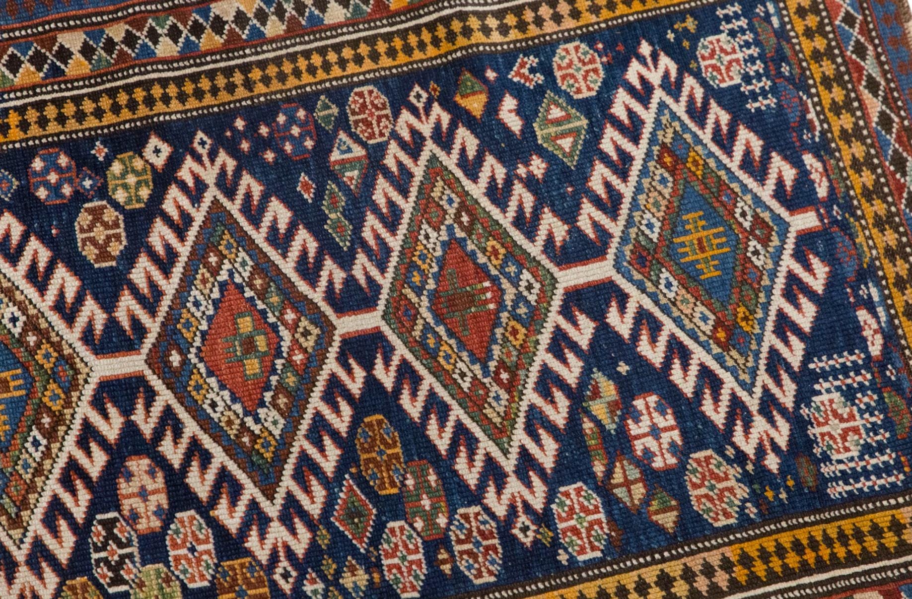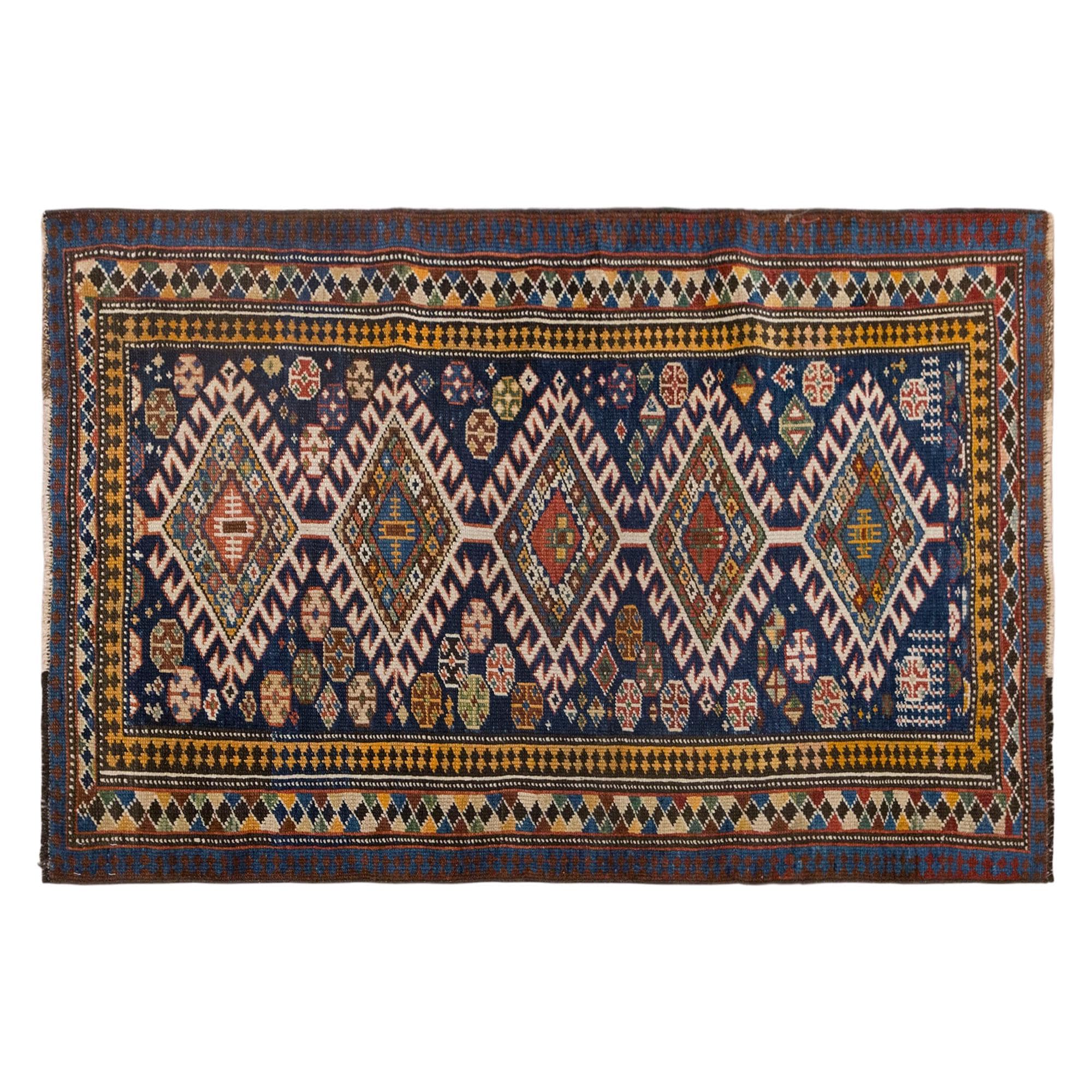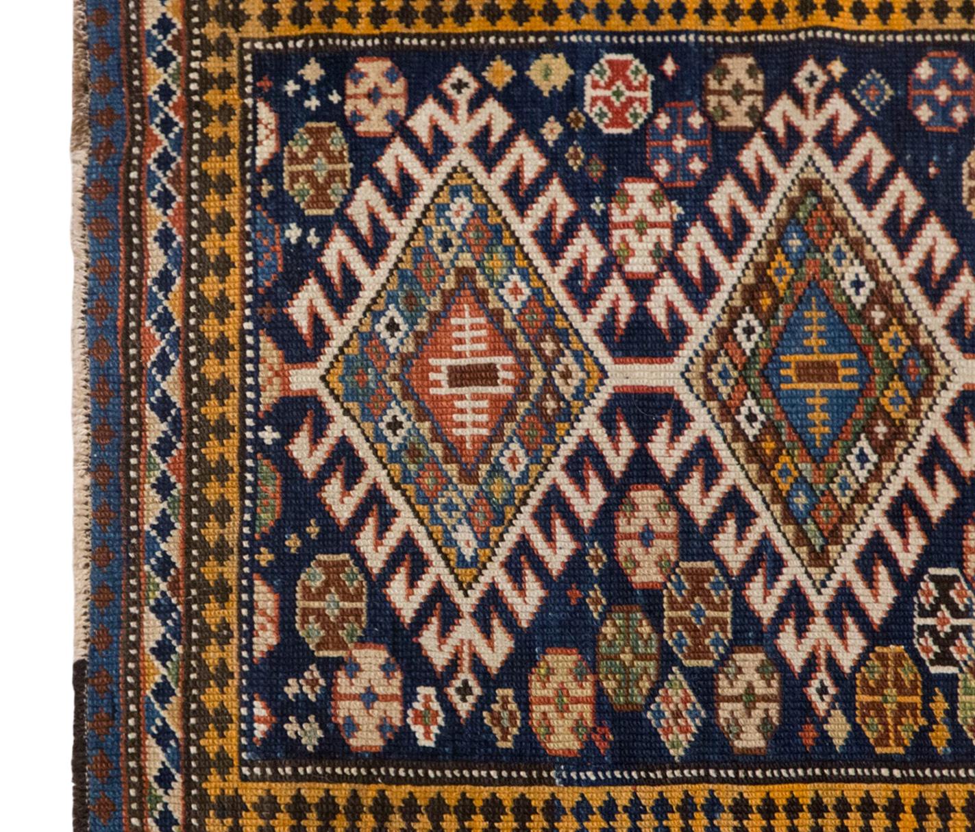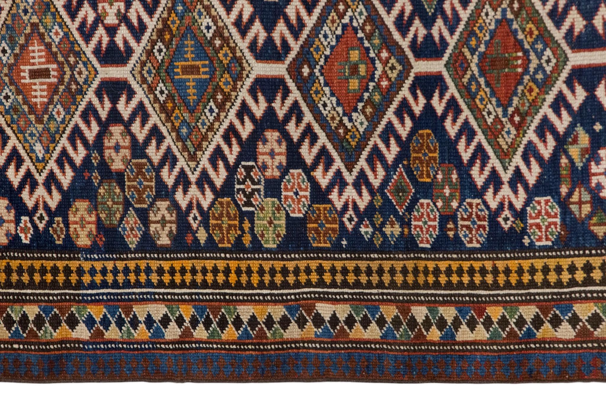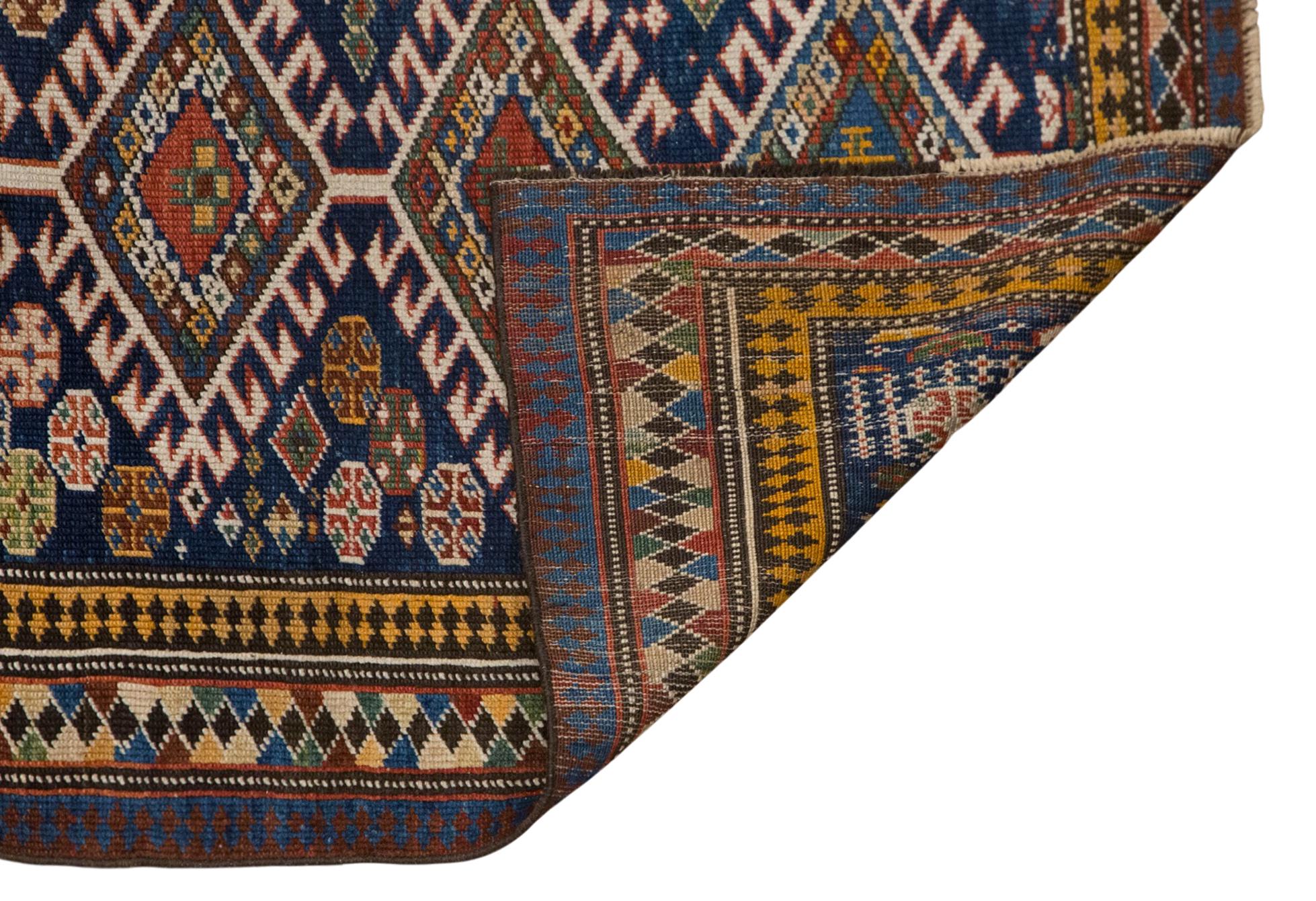 This handwoven vintage wool rug carries a vivid and distinctive character shaped by approximately 60 years of age and craftsmanship. Its deep blue field, strong diamond motifs, and richly detailed borders create a bold composition that feels both graphic and enduring. Compact in size yet full of visual presence, it is a beautiful choice for an entryway, bedside, reading corner, office, or layered living space.