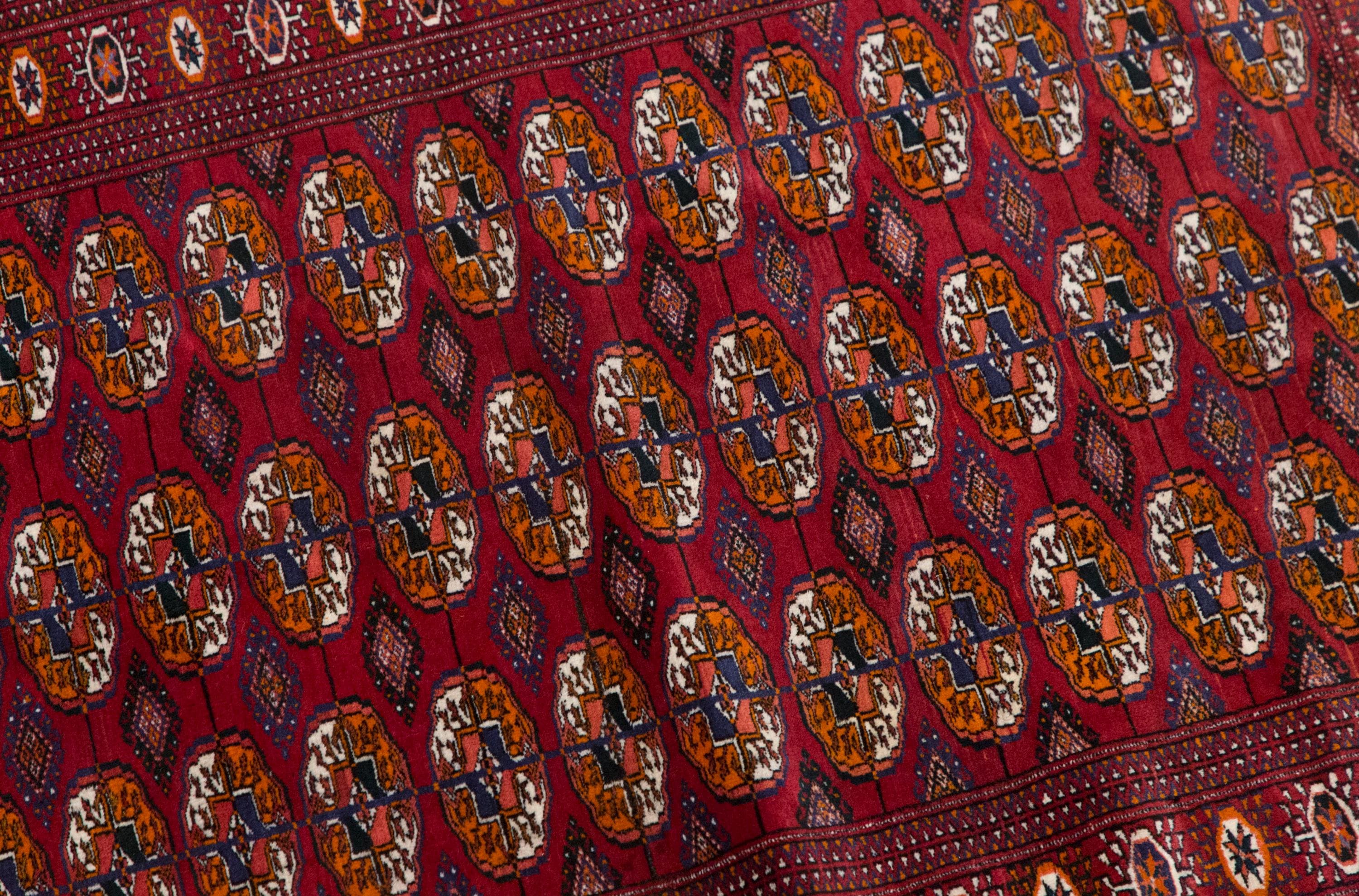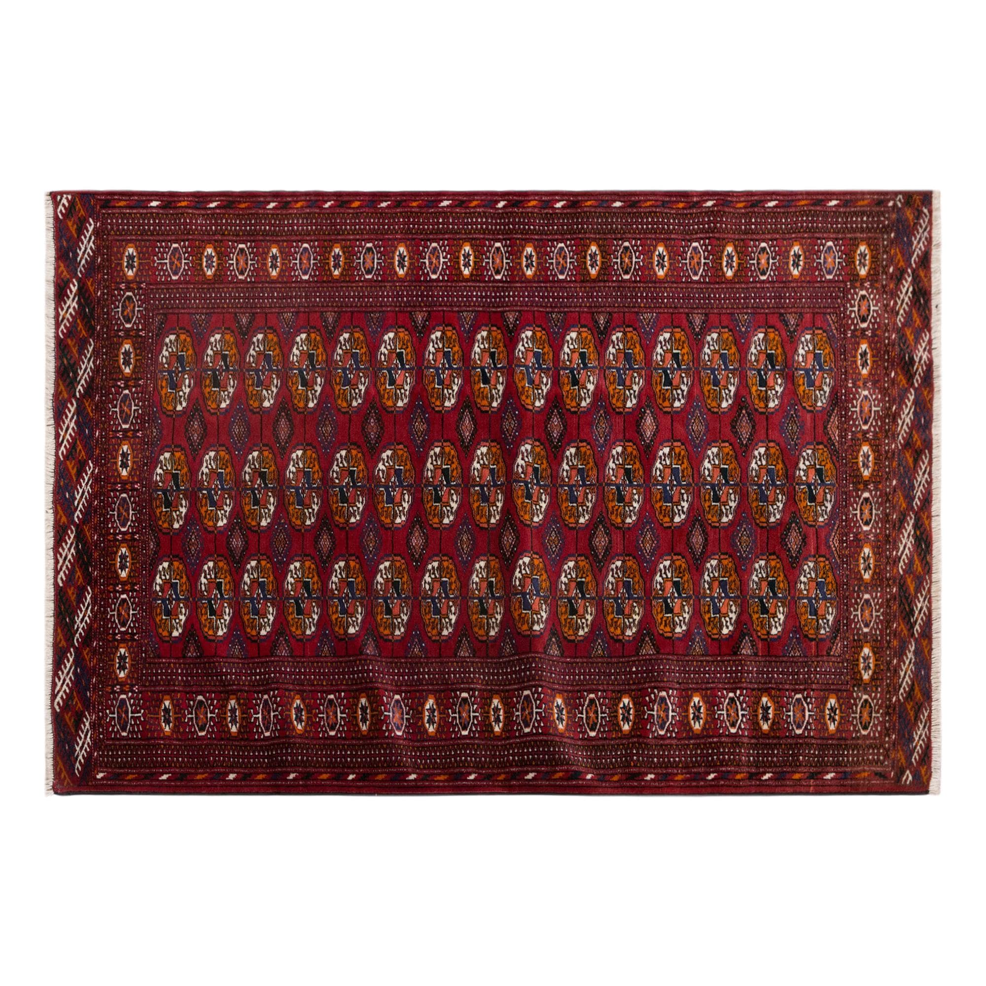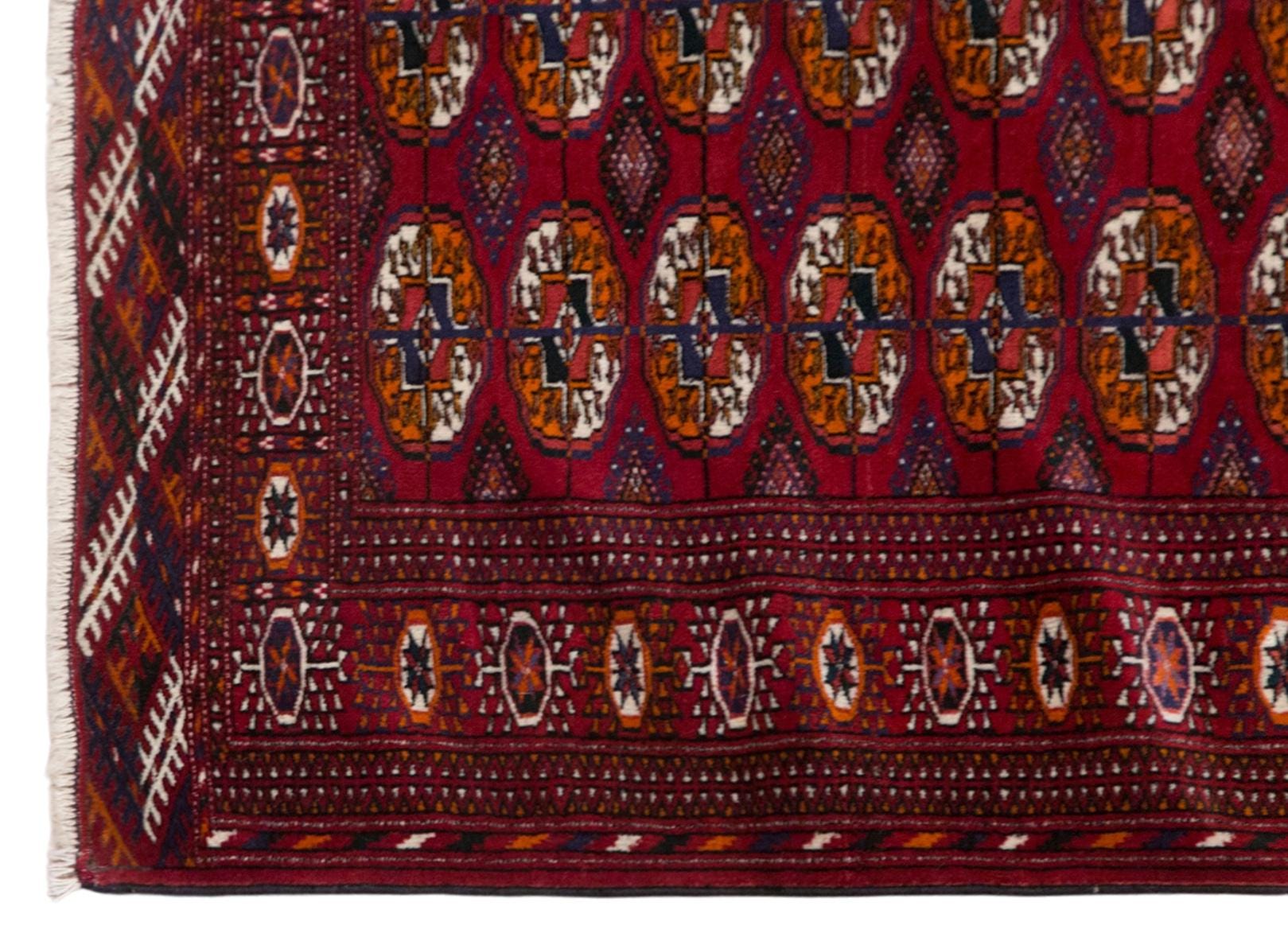 This handwoven vintage wool rug carries a warm and grounded character with its deep red field, repeating geometric medallions, and finely detailed borders. At approximately 60 years old, it reflects the richness of age and the strength of traditional craftsmanship. Its compact size makes it a beautiful choice for an entryway, bedside, reading corner, office, or layered living space.