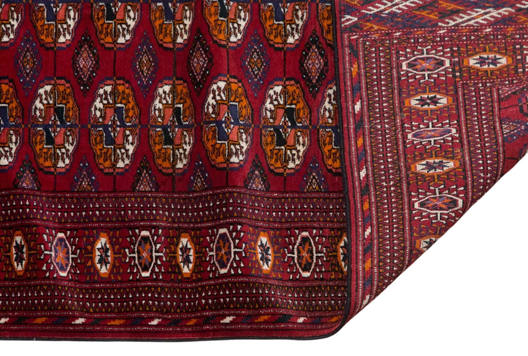 Its palette of deep red, burgundy, rust, ivory, and dark navy gives the piece a bold yet timeless presence. From a distance, it feels strong and graphic; up close, the intricate details reveal the care and artistry of the hand that made it. This is the kind of rug that brings both warmth and structure to a room without losing its authentic vintage character.