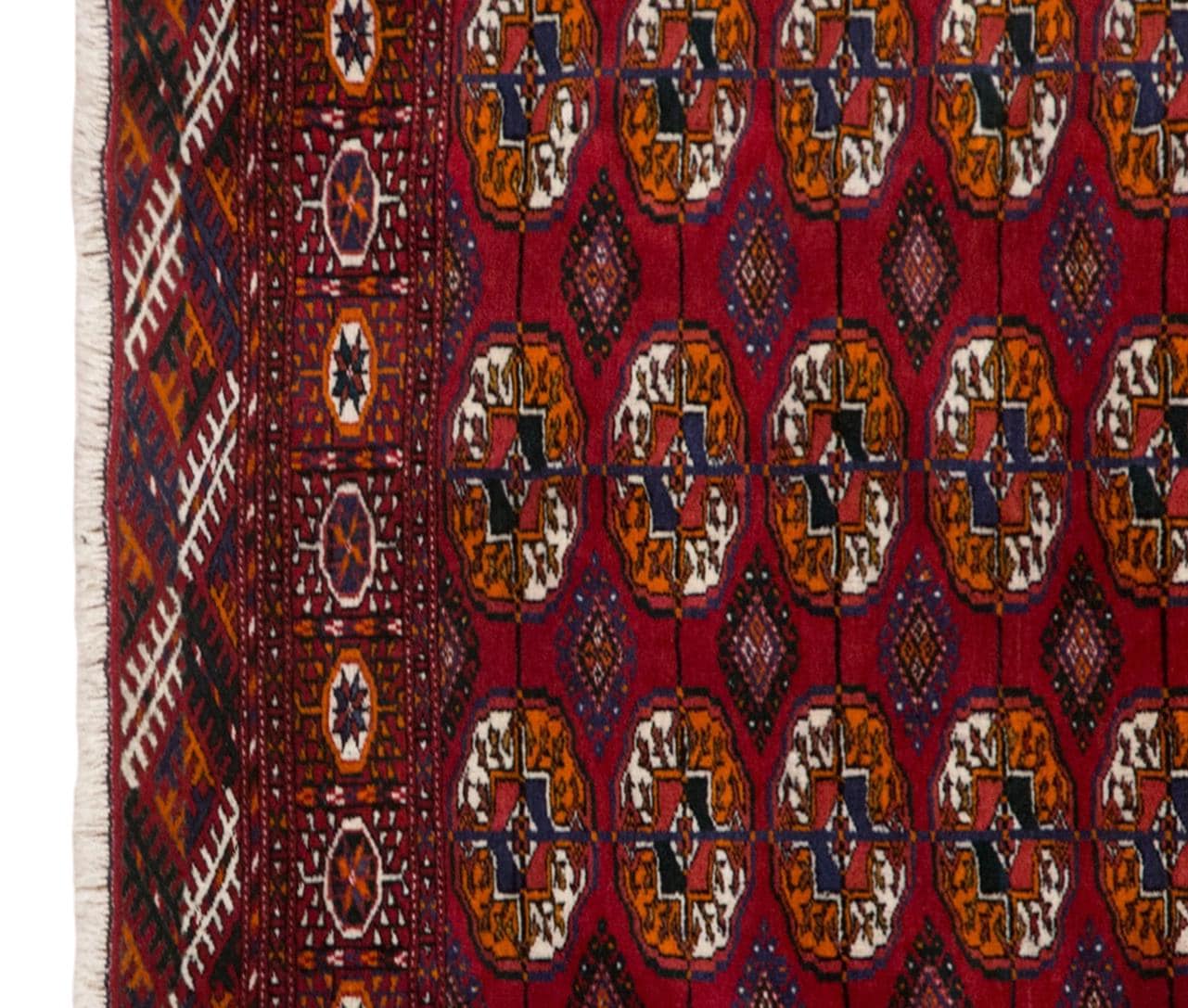 The story of its pattern feels rhythmic, structured, and deeply symbolic. The repeating oval medallions across the field create a steady visual cadence, almost like a sequence of protective marks woven one after another. These motifs give the rug a sense of order and continuity, as if each symbol is quietly guarding the next. Between them, the smaller diamond forms introduce movement and tension, keeping the composition lively and balanced. The layered borders reinforce this feeling even more, framing the center like a protective edge around the woven story within. Altogether, the design suggests endurance, harmony, and a quiet strength carried through generations.