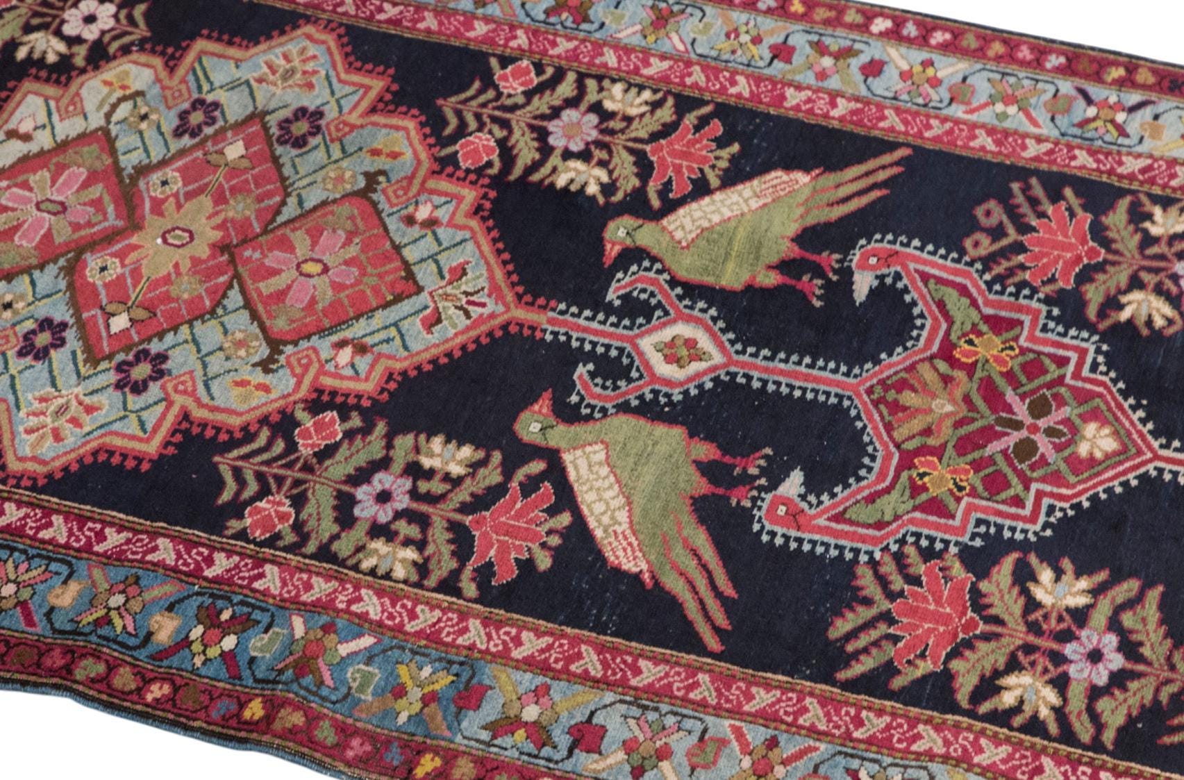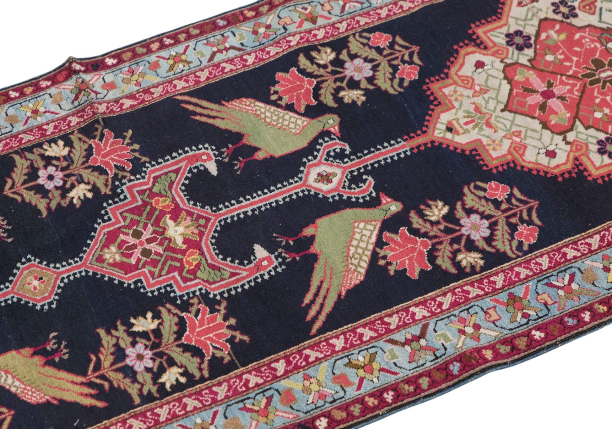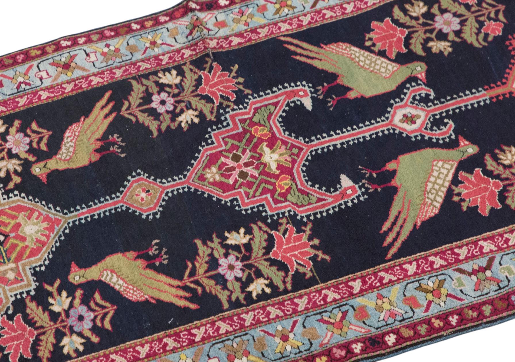 Its rich palette of navy, brick red, soft blue, ivory, and gentle earth tones gives the runner a timeless presence. The contrast between the dark field and the detailed motifs allows each element to stand out beautifully, making the design feel bold from a distance and intricate up close.