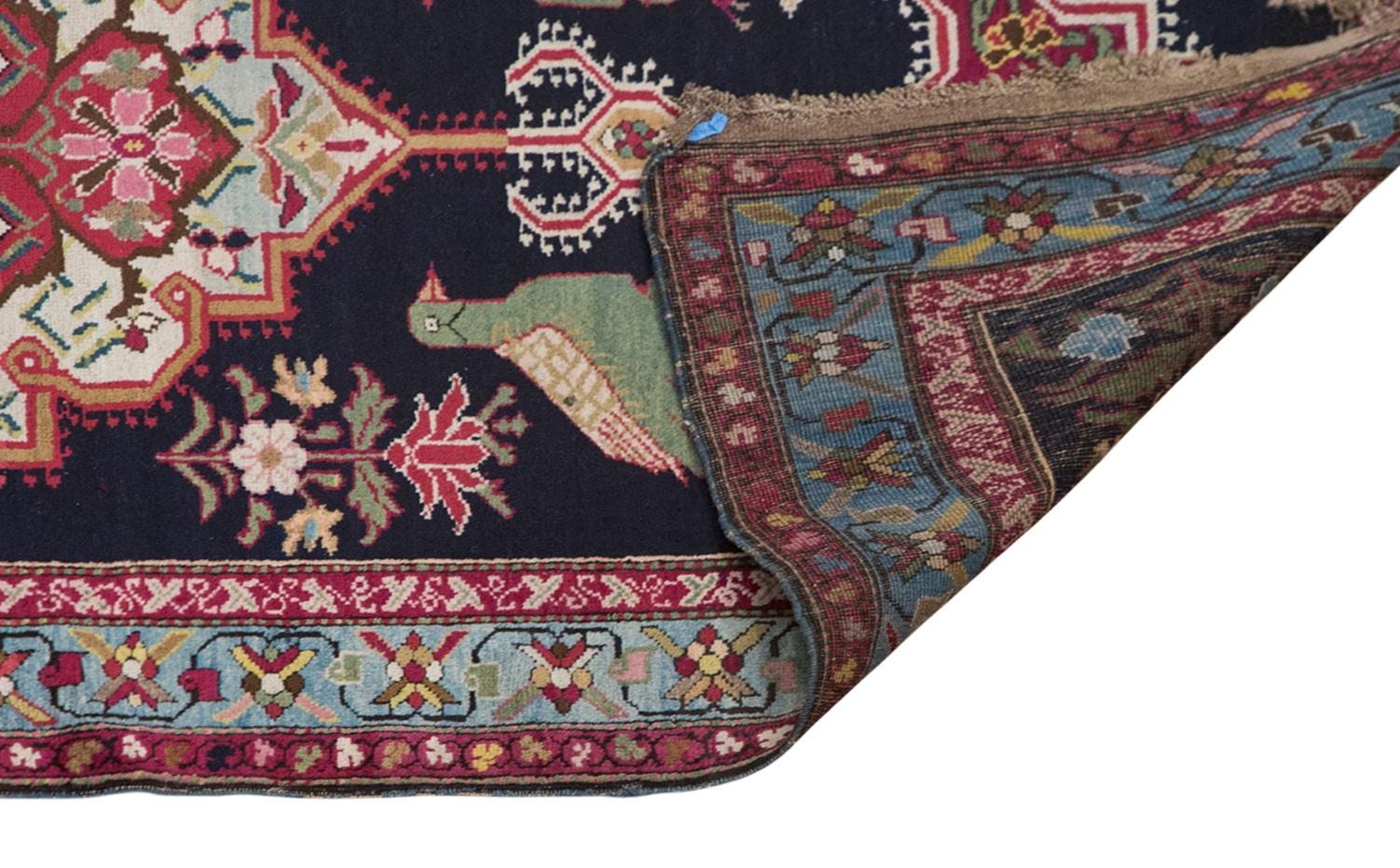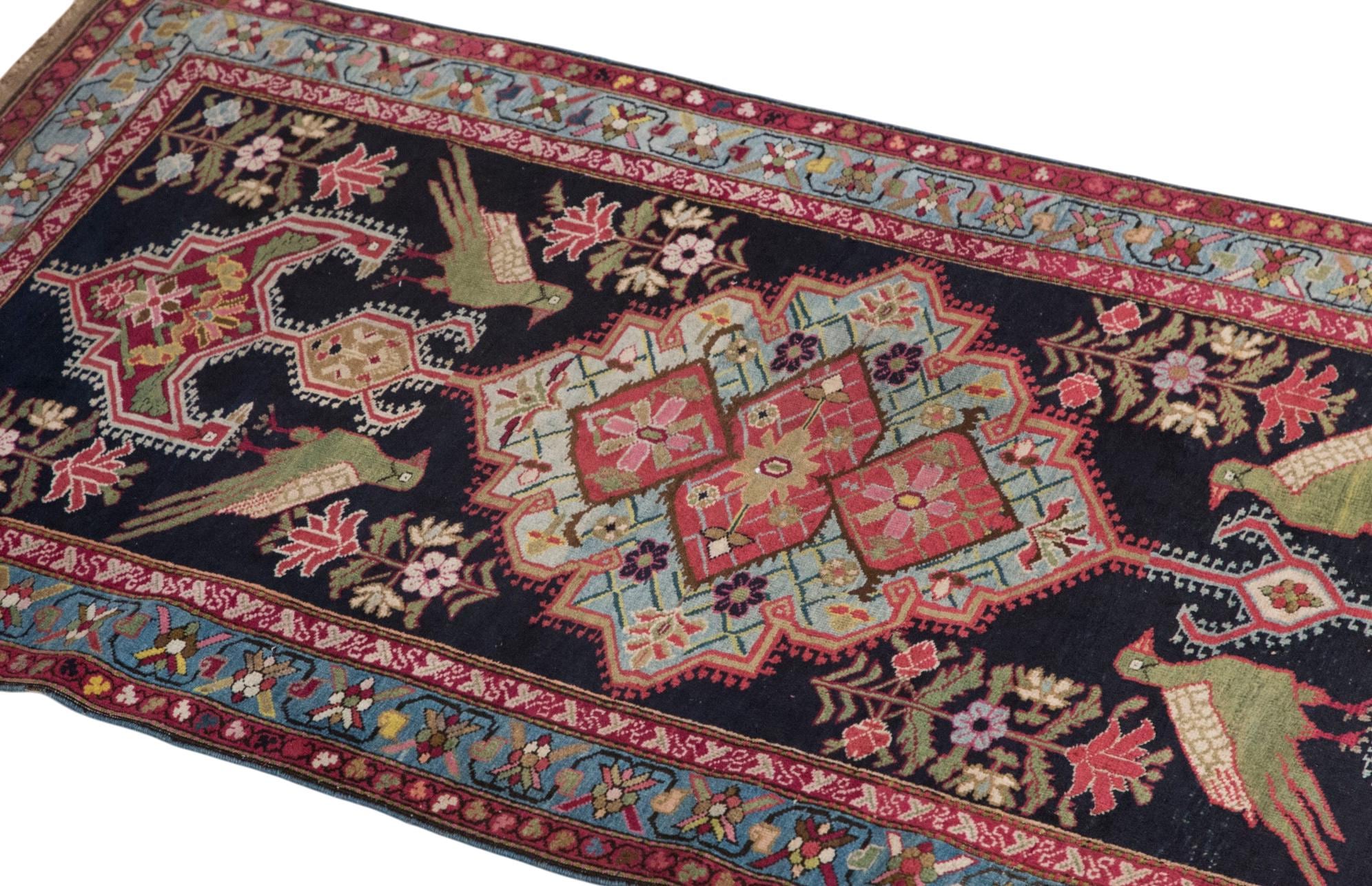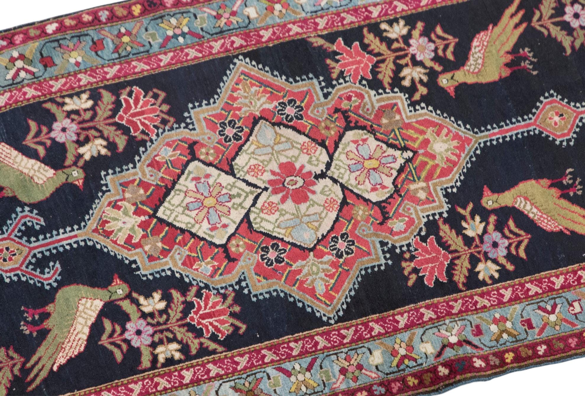 Its rich palette of navy, brick red, soft blue, ivory, and gentle earth tones gives the runner a timeless presence. The contrast between the dark field and the detailed motifs allows each element to stand out beautifully, making the design feel bold from a distance and intricate up close.