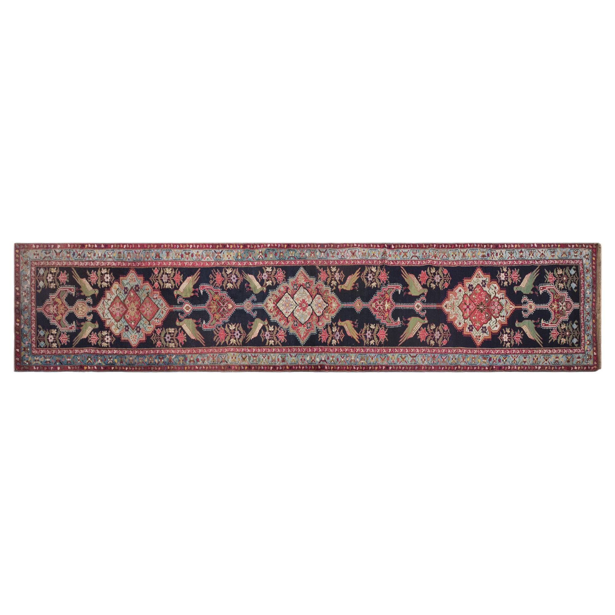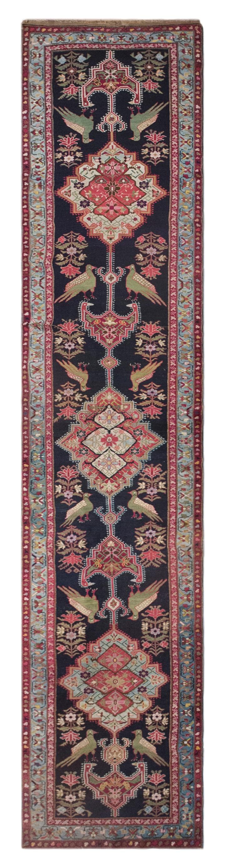 This striking handwoven wool runner carries the elegance of time through its long and rhythmic composition. With its deep dark field, intricate border work, and repeating medallions, it brings a strong decorative presence while still feeling refined and balanced. At approximately 60 years old, this piece offers both character and craftsmanship, making it an excellent choice for a hallway, entryway, gallery-like corridor, or any long interior space that calls for warmth and visual depth.